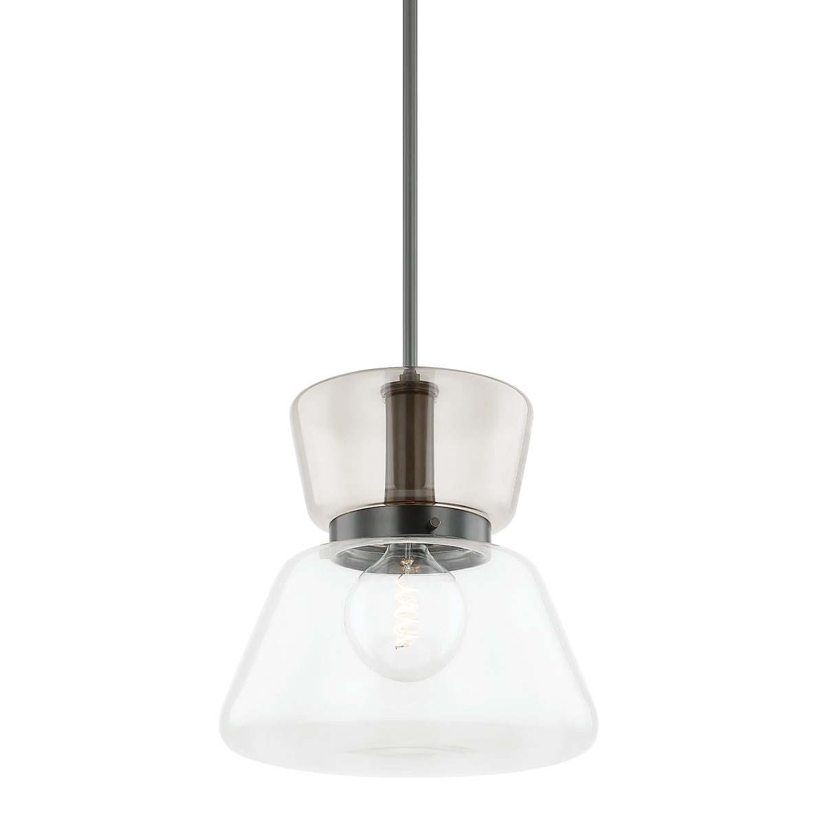 Contrasting glass shades and a sleek metal frame define the asymmetric hourglass silhouette of Elodie. This totemic pendant owes its graphic quality to the juxtaposition of clear and light bronze-plated glass forms. The choice between Aged Brass or True Bronze finishes allows you to lean into a more classic or industrial aesthetic. Whether suspended above countertops, in a living room, or at a bedside, Elodie sets the mood in style.