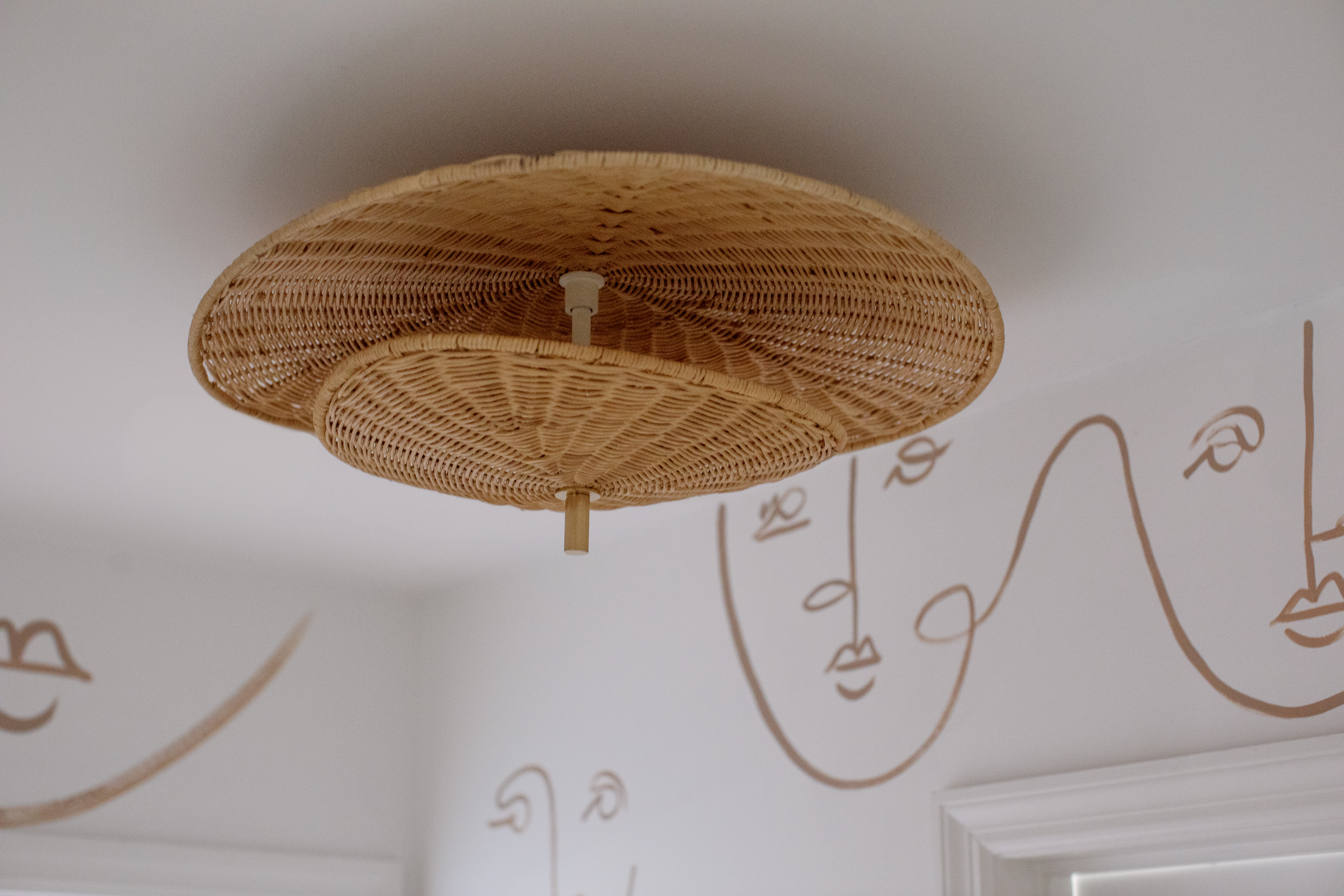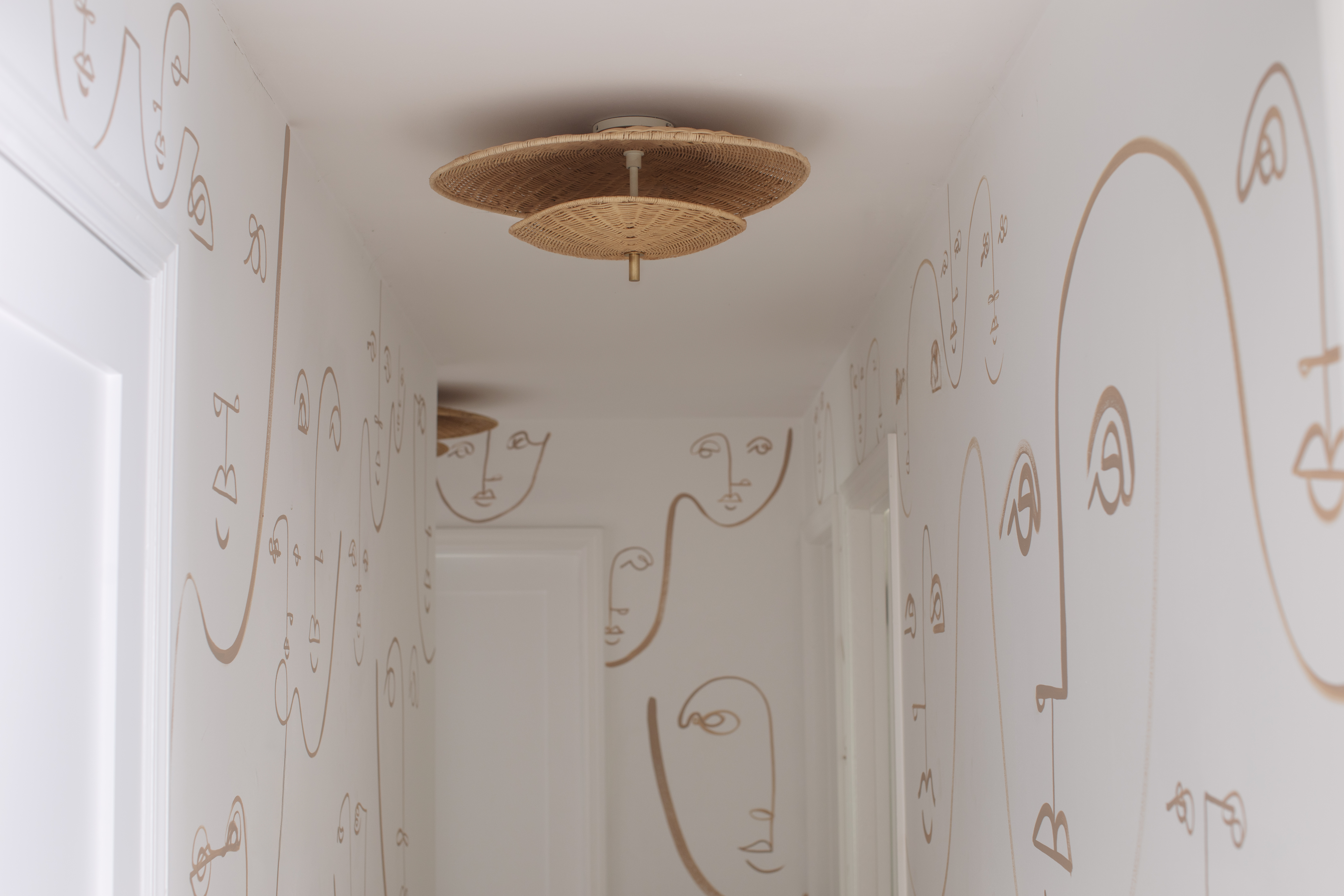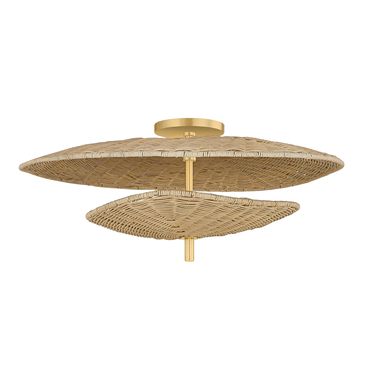 Two softly triangular shades are layered to create this organic-inspired flush mount. A glow emanates from the space between the shades, filtering through the warm natural rattan wicker. An Aged Brass rod pierces through the fixture, creating a sleek point of contrast to the floaty forms. Part of our Megan Molten x Mitzi Tastemakers collection.