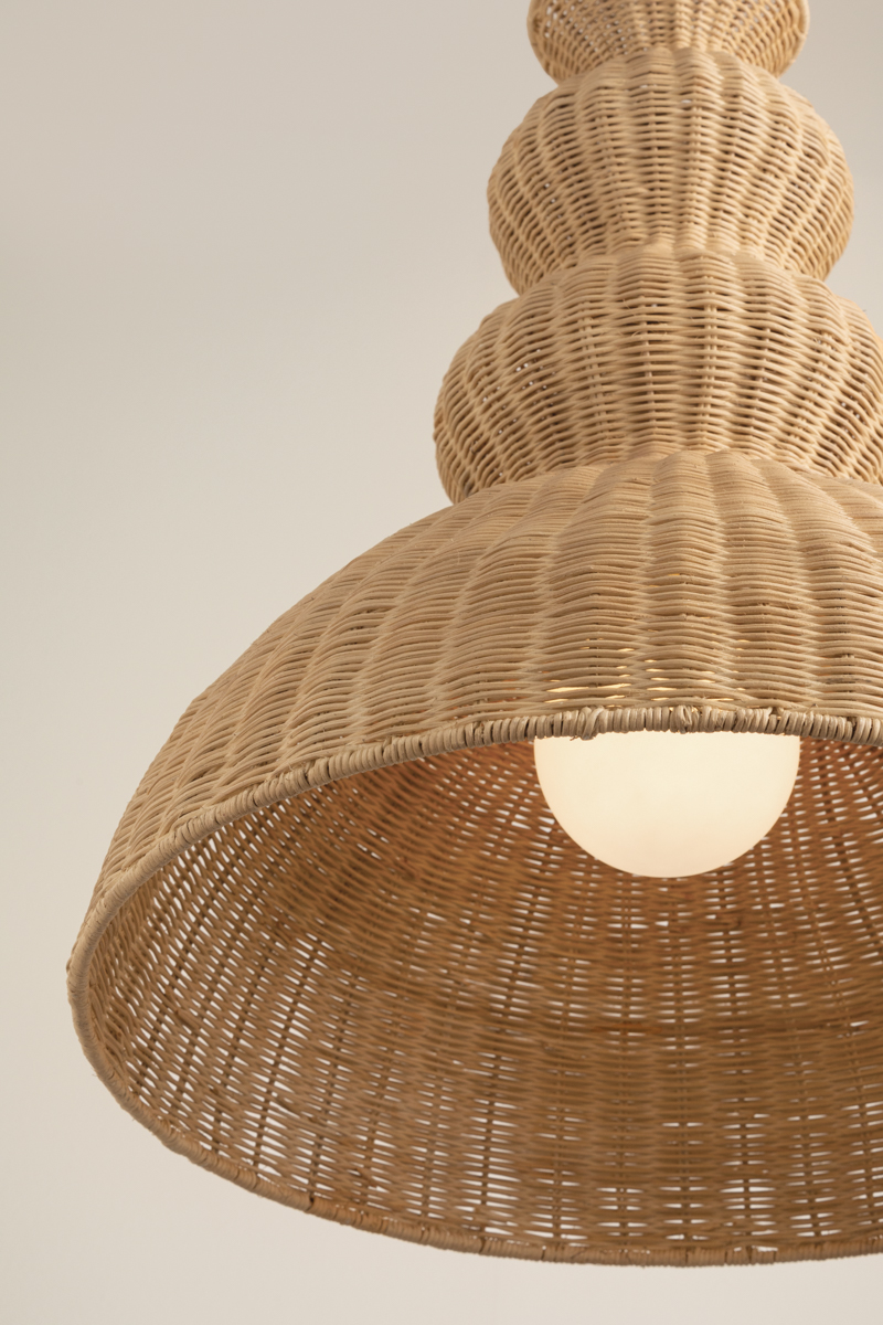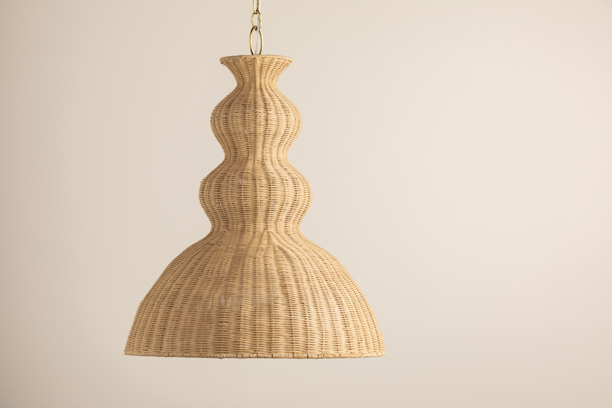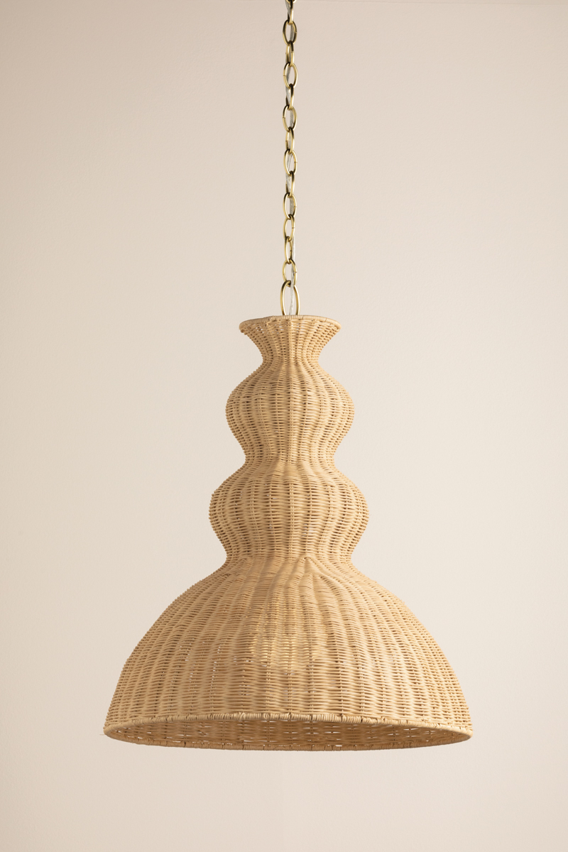 Inspired by the movement of rippling water, the shapely silhouette of Mayla blends craftsmanship with a coastal touch. Light filters softly through the woven rattan wicker shade, which comes in two sizes. Suspended by an Aged Brass chain, this pendant makes for an eye-catching addition to living and dining rooms. Part of our Megan Molten x Mitzi Tastemakers collection.
