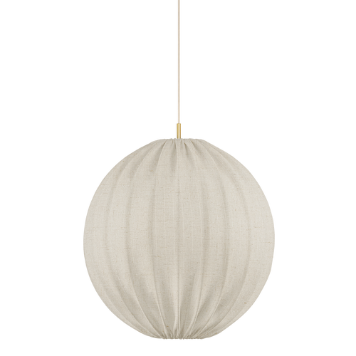 An elevated kitchen basic, Catrine is characterized by uncomplicated forms, industrial design details, and a refreshing blend of materials. This pendant features a large globe suspended by an oversized pin and loop, finished in Aged Brass. To soften the clean lines, grass cloth wraps around the pin, introducing a natural element to the modern silhouette.