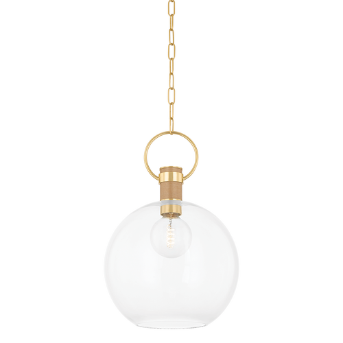 An elevated kitchen basic, Catrine is characterized by uncomplicated forms, industrial design details, and a refreshing blend of materials. This pendant features a large globe suspended by an oversized pin and loop, finished in Aged Brass. To soften the clean lines, grass cloth wraps around the pin, introducing a natural element to the modern silhouette.