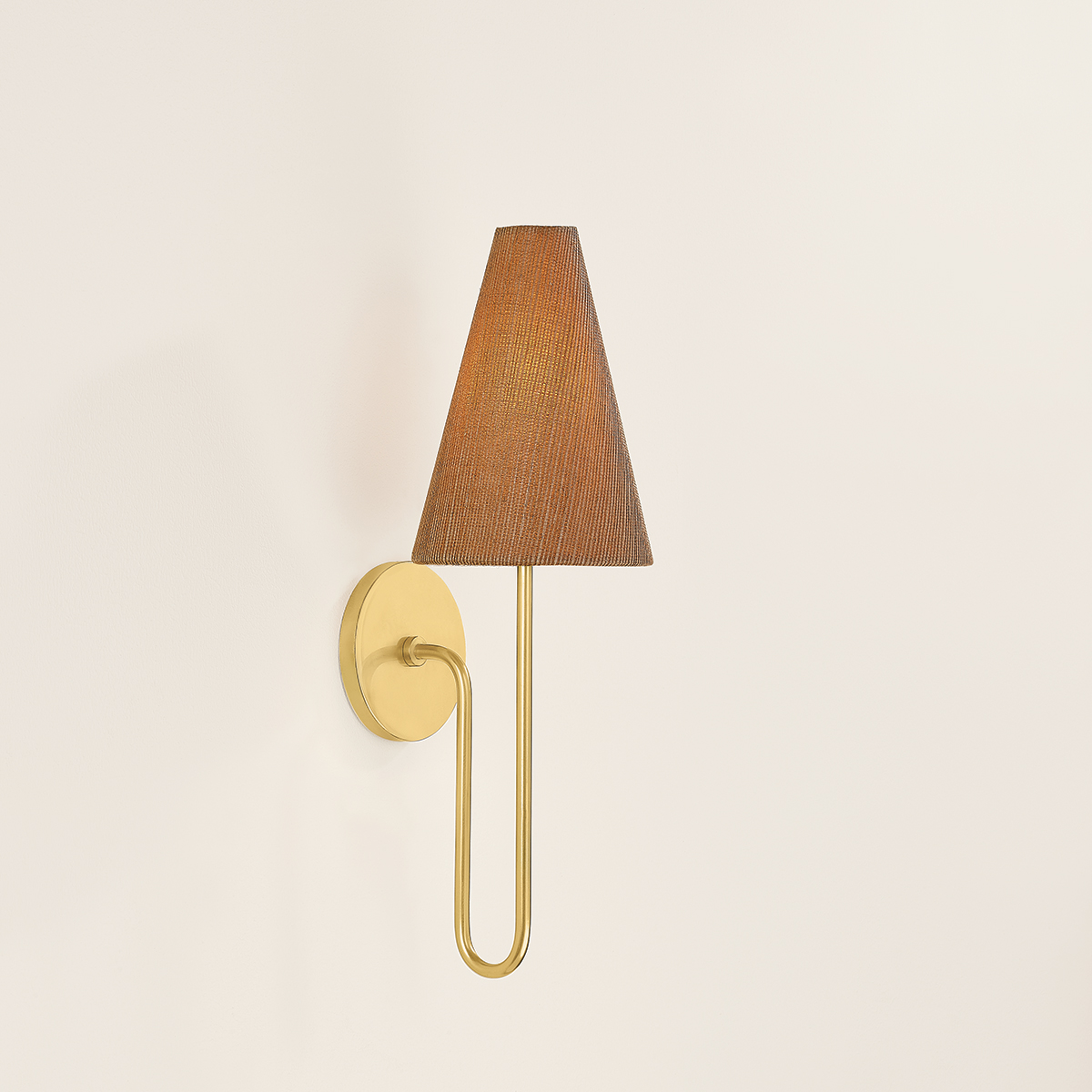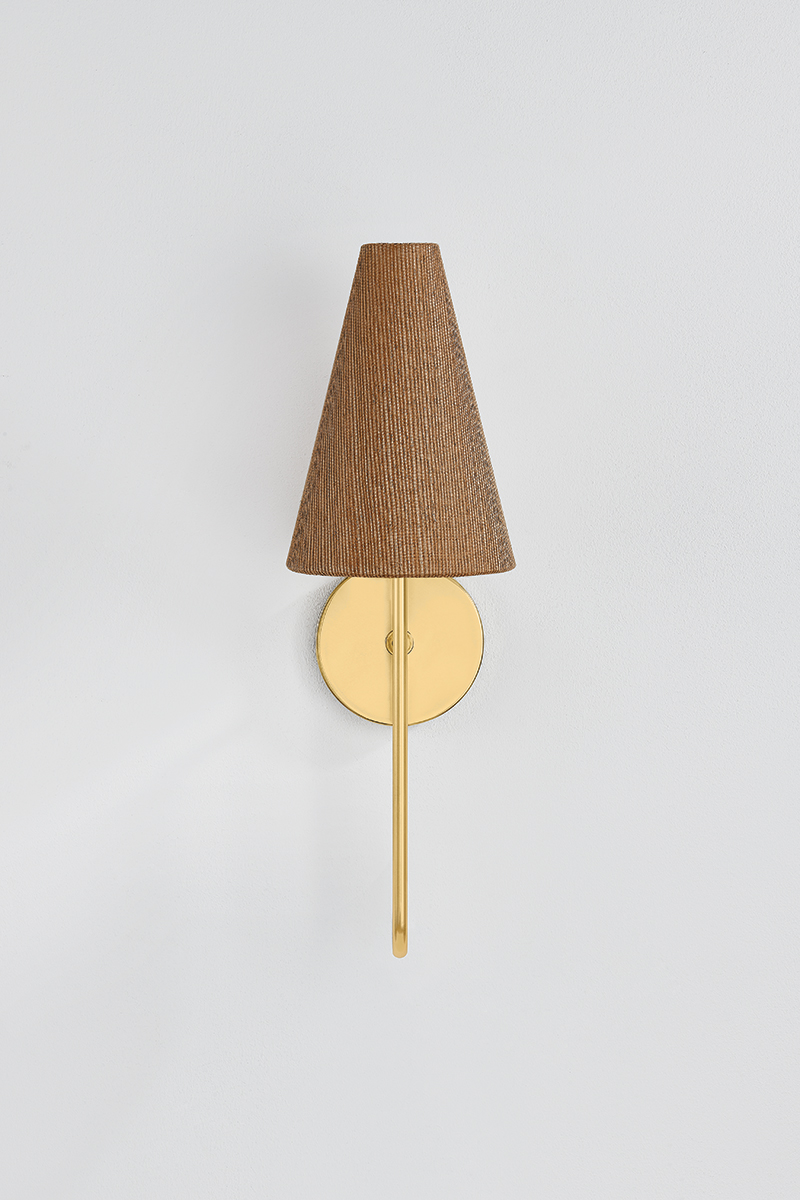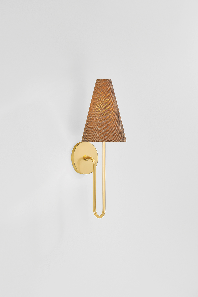 Merging design motifs and materiality from different eras, Jessel brings an antique style into the modern day. The sweeping Aged Brass arms recall vintage chandeliers, while the elongated grasscloth shades lend a casual tone that is grounded in the present. Available as a 1-light sconce or 5-light chandelier, Jessel is particularly well-suited to cottage-style interiors.