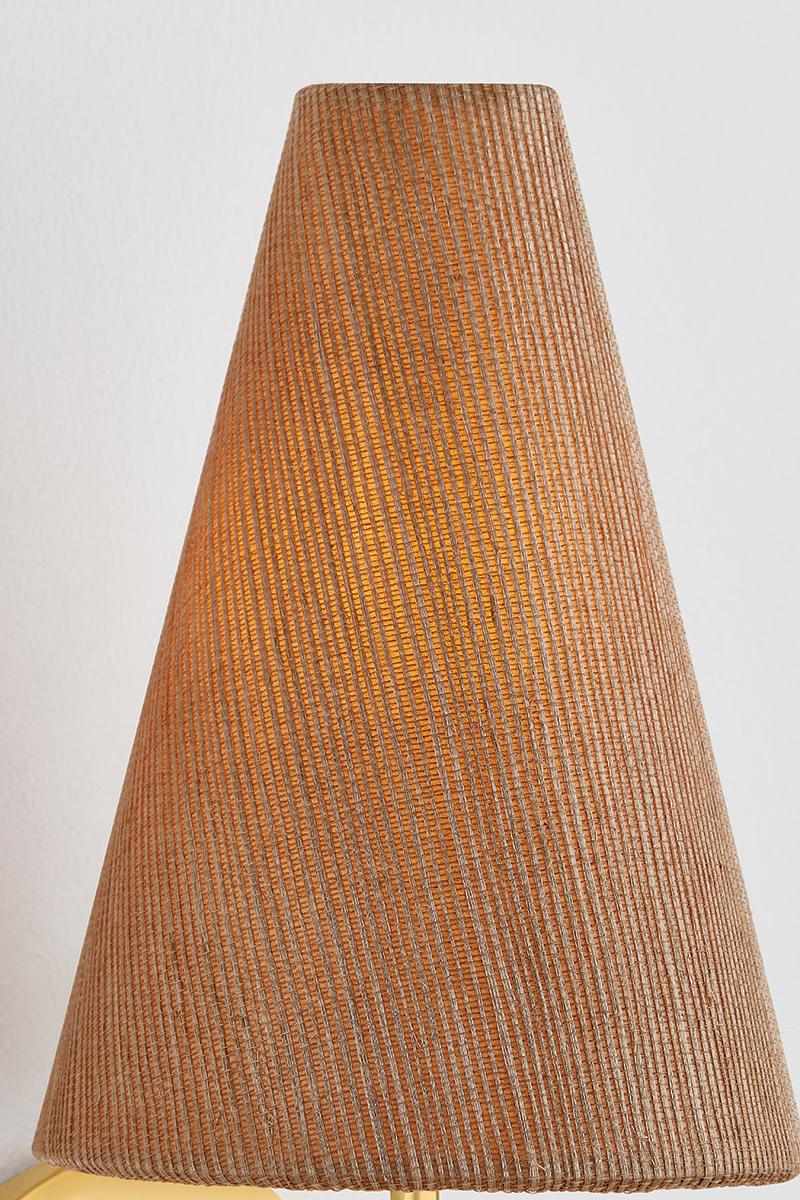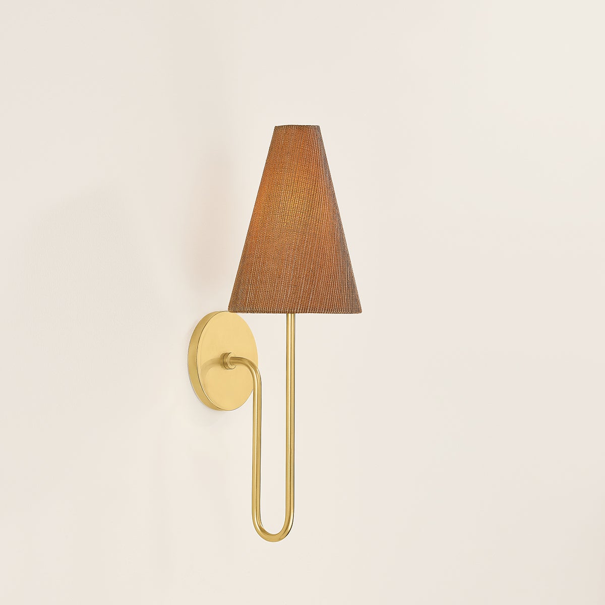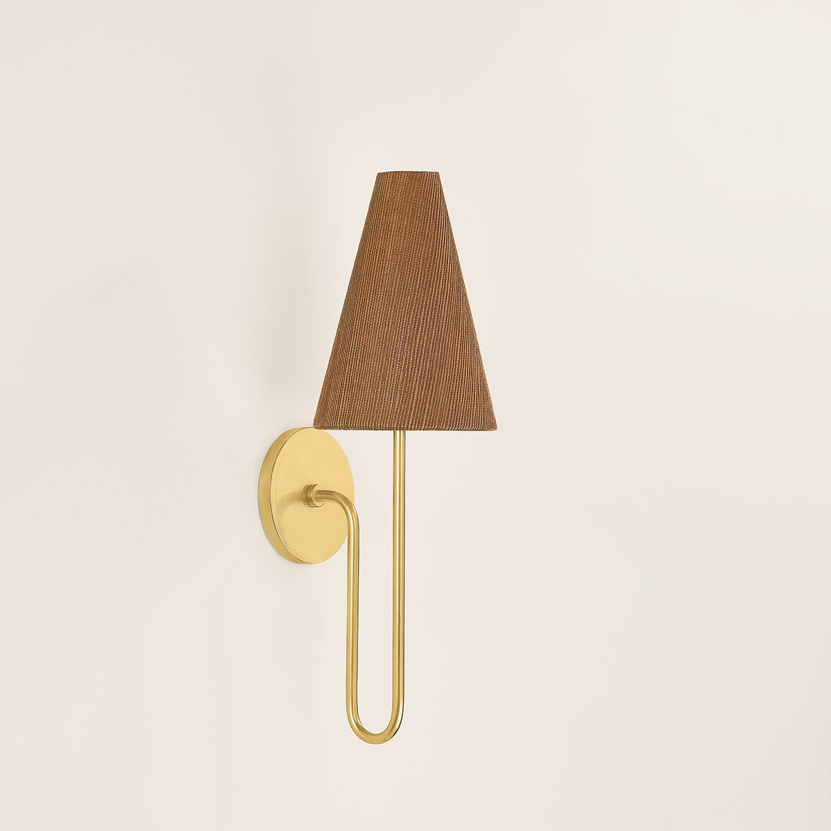 Merging design motifs and materiality from different eras, Jessel brings an antique style into the modern day. The sweeping Aged Brass arms recall vintage chandeliers, while the elongated grasscloth shades lend a casual tone that is grounded in the present. Available as a 1-light sconce or 5-light chandelier, Jessel is particularly well-suited to cottage-style interiors.