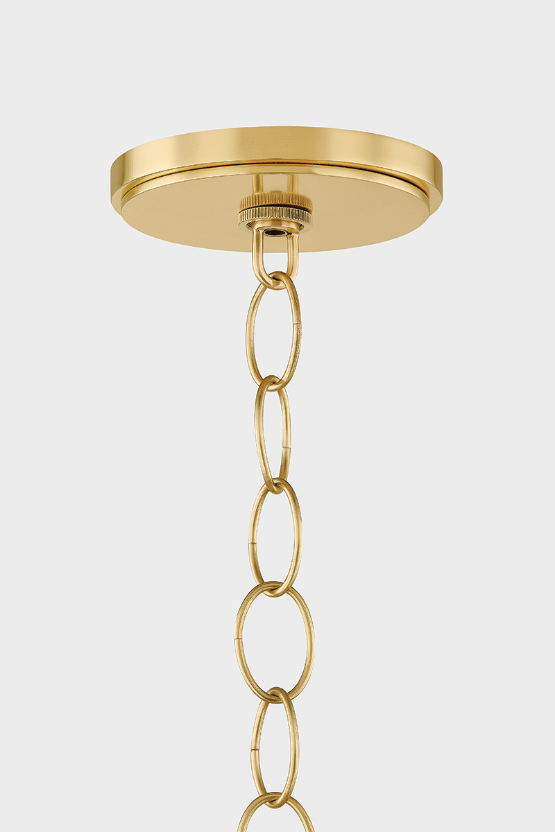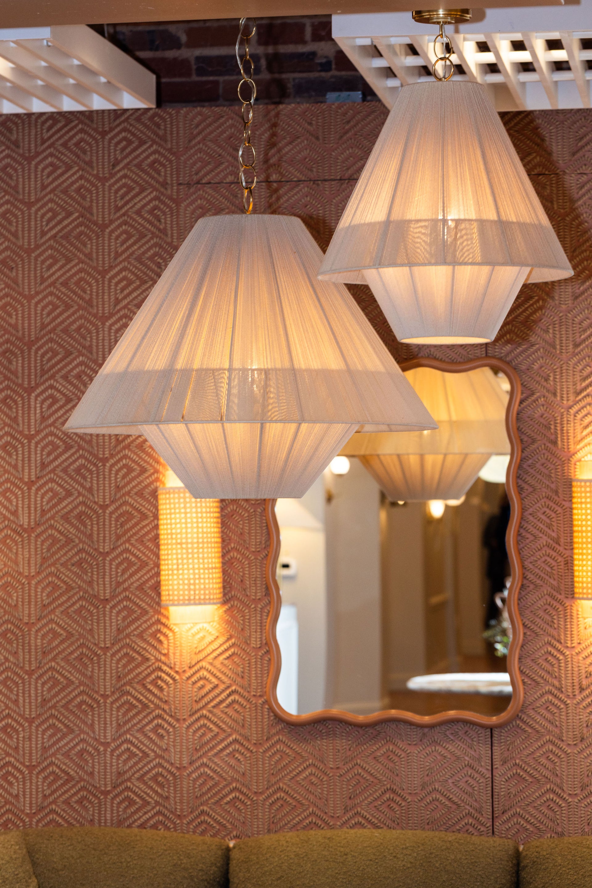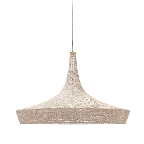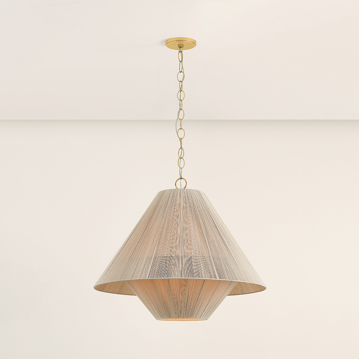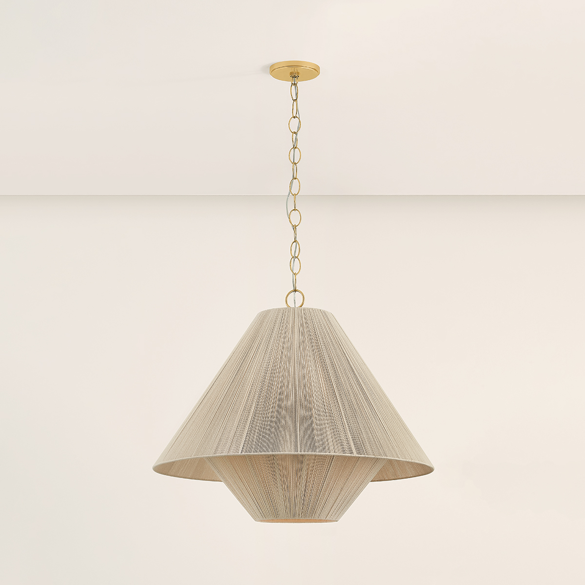 To create the casual elegance of the Eleanor pendant, two light and airy string shades are nested around a central light source. The overlapping of the conical shades creates a subtle moire effect, adding depth to the dynamic silhouette. Suspended by a simple, yet refined Aged Brass chain, Eleanor is perfect over a dining table or in a bedroom.