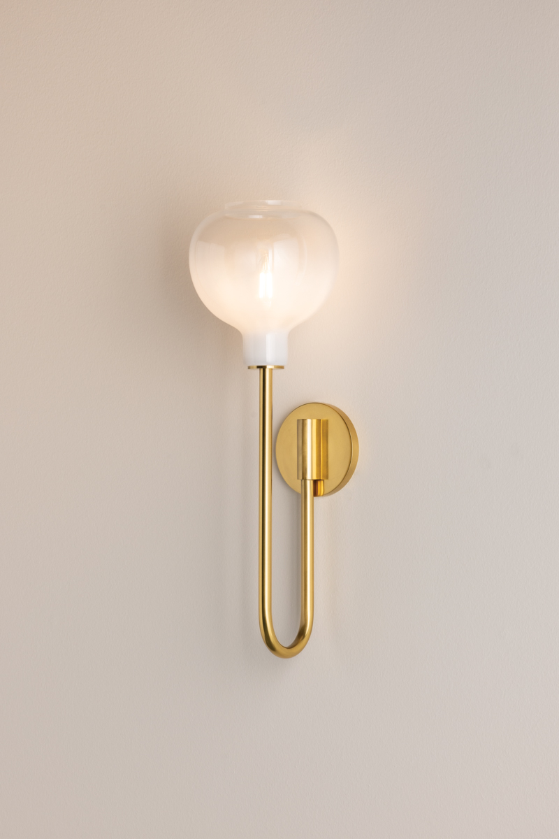 At the intersection of transitional and modern design, the Estelle family features relatable silhouettes with striking glasswork. The elongated J-arms arc upwards to support naturally rounded glass shades. Combining the cloudy Sfumato glass with classic Aged Brass metalwork results in a warm, inviting lighting experience. Available as a 1-light sconce and a 3 or 5-light chandelier, Estelle lends a sense of soft elegance to any space.