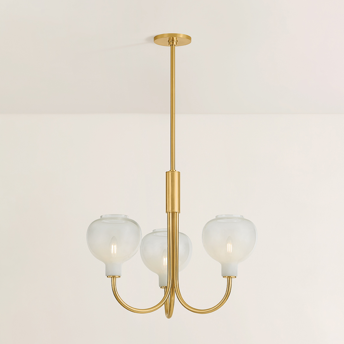 At the intersection of transitional and modern design, the Estelle family features relatable silhouettes with striking glasswork. The elongated J-arms arc upwards to support naturally rounded glass shades. Combining the cloudy Sfumato glass with classic Aged Brass metalwork results in a warm, inviting lighting experience. Available as a 1-light sconce and a 3 or 5-light chandelier, Estelle lends a sense of soft elegance to any space.