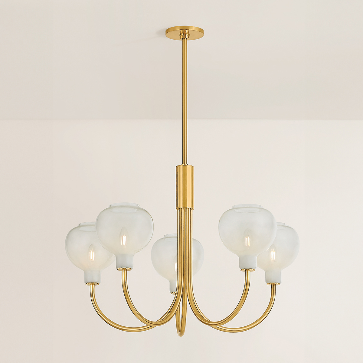 At the intersection of transitional and modern design, the Estelle family features relatable silhouettes with striking glasswork. The elongated J-arms arc upwards to support naturally rounded glass shades. Combining the cloudy Sfumato glass with classic Aged Brass metalwork results in a warm, inviting lighting experience. Available as a 1-light sconce and a 3 or 5-light chandelier, Estelle lends a sense of soft elegance to any space.