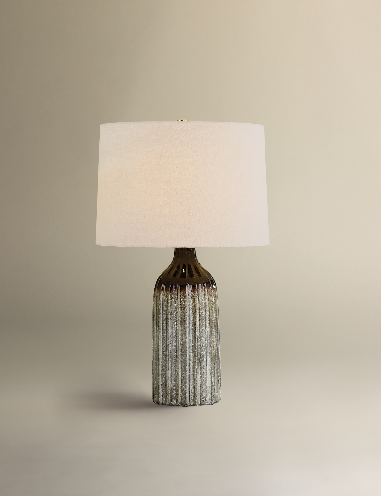 An artful ombre creates striking depth and dimension in the Raisa table lamp. The mocha-hued reactive glaze seems to cascade off the shoulders of the ceramic base, activating contrasting white tones that pool into the grooves of the fluted form. A high-gloss finish adds a polished note to balance the rusticity of the earthy alchemy.