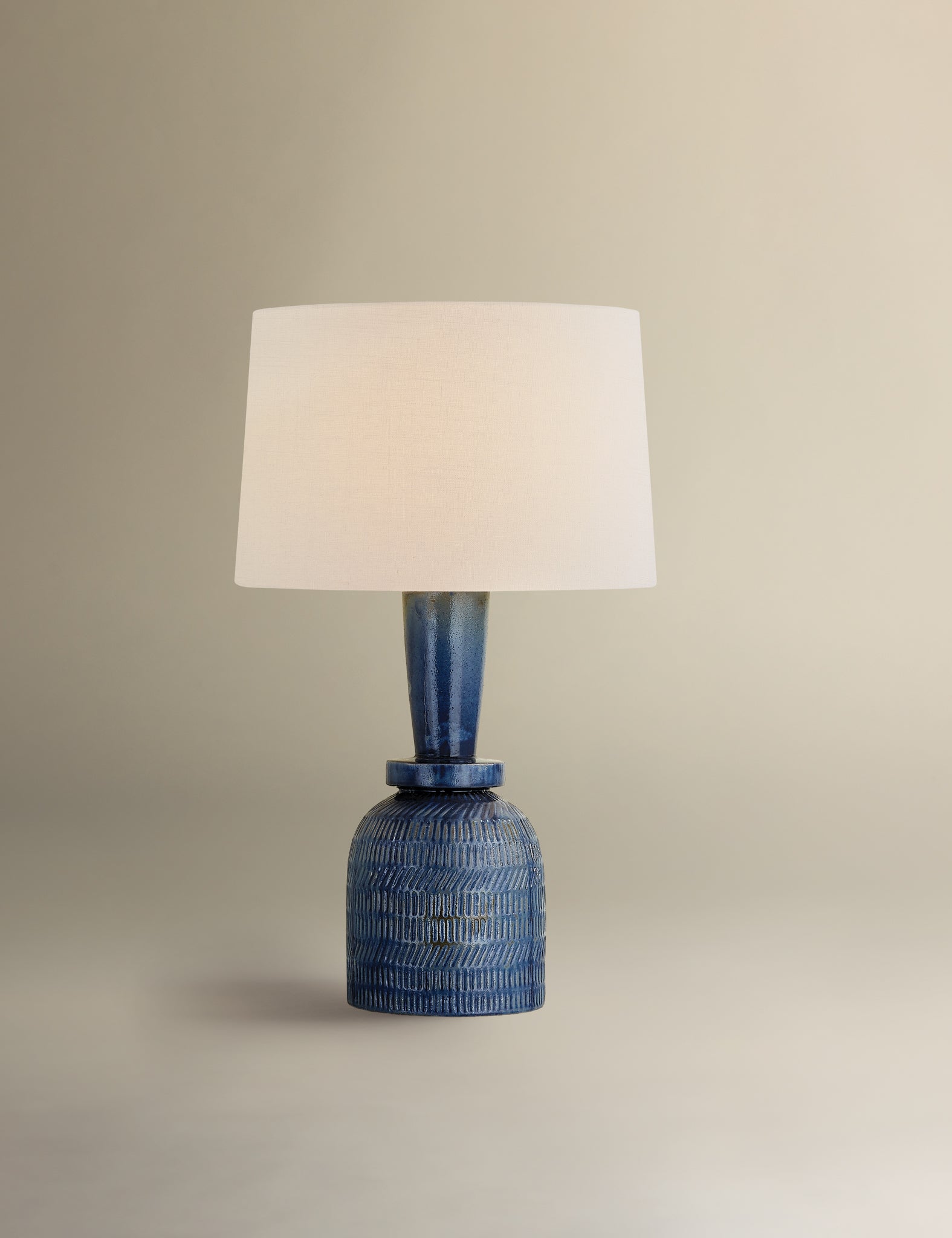 In both form and finish, Russo presents an artful take on an everyday lighting staple. Named after one of Mandy’s earliest childhood friends, this versatile table lamp is an elevated tribute to the many craft projects they enjoyed together. The stacked, sculptural base is brought to life with a subtle ombre glaze and distinctive etched surface texture. A large white linen drum shade balances the proportions, adding a voluminous contrast to the slender tapered neck of the ceramic base.