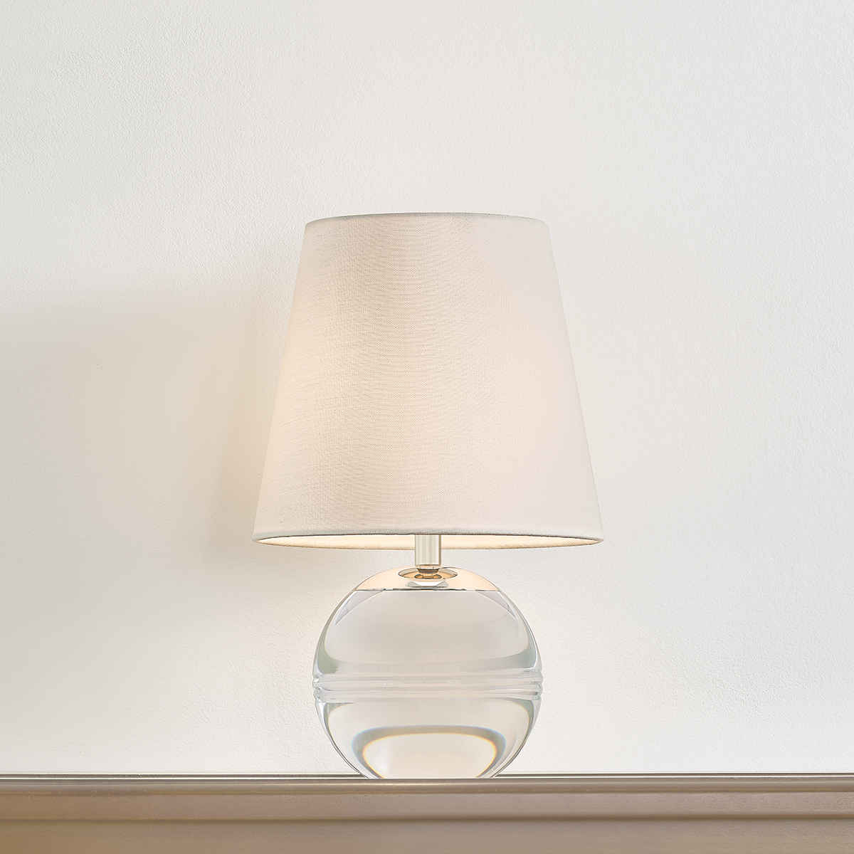 Ridged with ripple-like cuts, the crystal base of the Nicole table lamp makes for an eye-catching accent piece. Topped with a beautiful white linen shade, this lamp is available as a cordless rechargeable or a traditional plug-in, adding convenience when styling. With Polished Nickel-finished hardware, it’s the perfect addition to any bookshelf or small space.