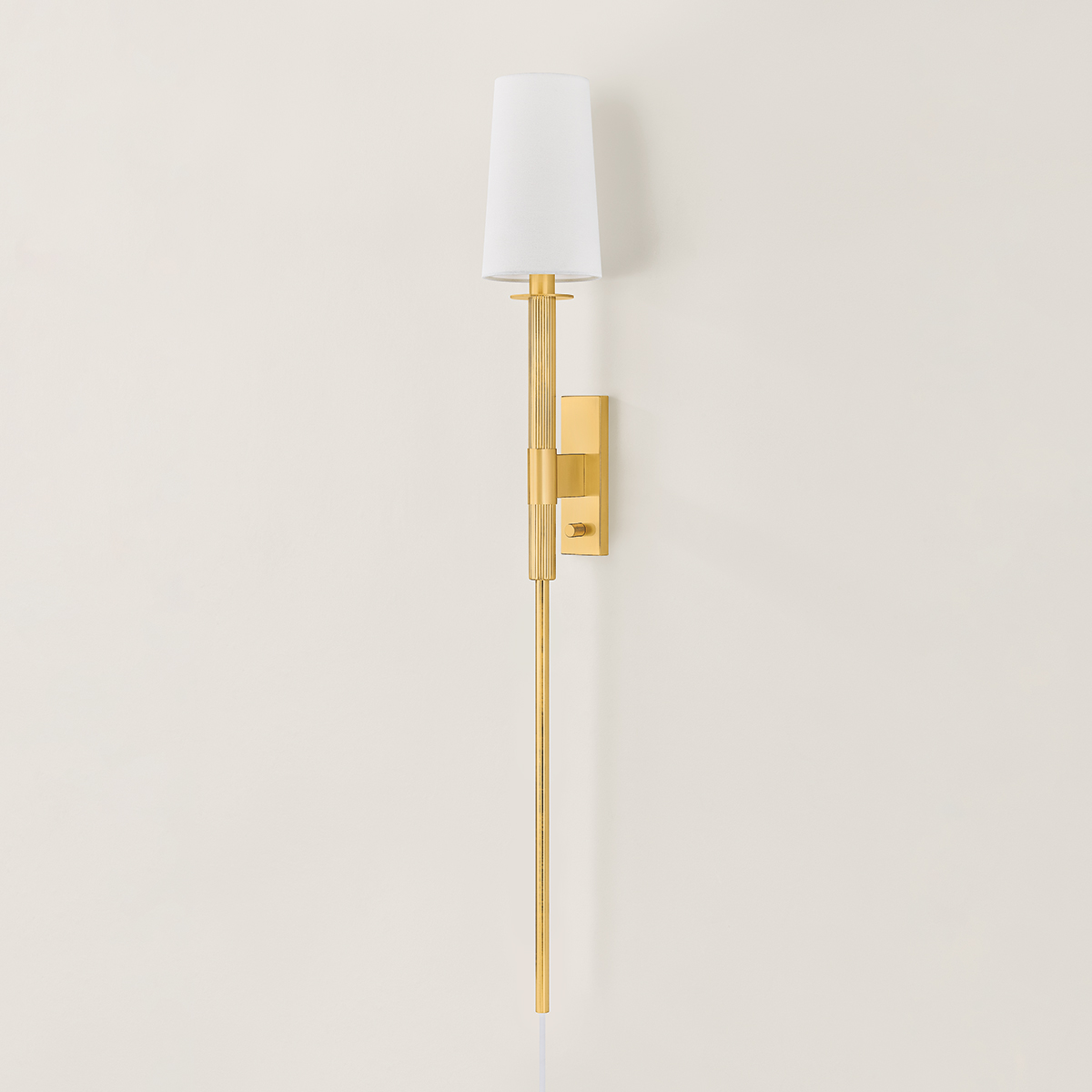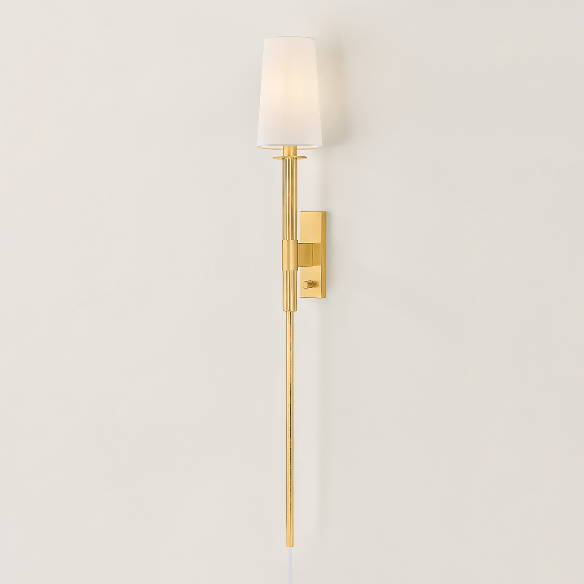The slender stem of Ginny has a secret. This design-forward sconce cleverly hides its cord, creating a seamless and luxurious look when placed behind a nightstand, desk, or sofa. Finished in Aged Brass, the elongated silhouette is accented by a sleek bobeche, modern backplate, and a classic white linen shade.