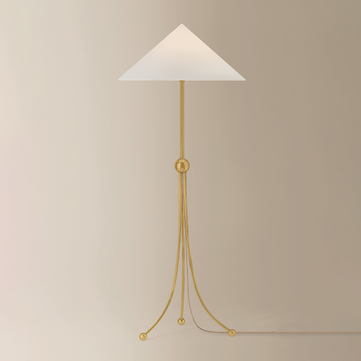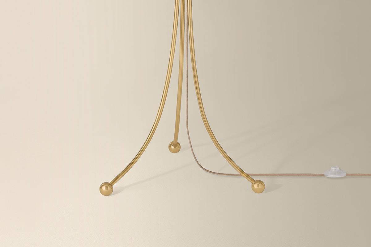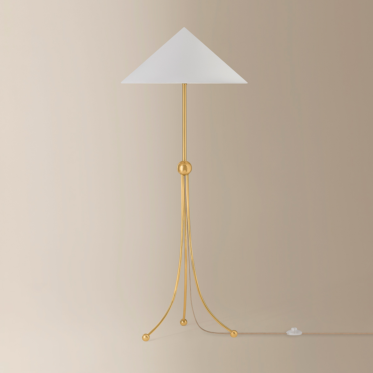 Statuesque and expressive, the Katya floor lamp adds graphic elements to an elongated form. Three curved legs with delicate ball feet support a slender stem, creating a silhouette that draws from both a traditional and modern design lexicon. Topped with a conical cotton shade, Katya casts a soft, flattering light that reflects off the Aged Brass finish.