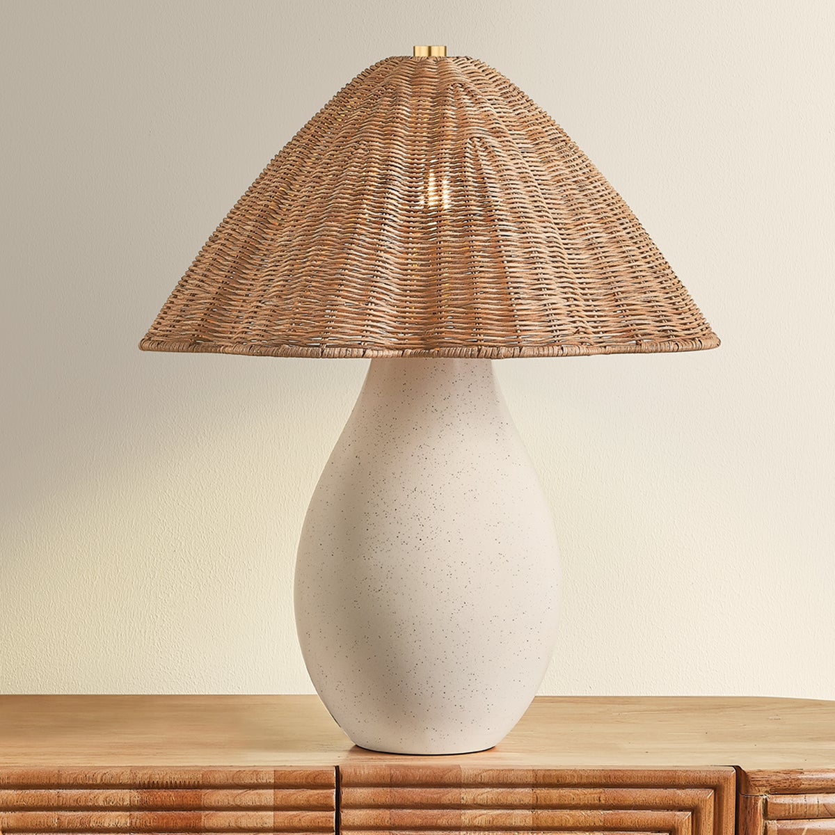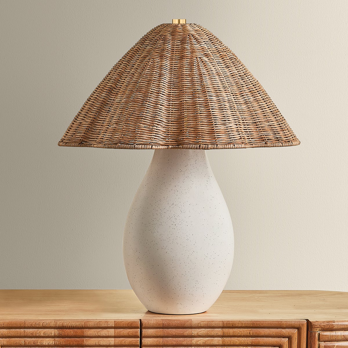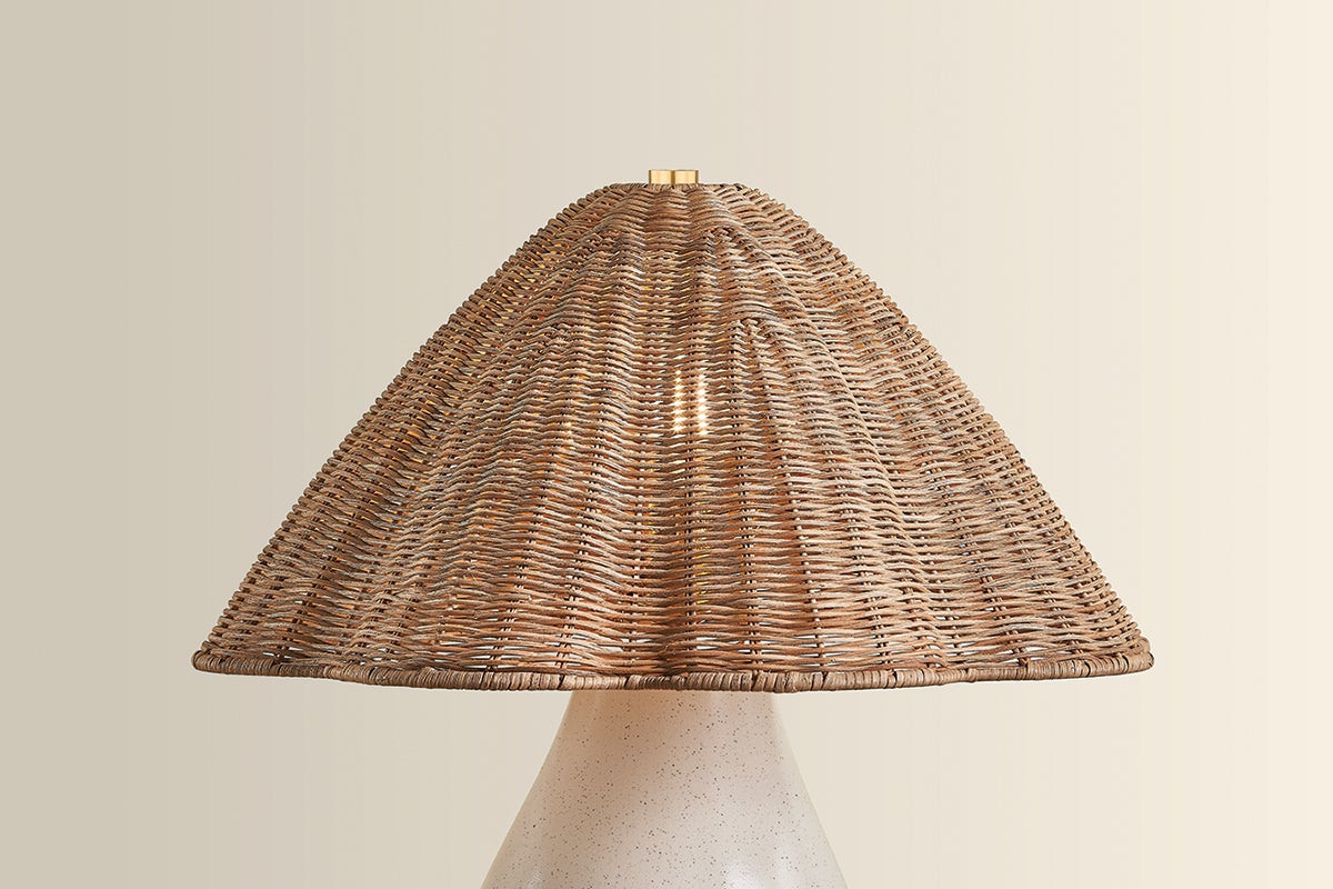 Deanne reinterprets a classic mushroom silhouette with soft curves and mixed materiality. Finished in a Creamy Oat glaze, the voluminous ceramic base grounds the design with a hand-sculpted feel. The dome-shaped, scalloped wicker shade brings an airy, tactile contrast. A glint of Aged Brass at the neck unites the earthy elements with a note of polish.