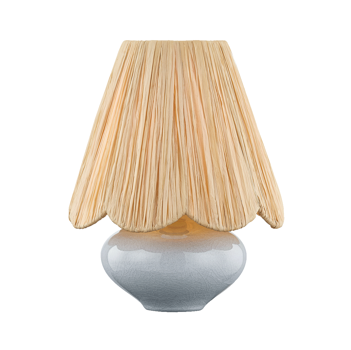 This charming little lamp features playful proportions and tactile materials. A scalloped raffia shade is paired with a ceramic base in a Frost Crackle glaze. The natural texture softens the silhouette, which is approachable and full of character. Aged Brass hardware adds a finishing note to Cailyn.