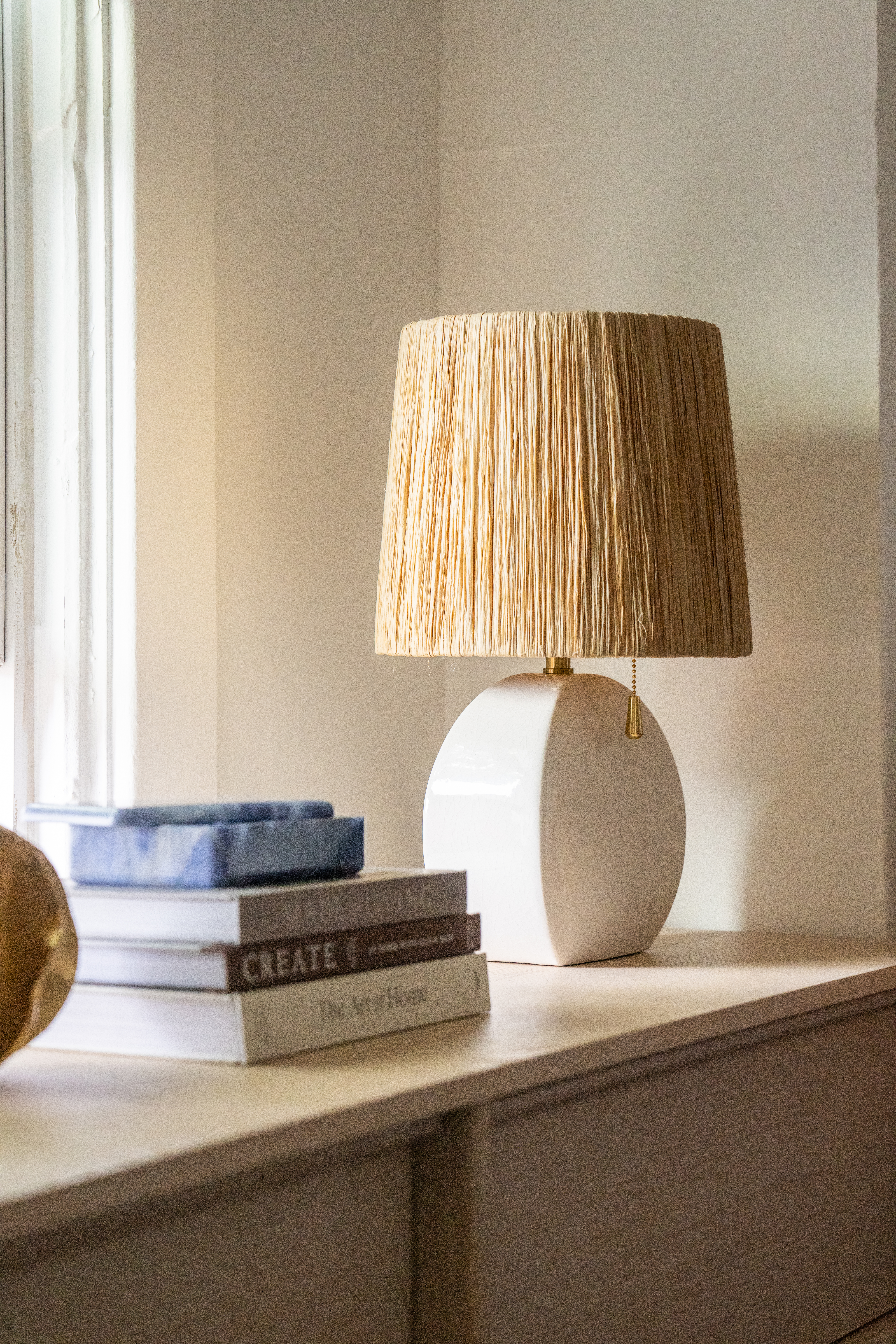 Anessa is a trendsetter, taking style cues from the brightest design trends. From the glossy crackle glaze to the raffia-lined shade, each detail is better than the last. Aged brass accents on the finial, socket and pull chain are beautifully delicate, inspired by minimalist jewelry.