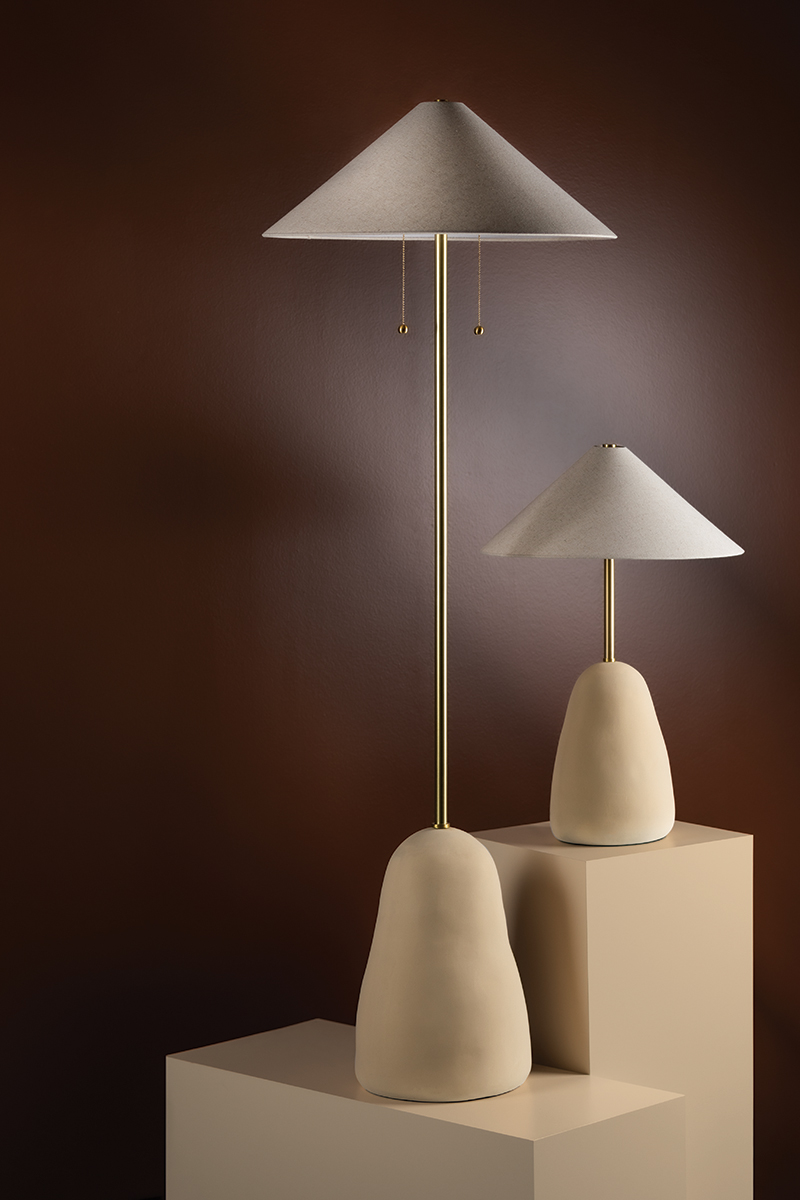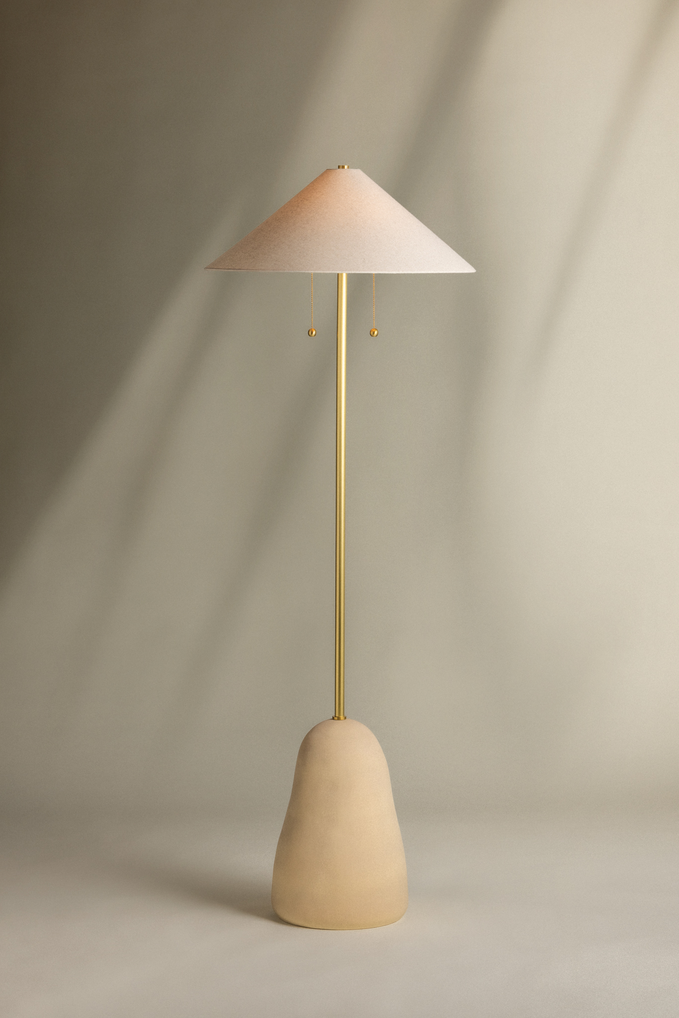 Capturing the designer's heritage, Maia is both intimate and intriguing. The perfectly imperfect ceramic base represents a Brazilian mountain, and the angular shade evokes the roof of a traditional Korean home. Aged brass accents give this natural, neutral beauty a hint of shine.