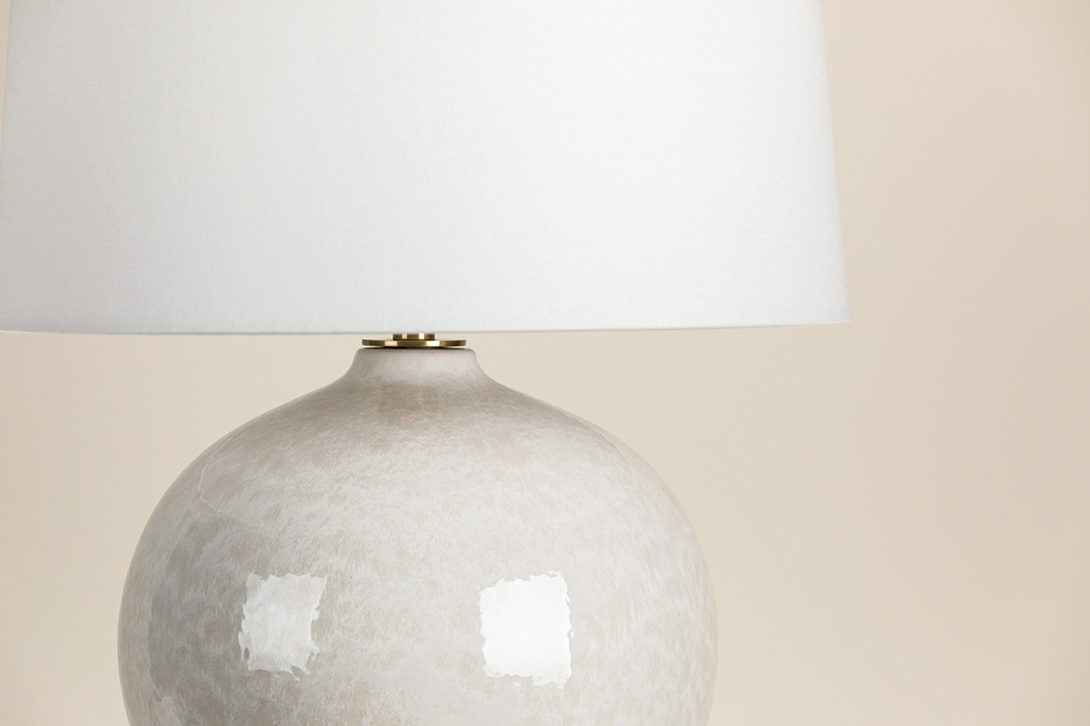 Classic features make Karina a fan favorite. From the monochromatic palette to the simple silhouette, this table lamp will work in any space. The ceramic form features a reactive glaze, lending movement to the finish. Topped with a white linen shade.