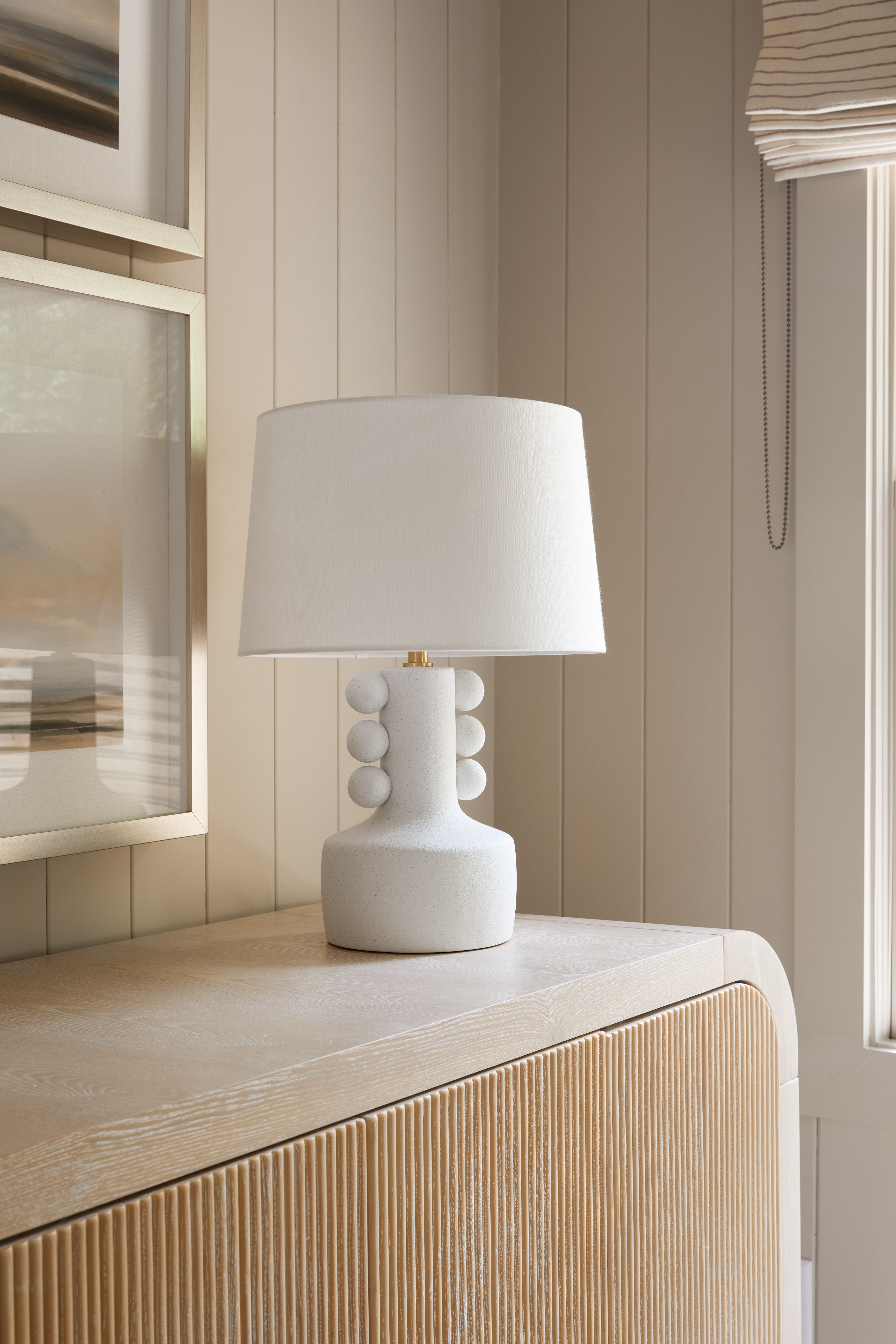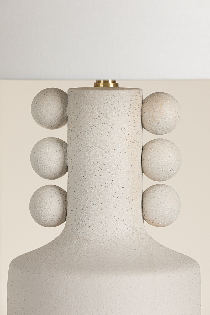 Surrealist form and texture combine in the Amalia Table Lamp. Fun and fresh, Amalia features a speckled crackle glaze that is equal parts subtle and striking. The vessel-like silhouette is accented with bauble-like spheres, topped with a white linen shade for a monochromatic effect.