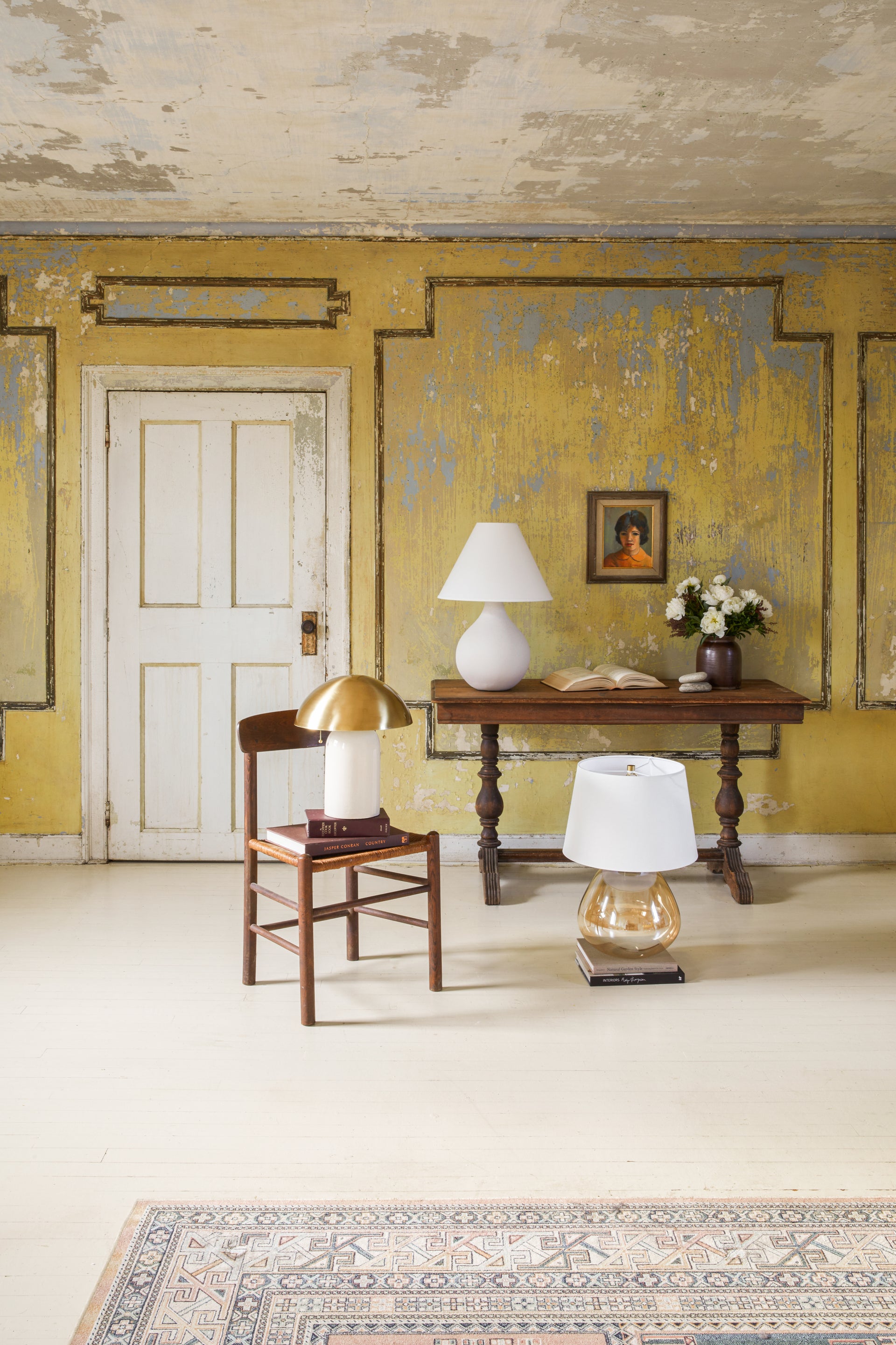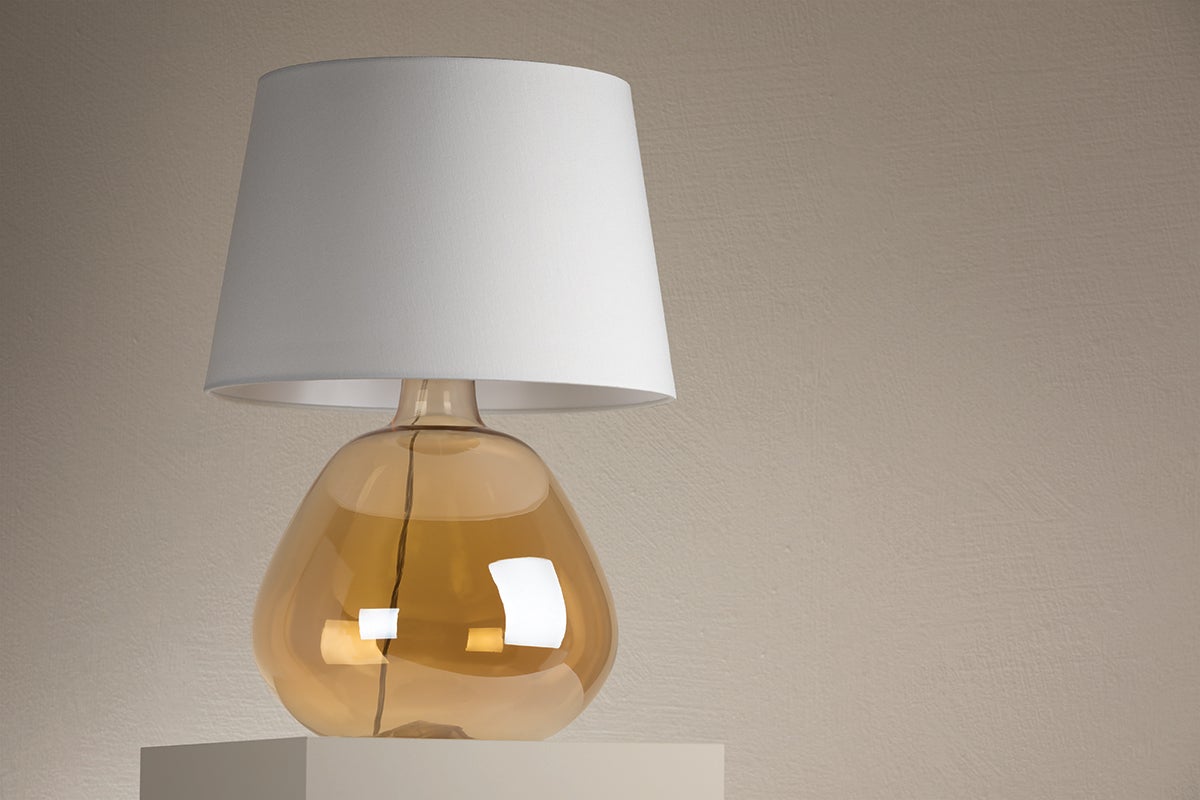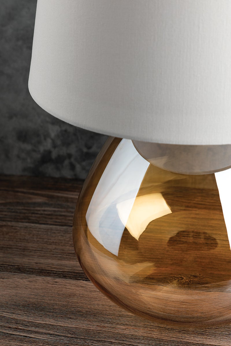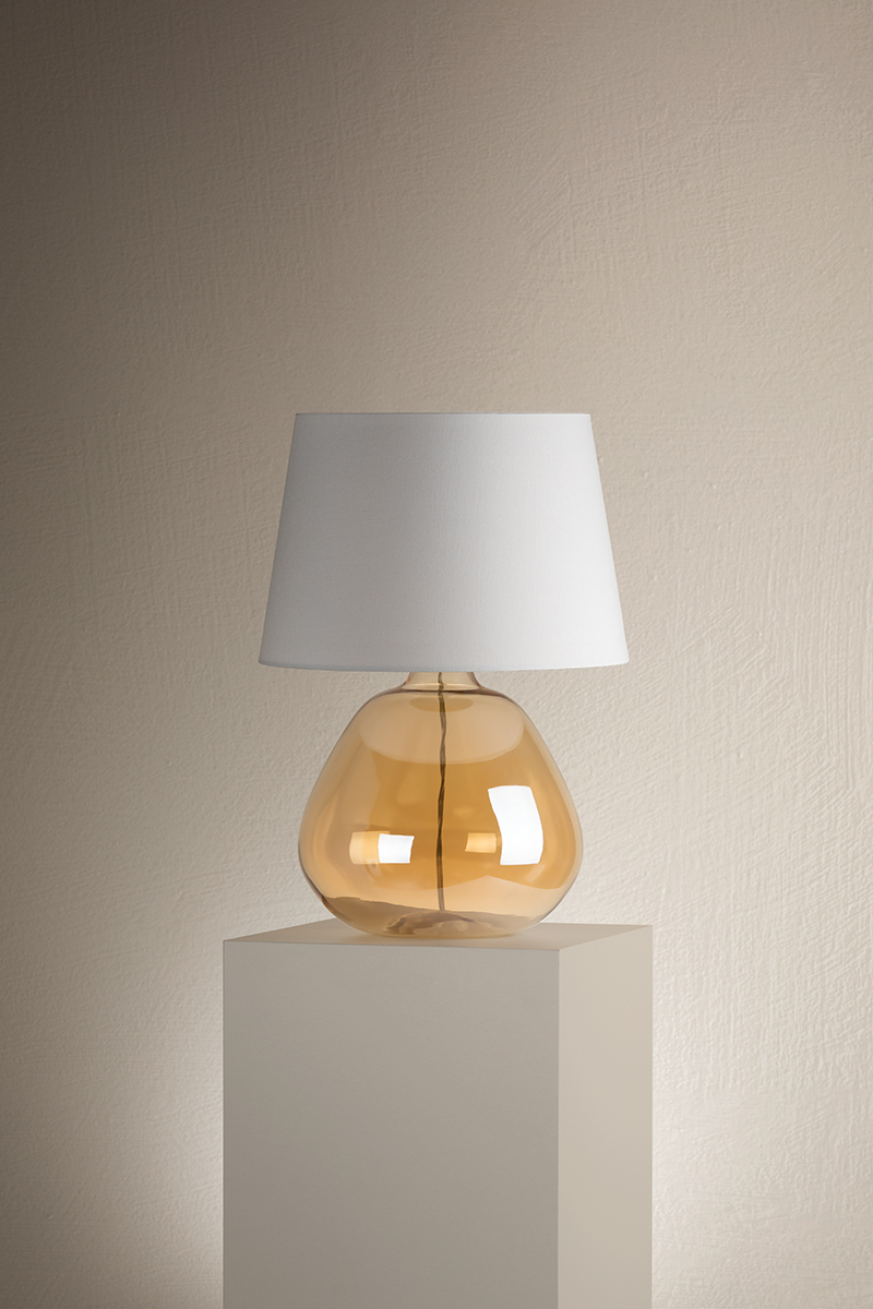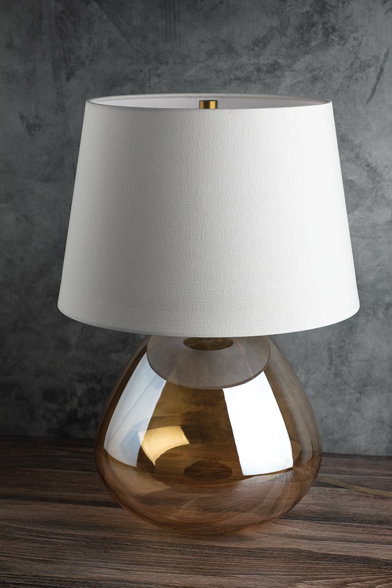 Thea's beauty lies in her unique luster finish, expertly crafted to enhance the organic form. The table lamp emanates warmth, featuring a plated champagne amber glass that quietly glistens. French-wired for added flair, the wire extends directly from the socket. Topped with a linen drum shade.