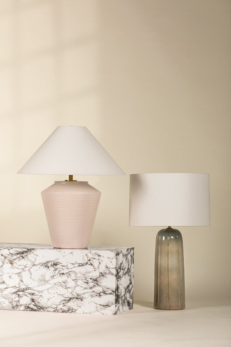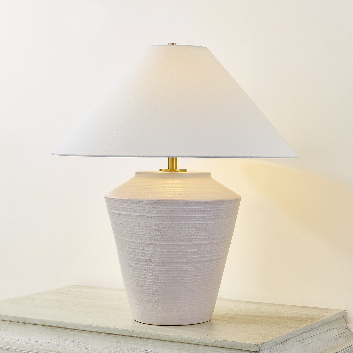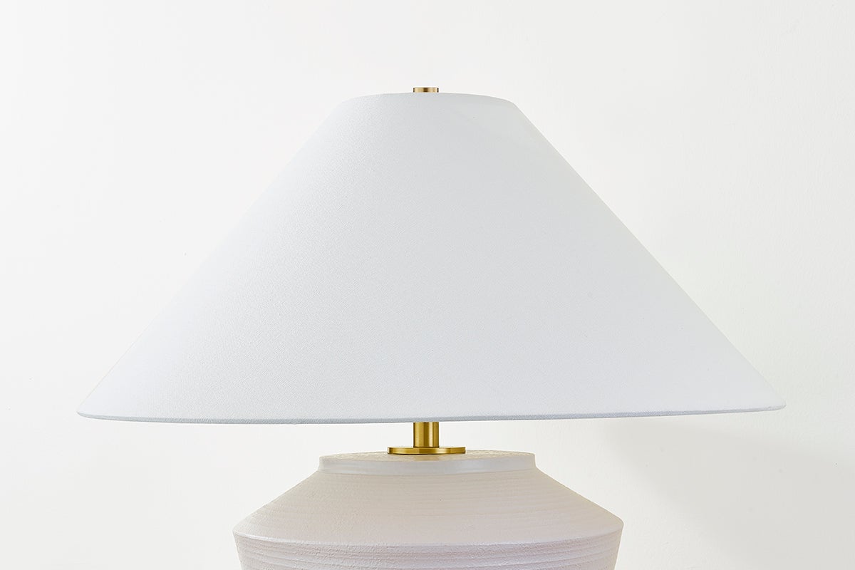 Inspired by raw beauty of the desert, this whitewashed terracotta table lamp is calm and refreshing. The textural body contrasts beautifully with the angular tapered white linen shade. An Aged Brass frame provides a surprising metallic finish. Part of THELIFESTYLEDCO® collection.