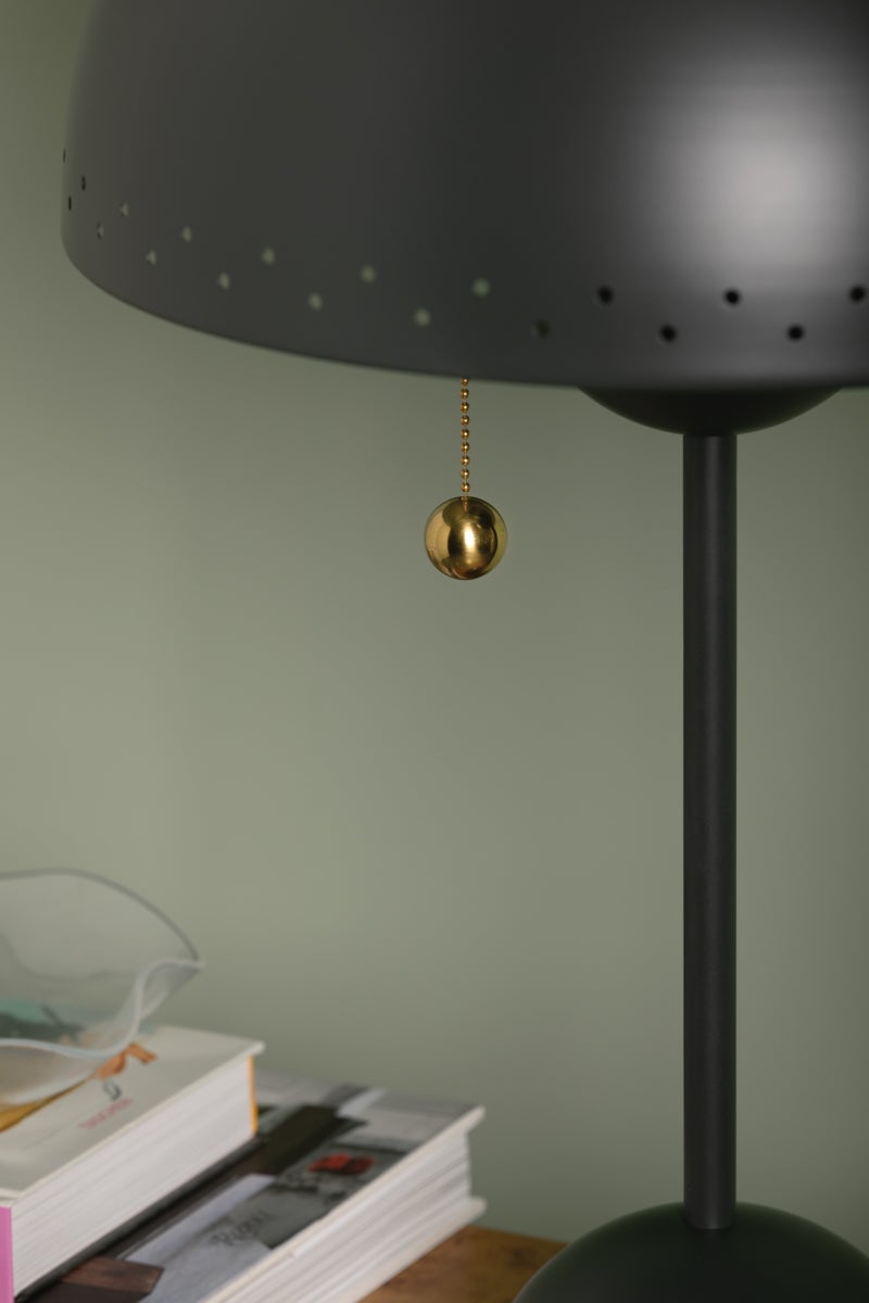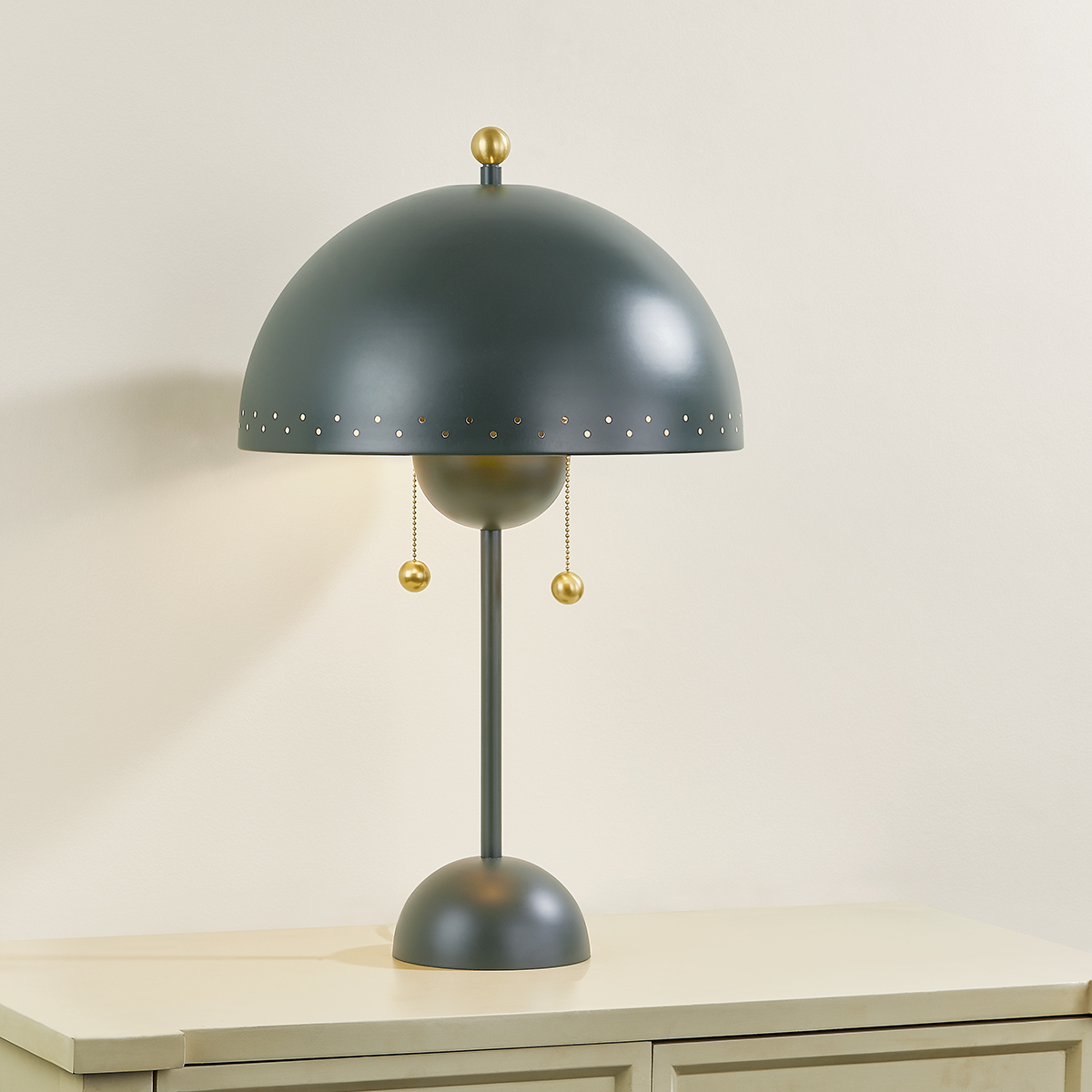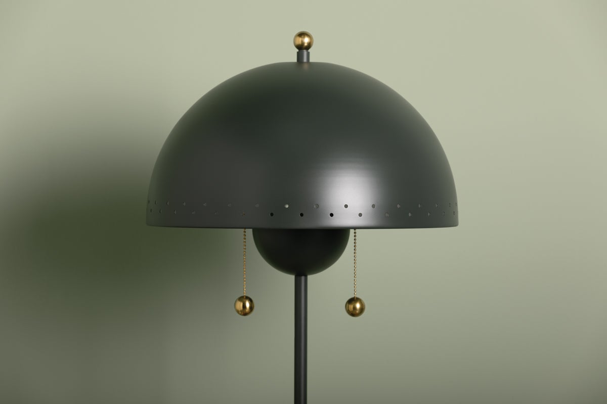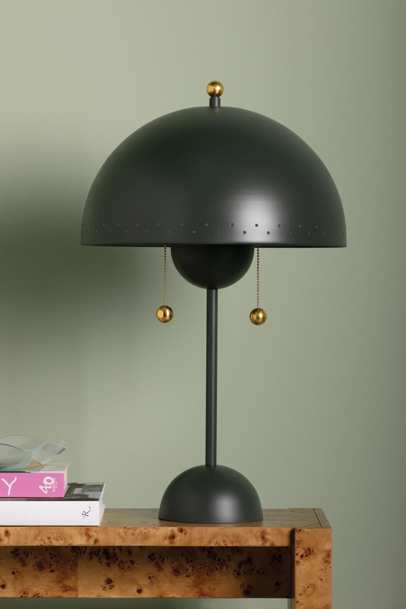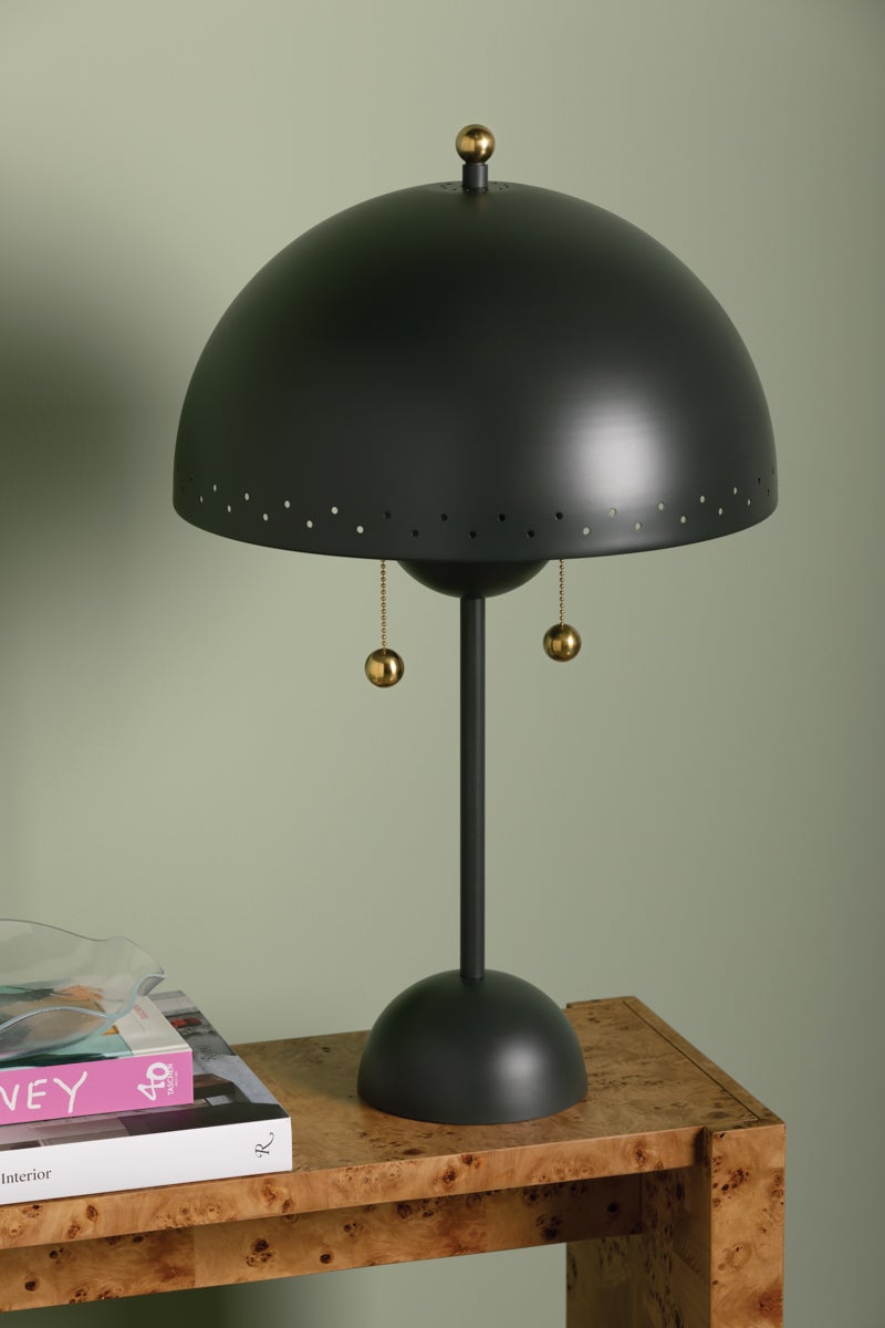 Influenced by midcentury design, Jojo features a dome-shaped shade with decorative perforations that allow light to escape. Both the pendant and sconce come in a Soft White finish while the lamp is available in a moody green as an eye-catching accent piece. The pendant features 2 lights within its bowl, optimizing illumination. All variations are elegantly accented in Aged Brass. Part of our Zoe Feldman collection.