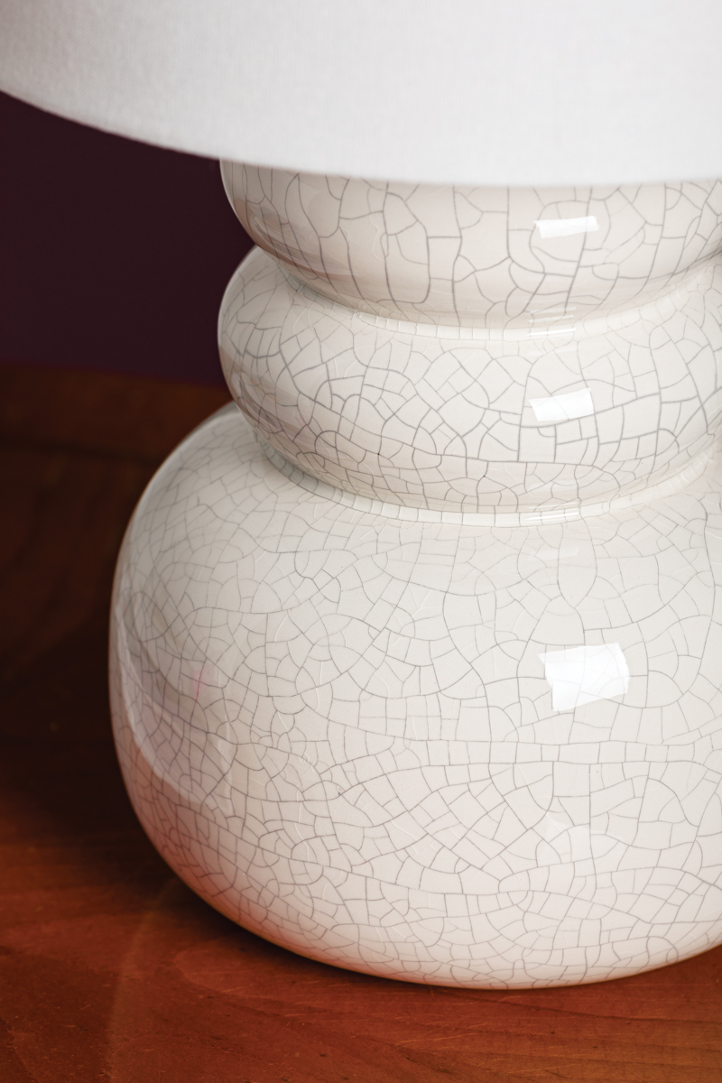 In a petite size, this playful, pillowy table lamp makes a charming statement with its stacked ceramic forms. The crackled nature of the finish and soft, blush-toned hue create a sense of movement that draws the eye. A tall linen shade adds an unexpected sense of verticality, enhancing the whimsical feel of Corinne. Part of our Zoe Feldman collection.
