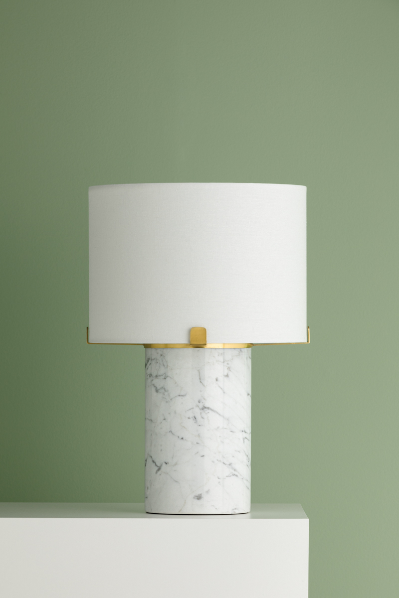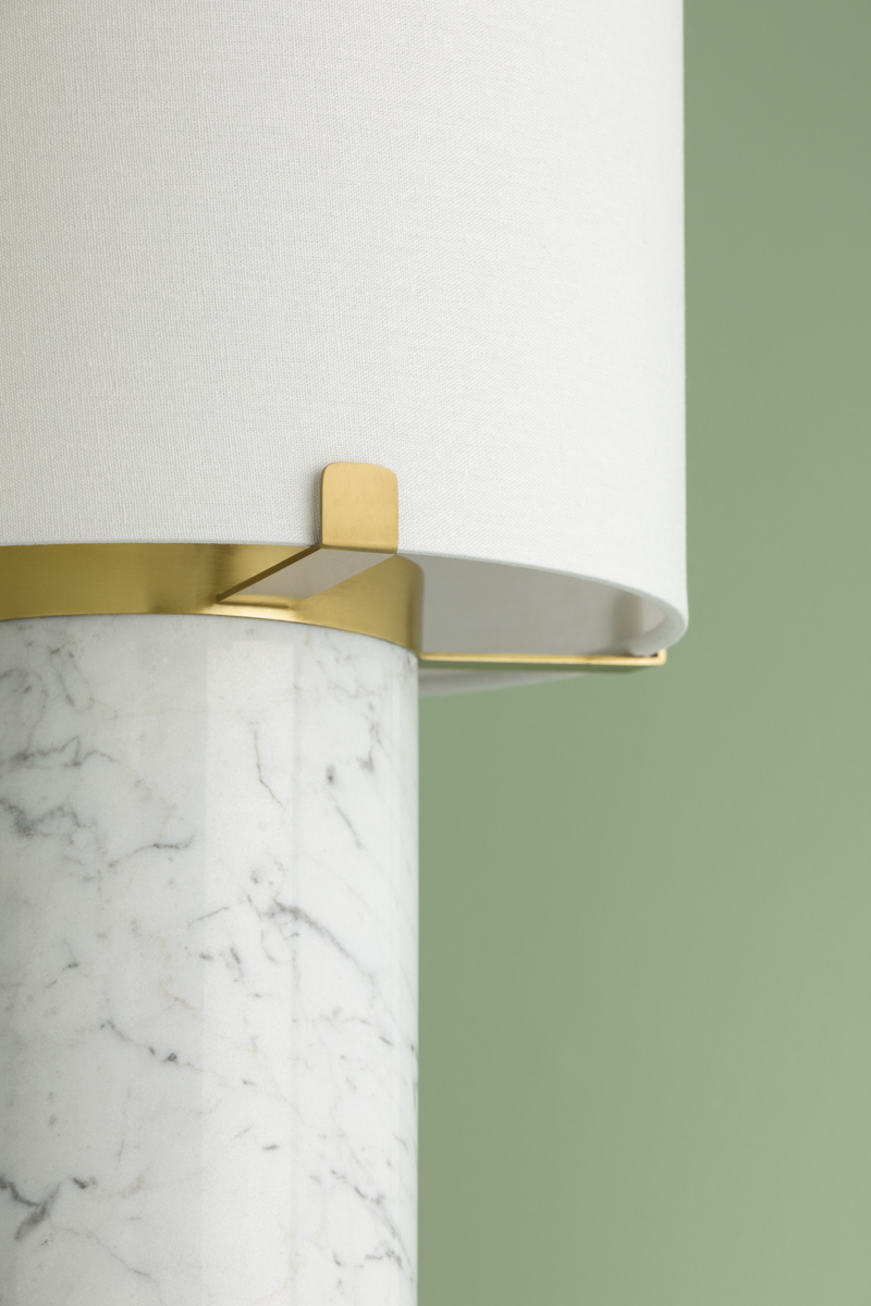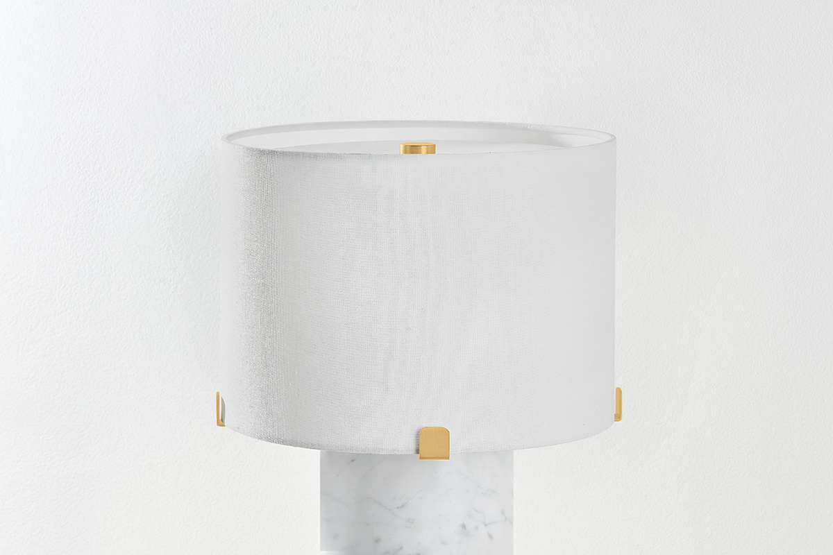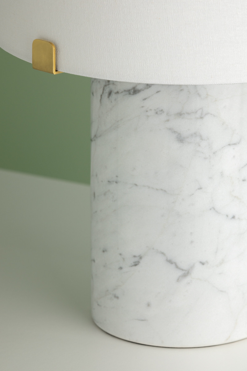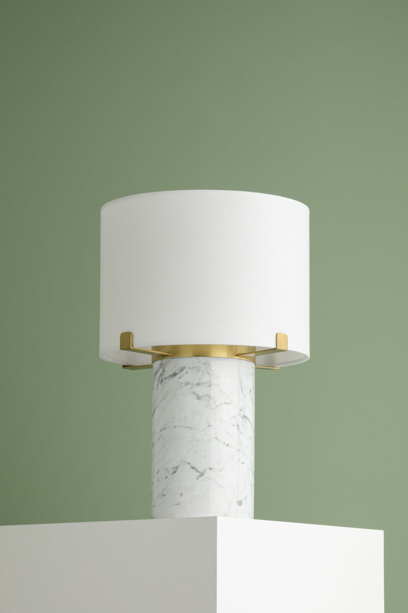 Rumi offers high design in a petite format. Sculpted from natural Carrara marble, the chunky modern base captures attention with its delicate natural veining. Supported by jewelry-like Aged Brass clasps, a classic linen drum shade softens the sophisticated stone. Make an elevated statement on an office desk or bedside with this inimitable little lamp.