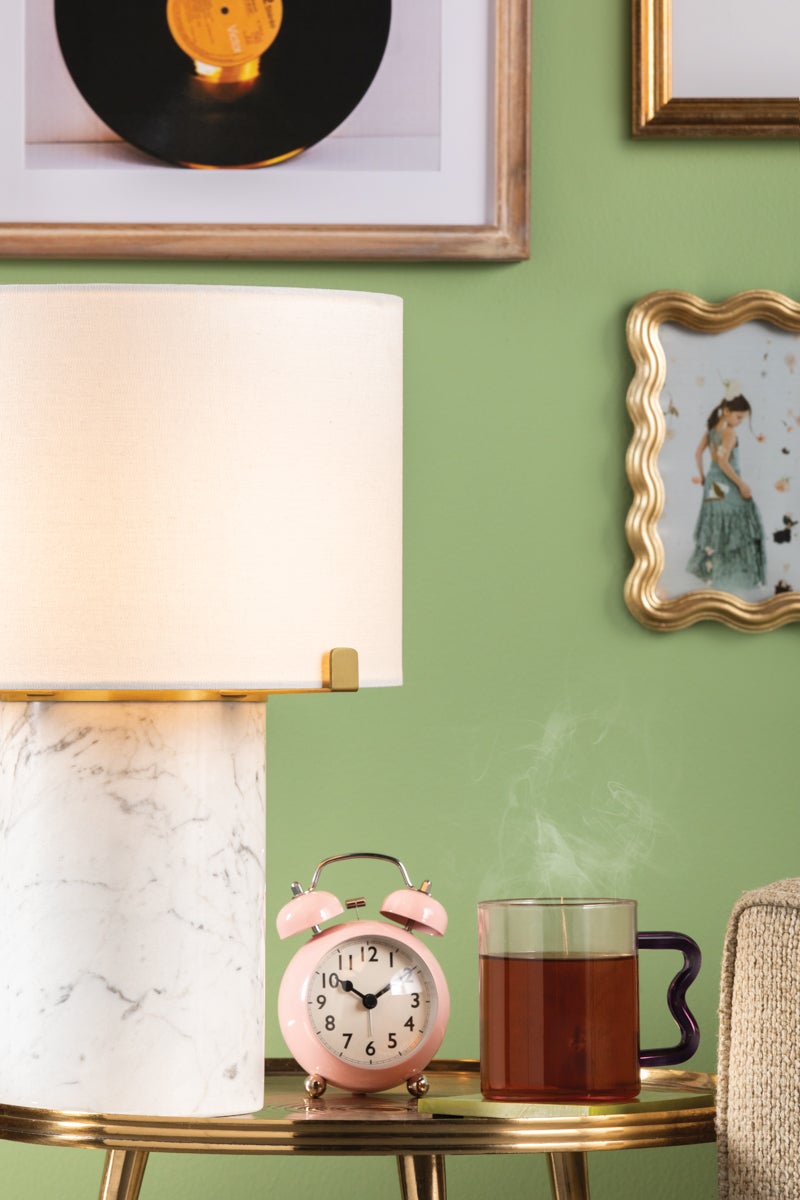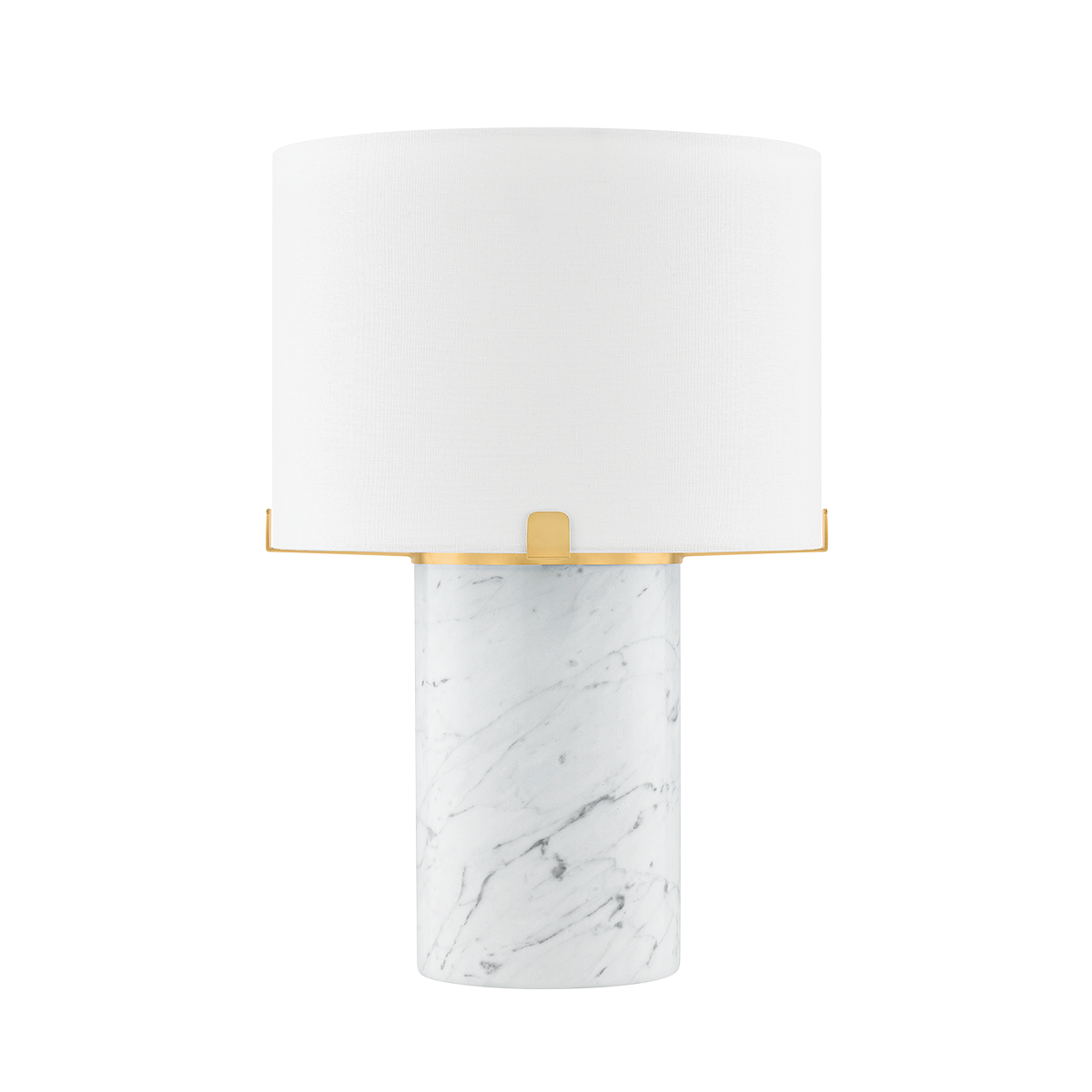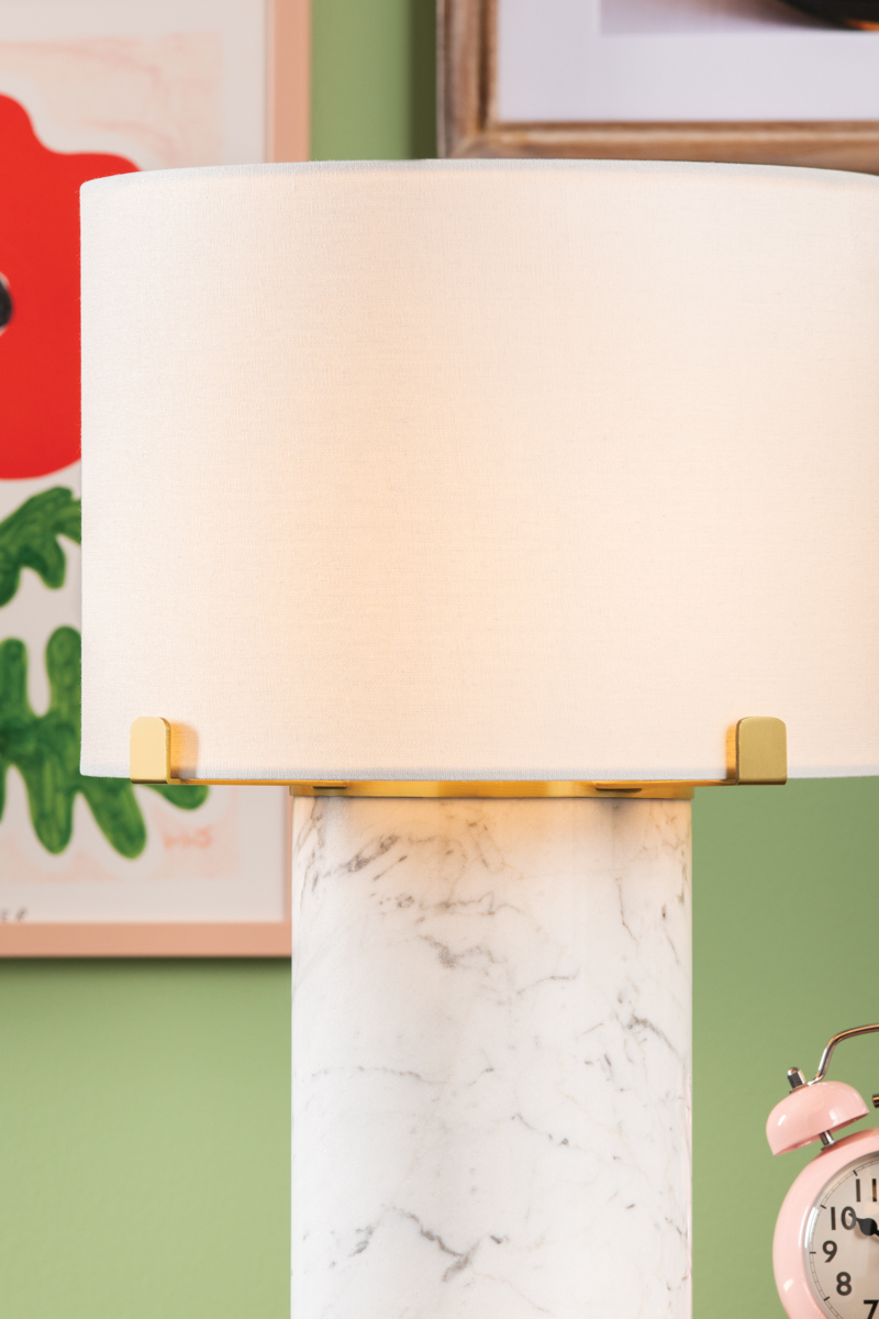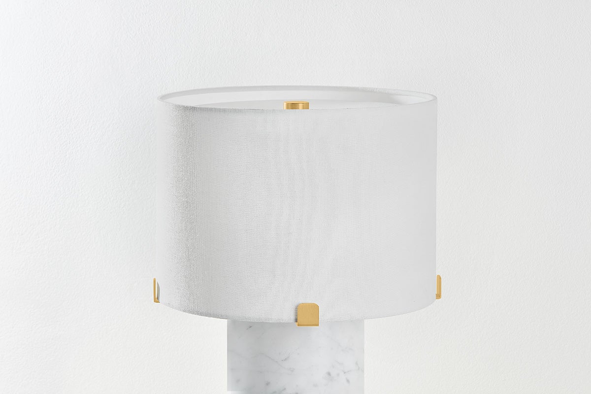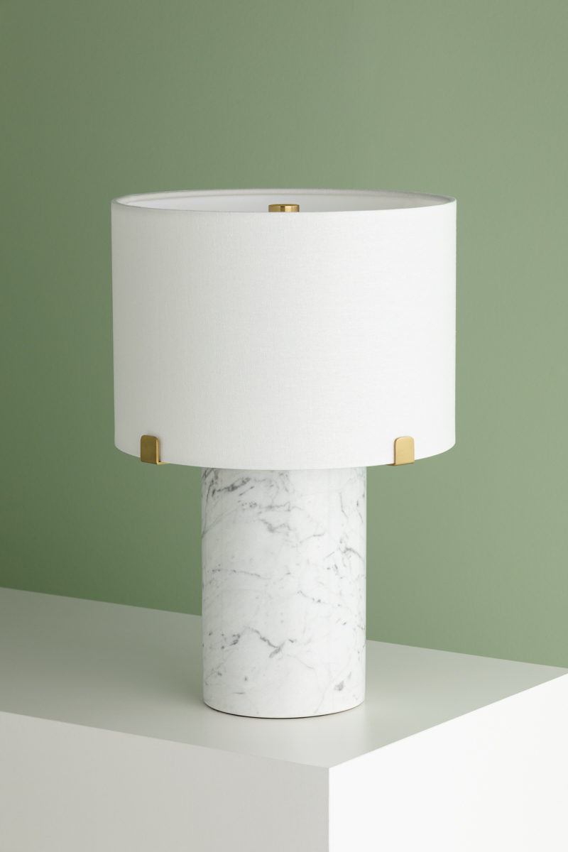 Rumi offers high design in a petite format. Sculpted from natural Carrara marble, the chunky modern base captures attention with its delicate natural veining. Supported by jewelry-like Aged Brass clasps, a classic linen drum shade softens the sophisticated stone. Make an elevated statement on an office desk or bedside with this inimitable little lamp.