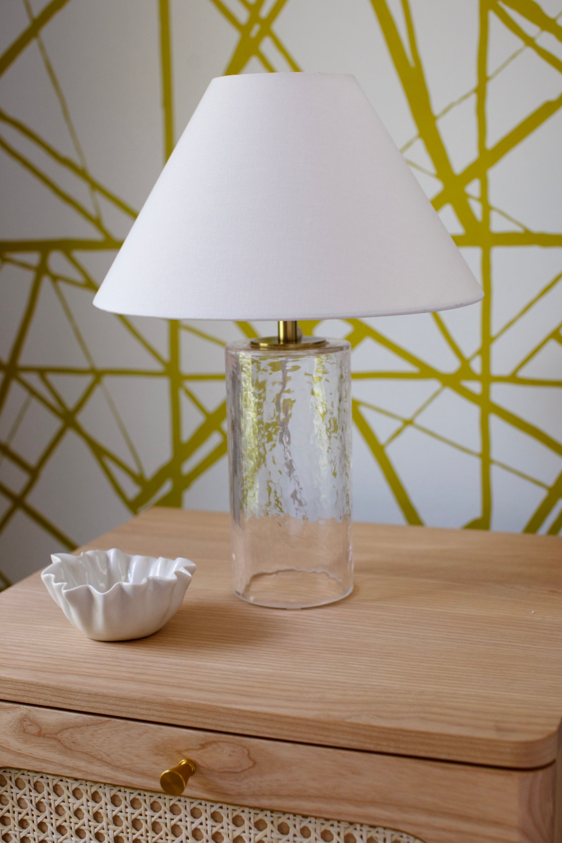 Distinctive yet versatile, this table lamp features a clear-blown glass base teamed with a conical white linen shade. The petite proportions and tailored silhouette make Mandy well-suited to a number of spaces. Balancing the icy appearance of the glass, an Aged Brass neck finishes the lamp on a warm note. Part of our Megan Molten x Mitzi Tastemakers collection.
