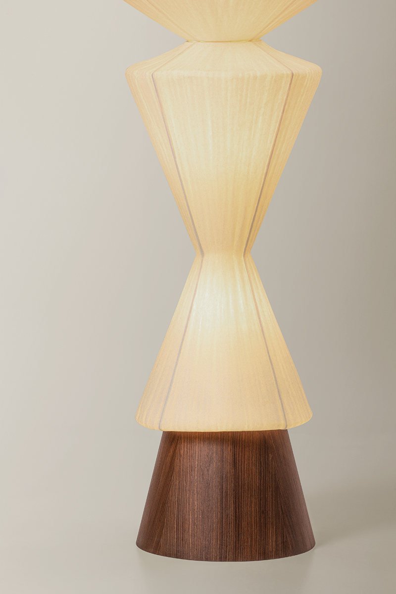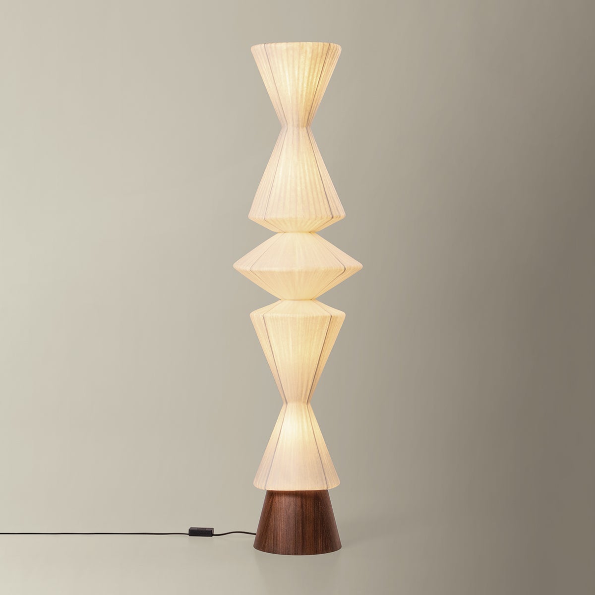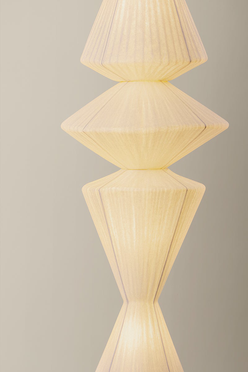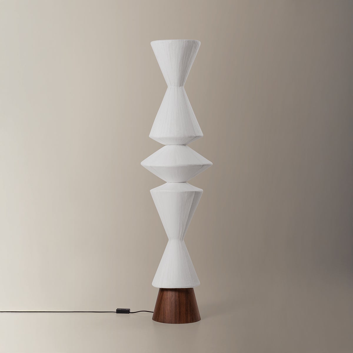 Taking cues from the iconic shapes of artist Isamu Noguchi, the Greendale floor lamp brings a serene sculptural beauty to any space. Its geometric, totemic silhouette has been handcrafted from Japanese paper with a subtle vertical texture that comes to life when illuminated. A wood veneer base provides a sense of grounding in this statement lamp.