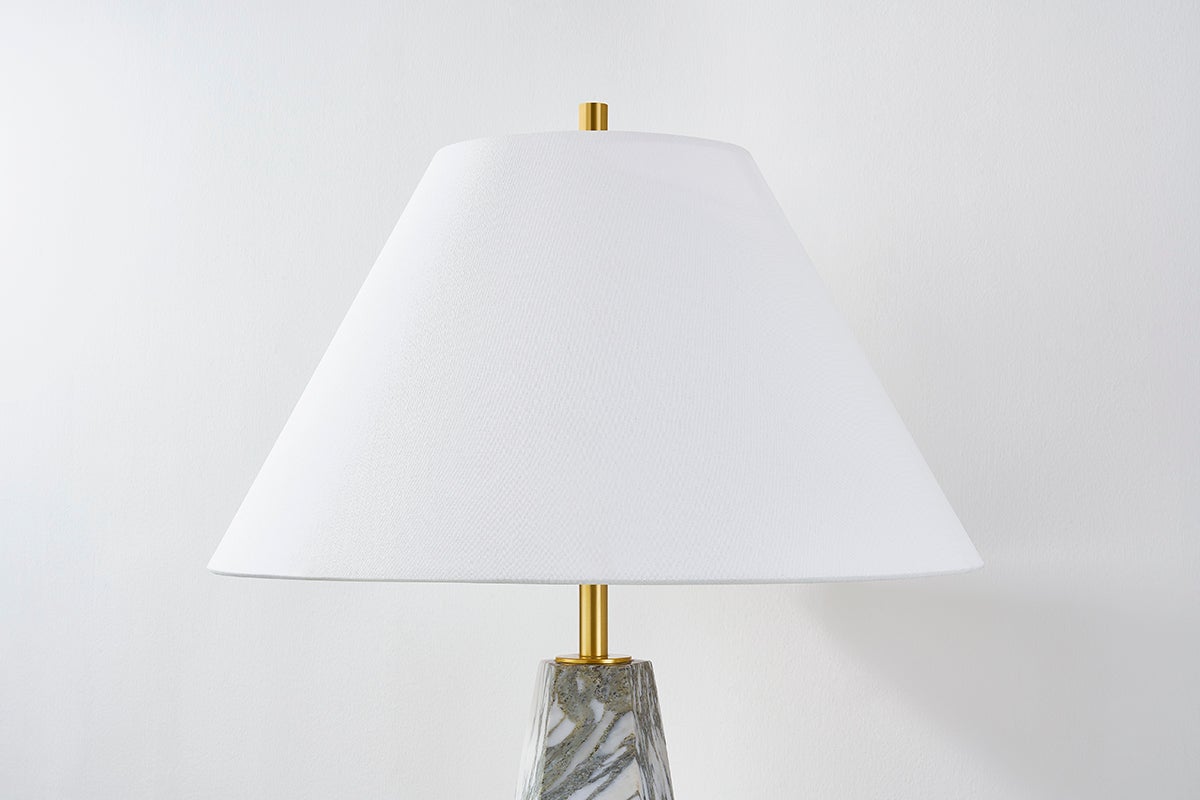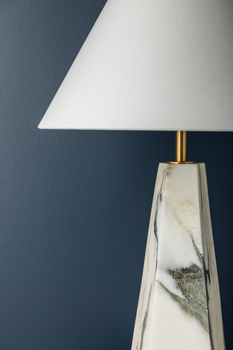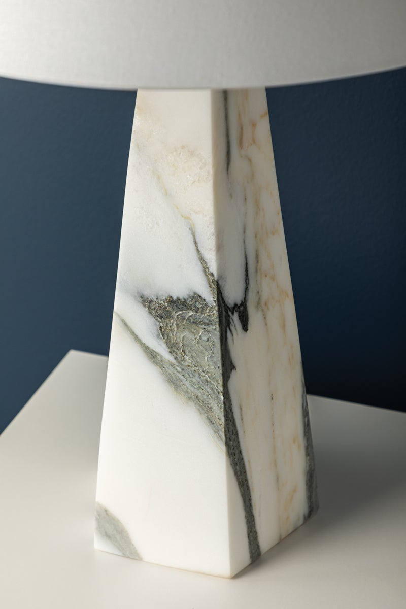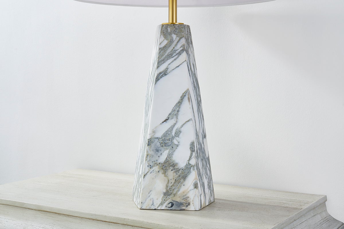 Featuring a pyramid-shaped base of honed Arabescato Corchia marble, the Benicia table lamp stands with a statuesque presence. Evoking a sense of permanence, the polished stone contrasts with the soft white linen of the shade. A slender Aged Brass neck adds the finishing touch � a contemporary update to a timeless beauty.