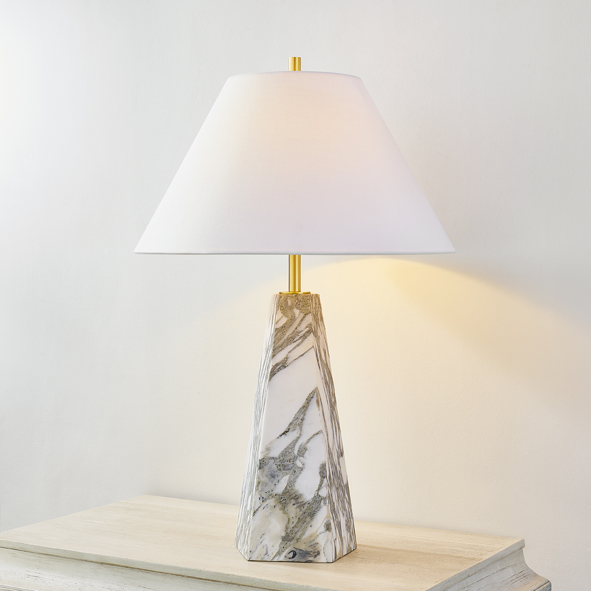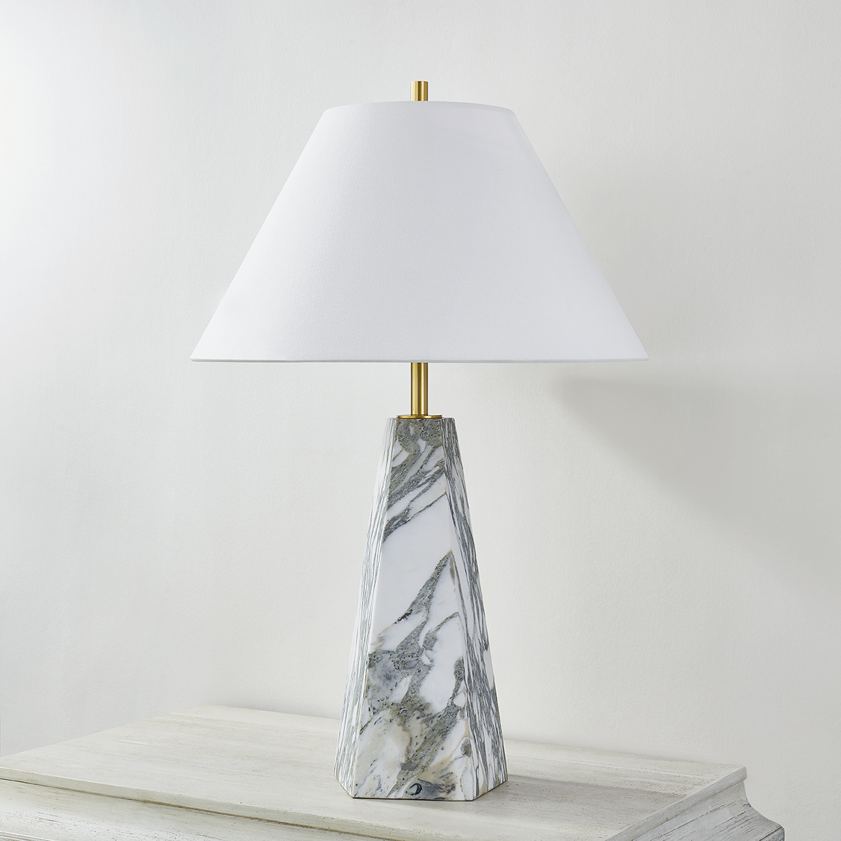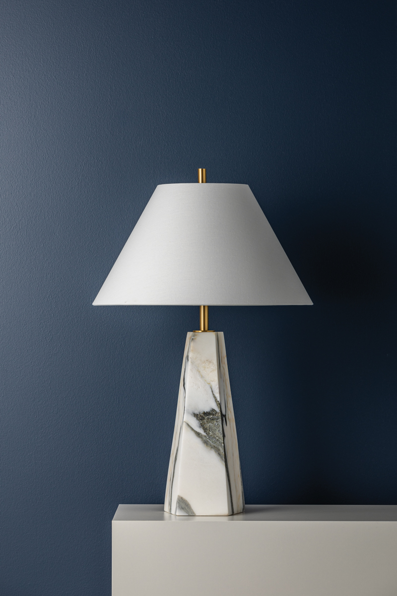 Featuring a pyramid-shaped base of honed Arabescato Corchia marble, the Benicia table lamp stands with a statuesque presence. Evoking a sense of permanence, the polished stone contrasts with the soft white linen of the shade. A slender Aged Brass neck adds the finishing touch � a contemporary update to a timeless beauty.