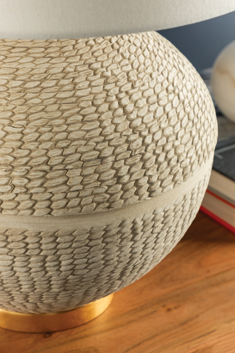 Drawing inspiration from a woven water hyacinth basket, the Katonah lamp is a delightful trompe l’oeil. Partway down the ceramic base, a pronounced ridge separates the textured, rope-like patterns, delineating the space where a basket and lid would converge. This clever design is complemented by an oversized linen shade and accents of Gold Leaf at the base.
