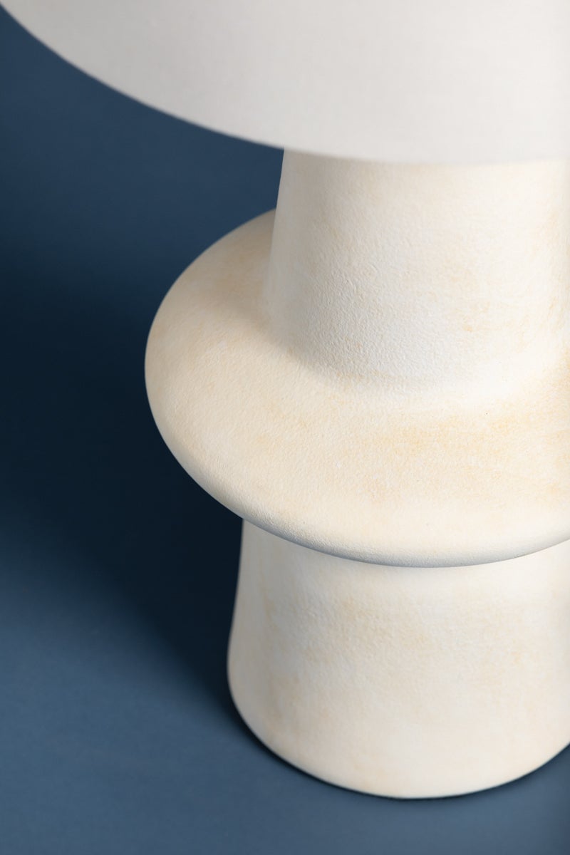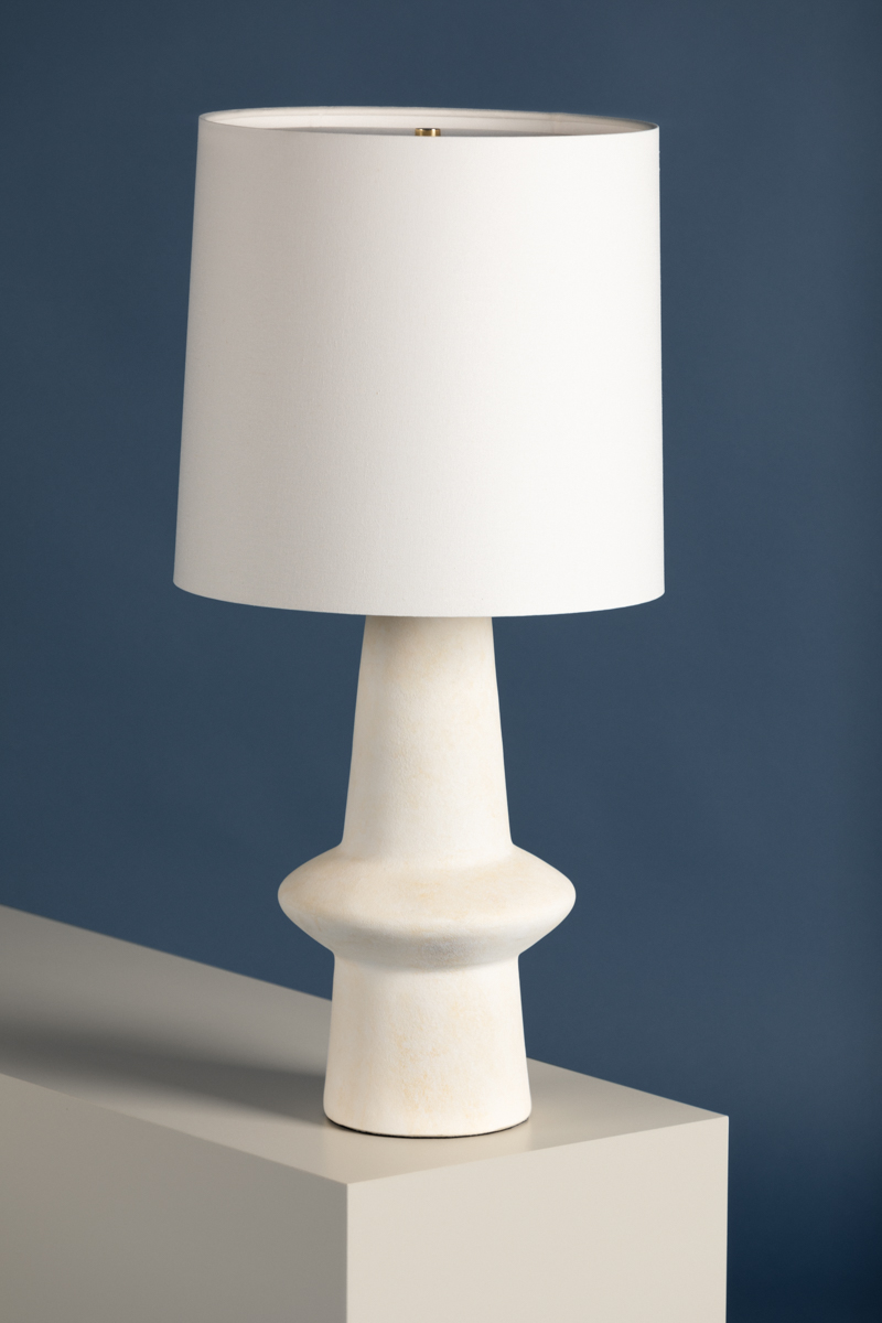 Clean lines, a sleek silhouette and an all-white color scheme make this modern table lamp extremely useable on surfaces throughout the home. The ceramic pale flax base adds a warm, earthy element and a subtle texture.