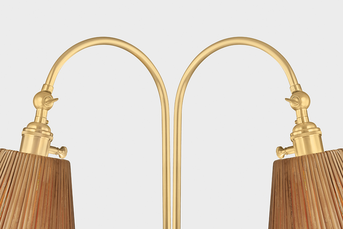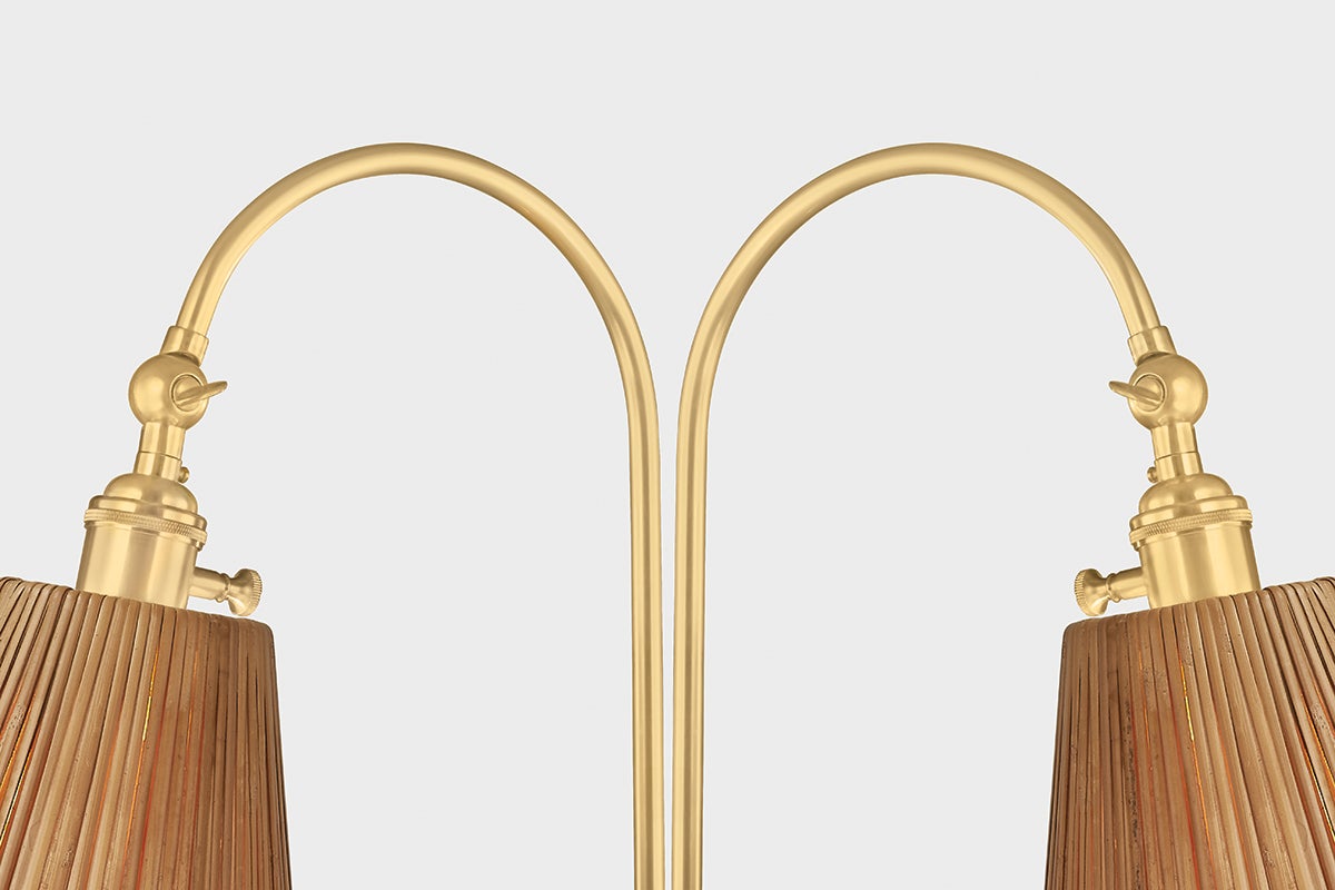 The Ruthin family combines swooping metalwork with natural rattan to create playful everyday basics. The floor lamp taps into the trend of two-light silhouettes, adding swivel heads for precise, directional lighting. To match the shades, the lamp’s base is wrapped in rattan. Ruthin is also available as a single-light sconce with a gestural gooseneck arm supporting the shade. Aged Brass metalwork adds a subtle note of shine to these designs.