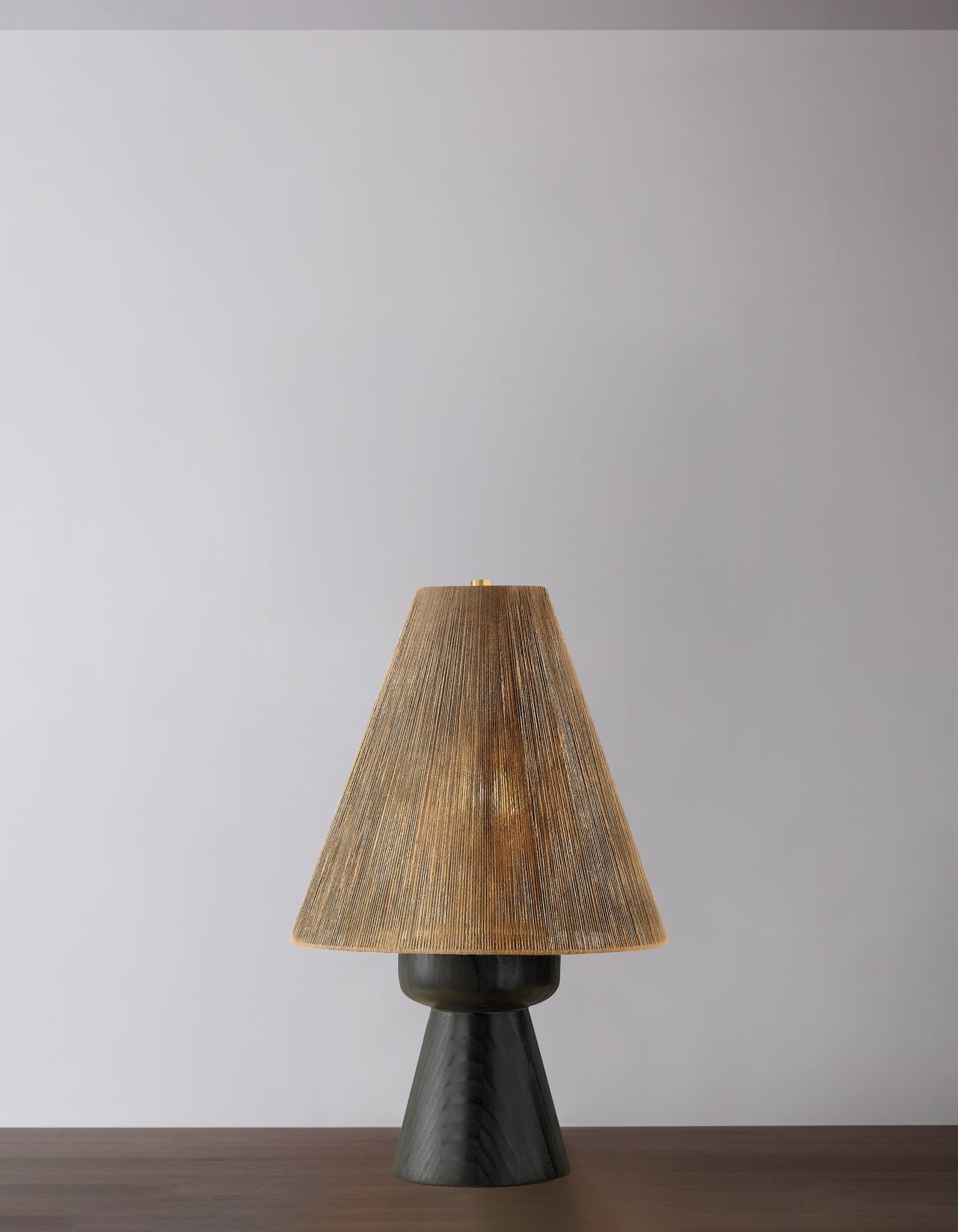 A unique approach to shading, clever play on proportions, and intriguing use of textures make the Mannsville table lamp a worthy conversation piece. Carved from Black Pine Wood, the tapered base gives the lamp a rich, organic aesthetic. This foundation contrasts beautifully with the jute string shade, creating an interplay of light and dark that is accented by an Aged Brass finish on the hardware. The oversized shade makes the base appear smaller, adding drama to desks and consoles.