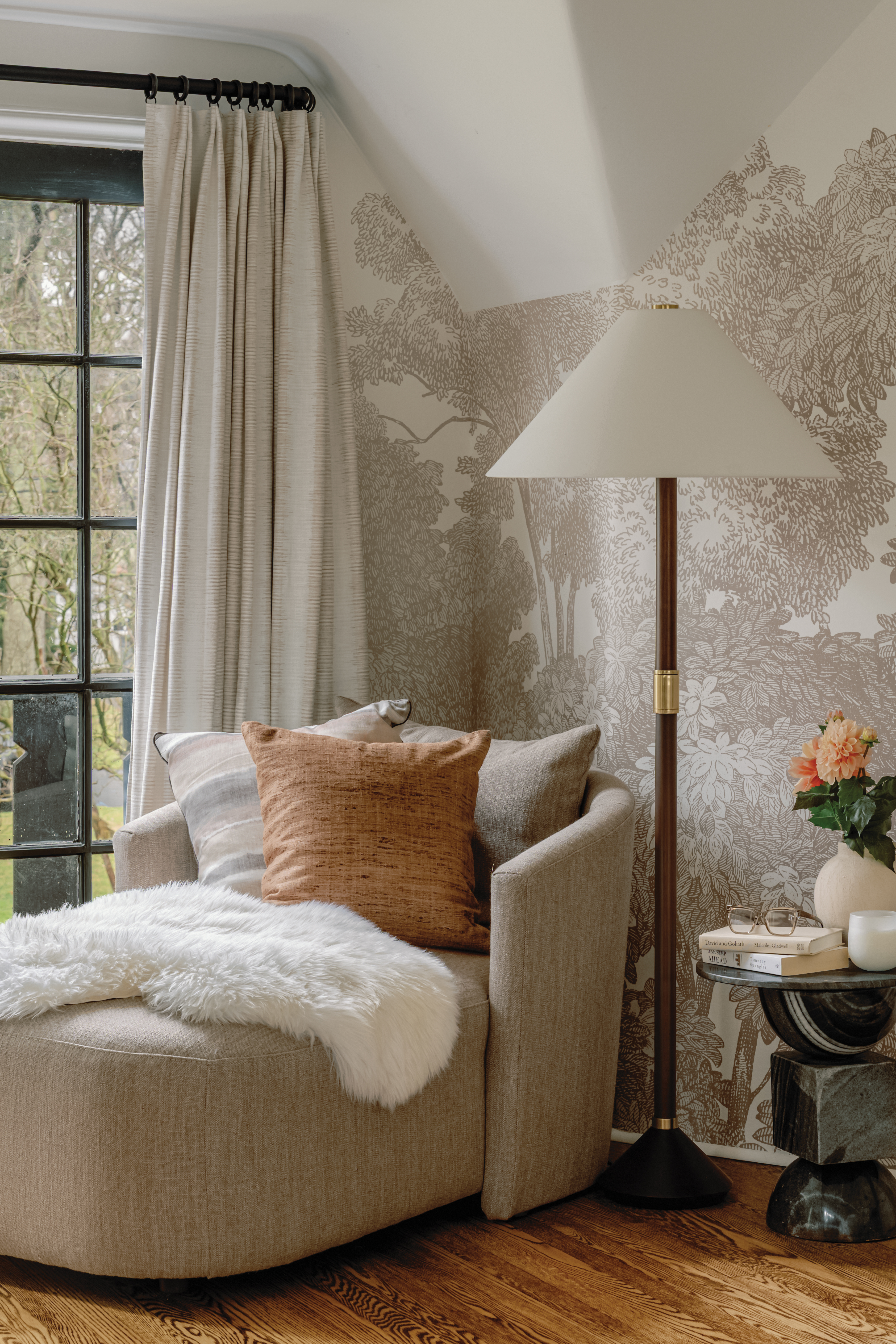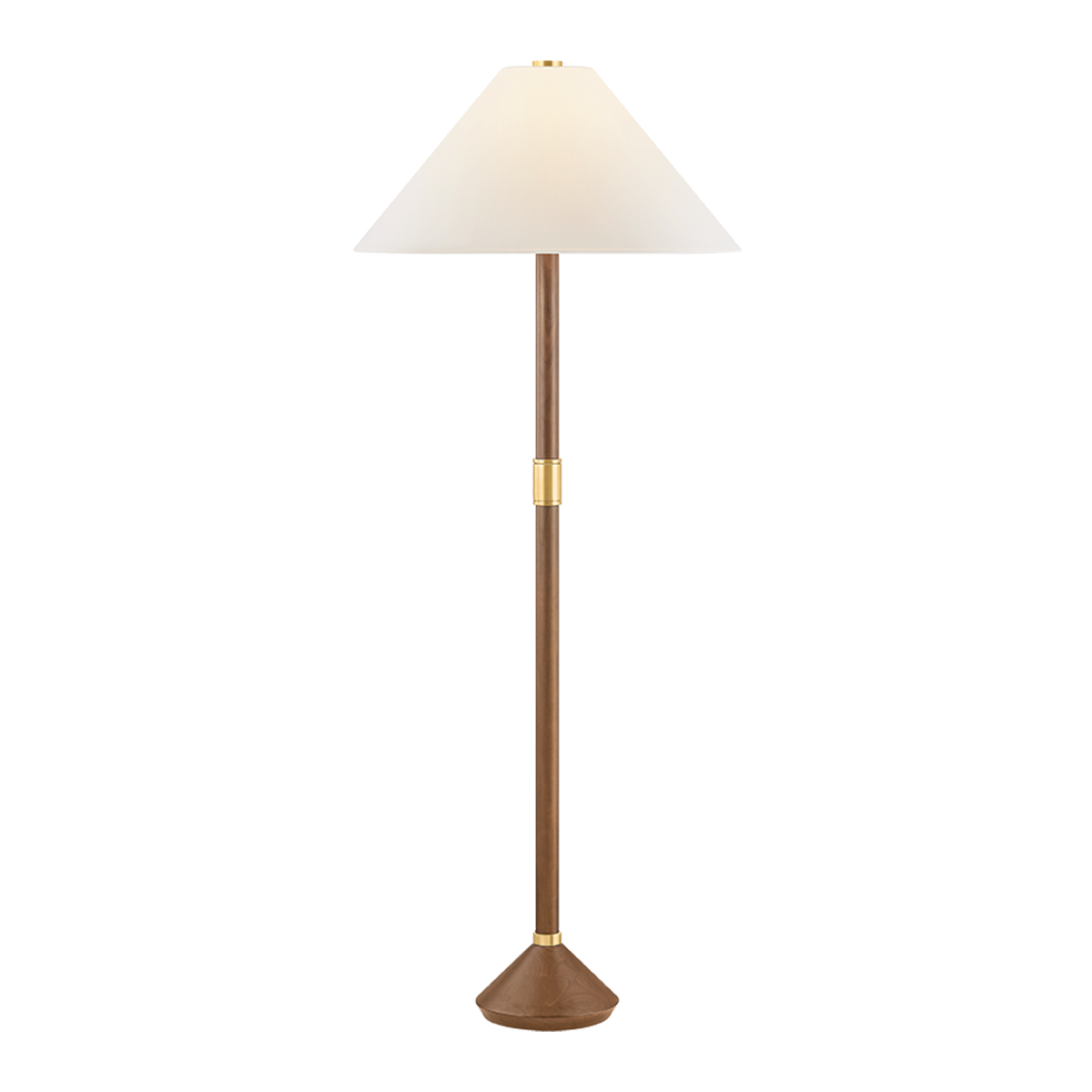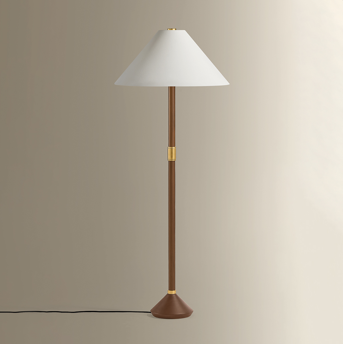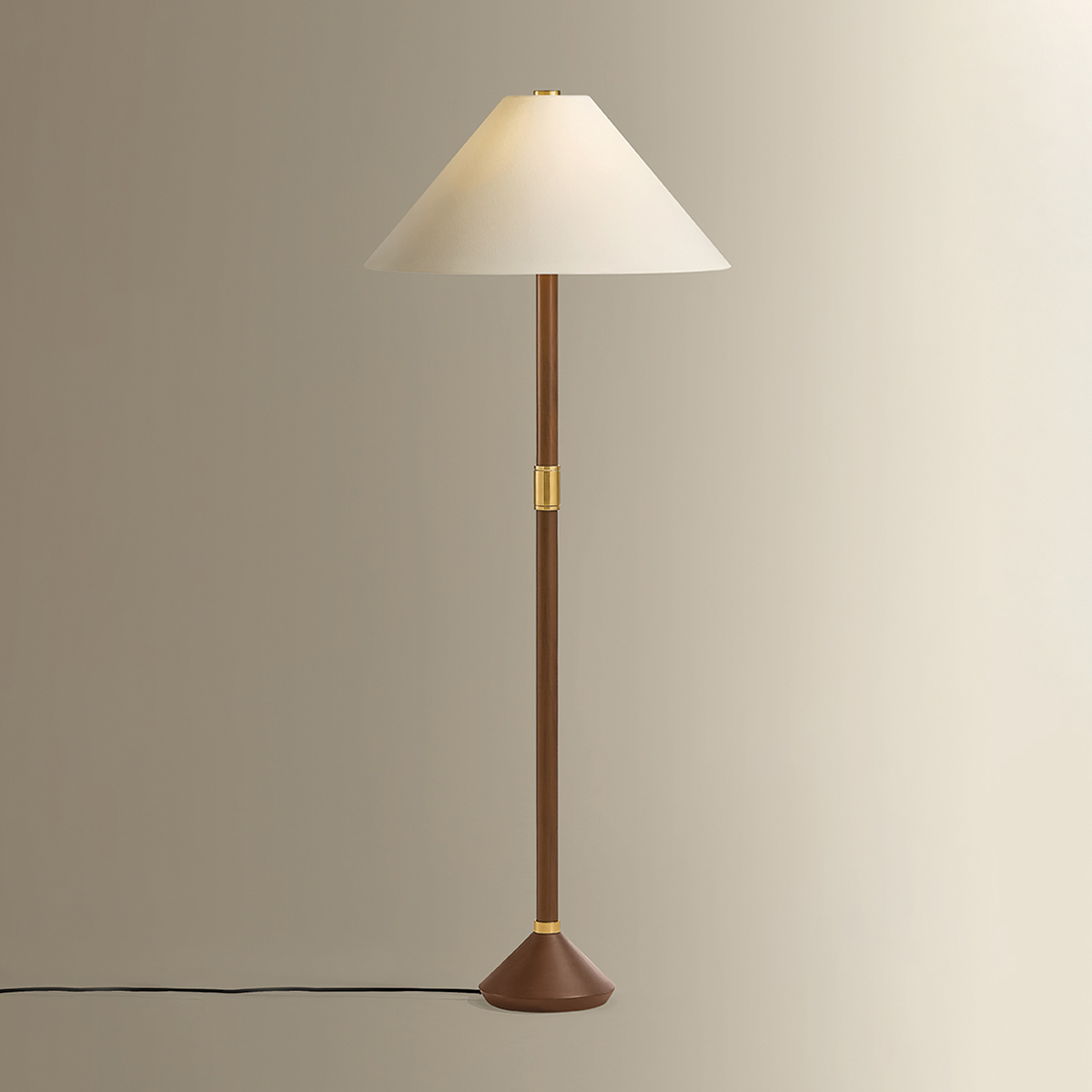 Guided by a thoughtful curation of materials, the Merrimack floor lamp pairs the natural grain of walnut wood with a timeless tapered white linen shade. At the base and midpoint, Aged Brass cuff accents add a jewelry-like detail, reminiscent of stacked rings. The organic patterning of the wood lends a dose of character to the heritage silhouette.