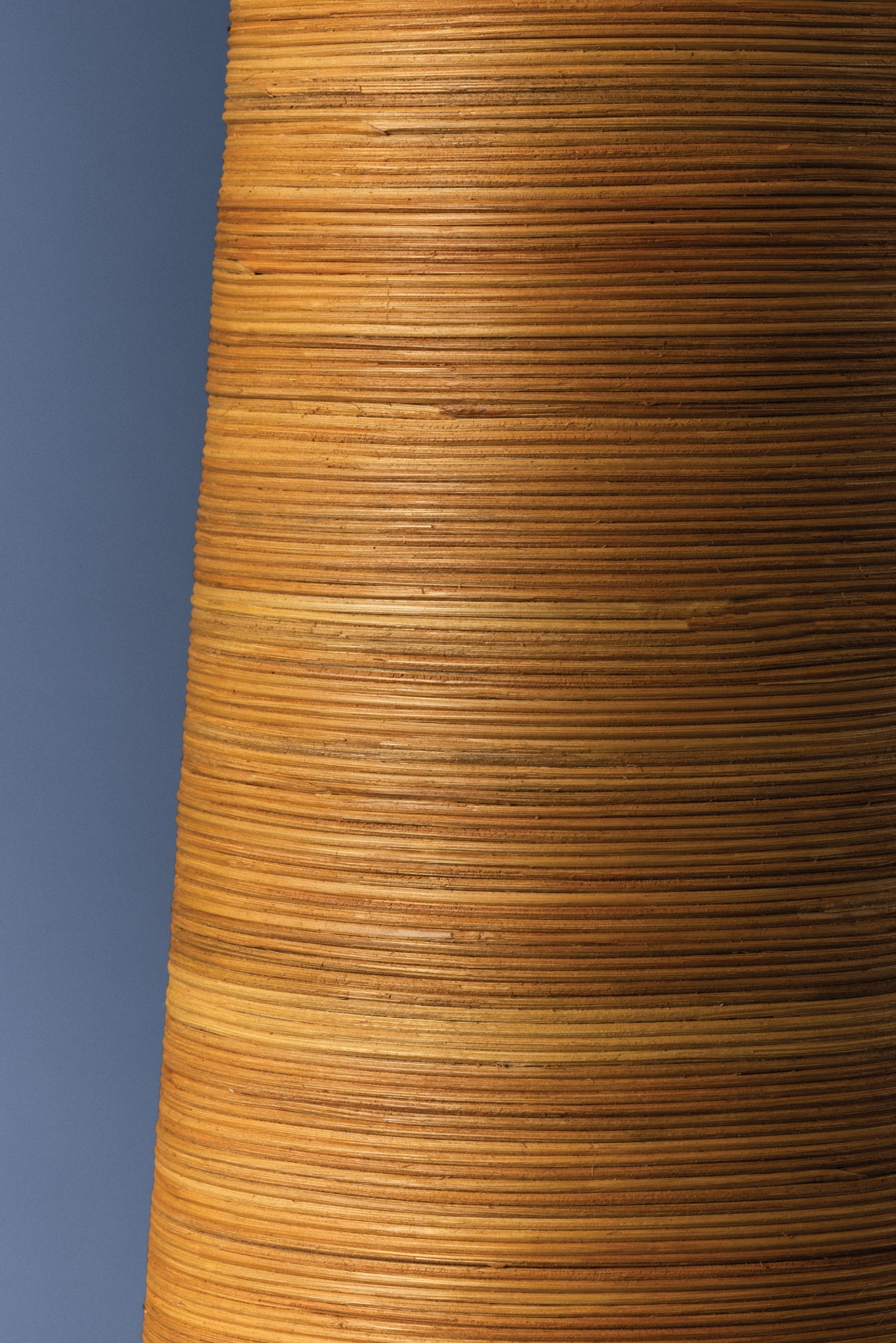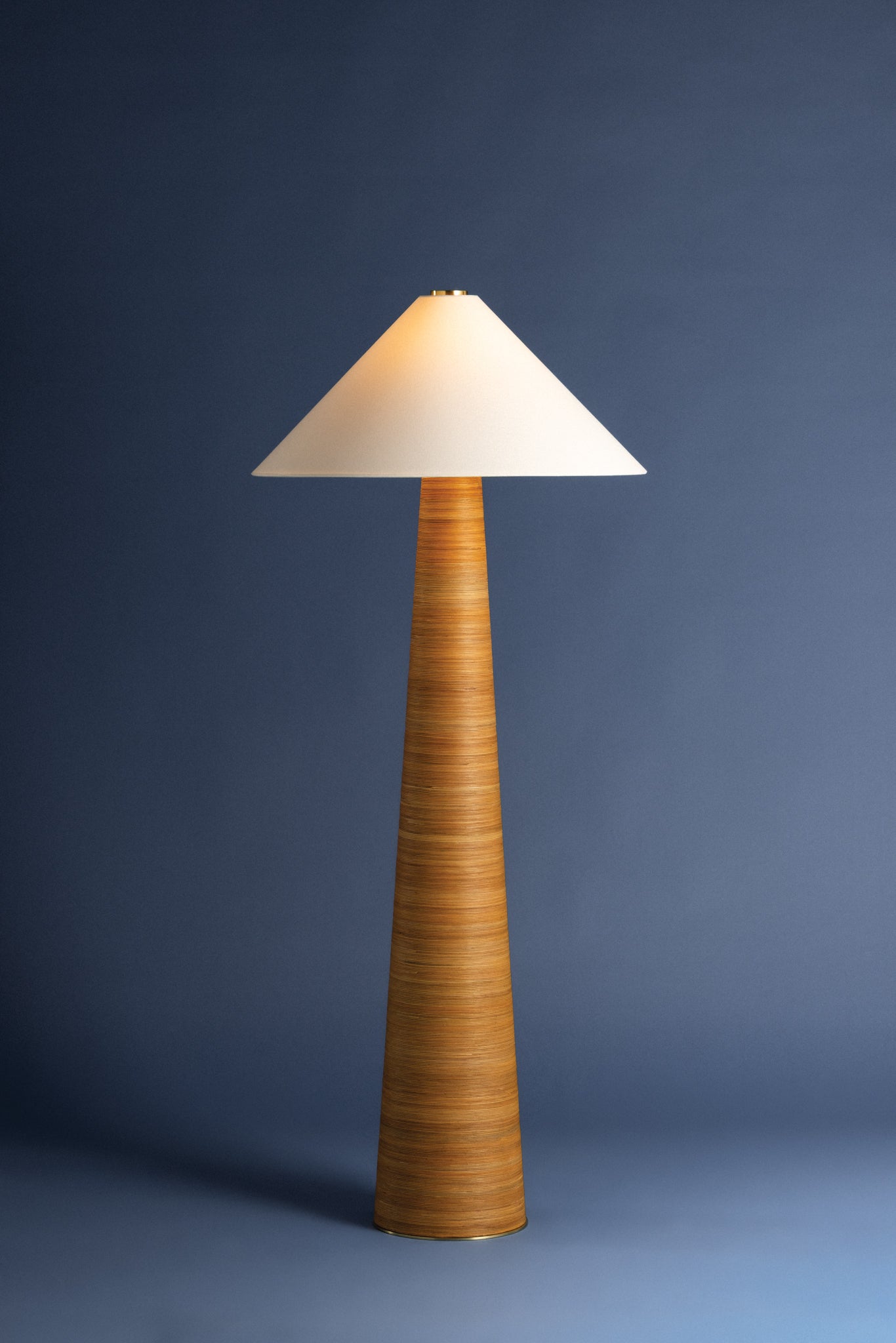 Modern tapered silhouettes are wrapped in the natural richness of rattan in the Haviland family. As either a floor or table lamp, the designs call to mind the shape of a palm tree, topped by a crisp white linen shade. An Aged Brass rim contributes a subtle shine at the base of each design-forward light.