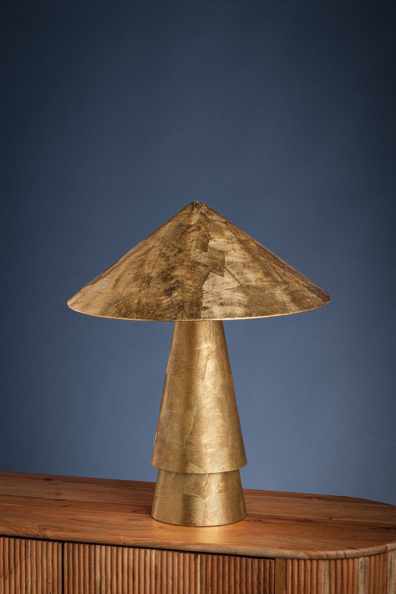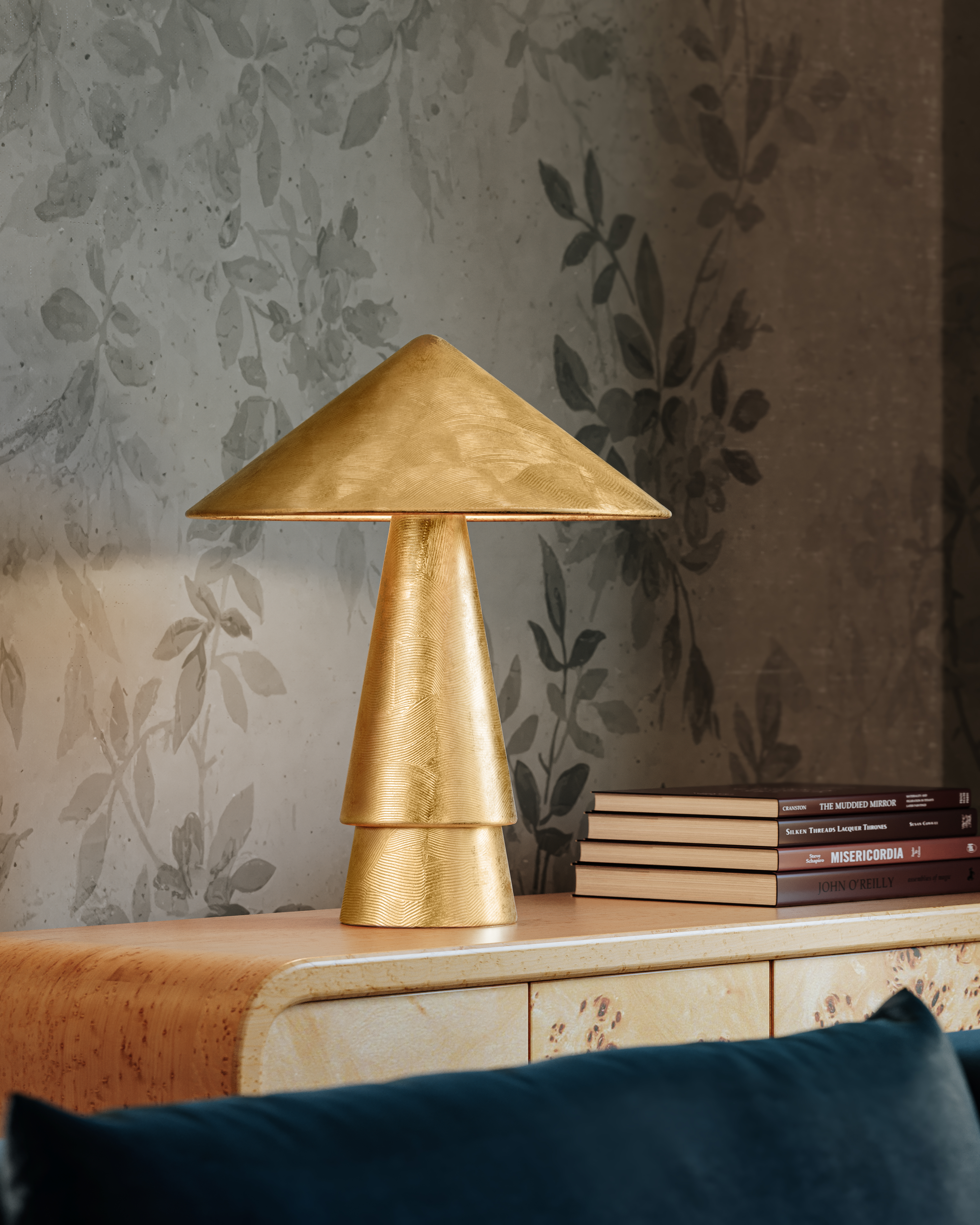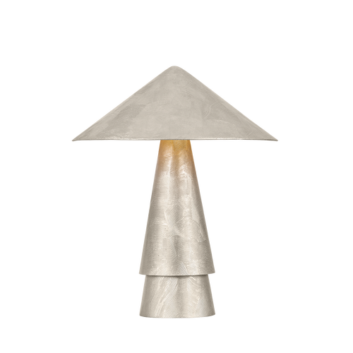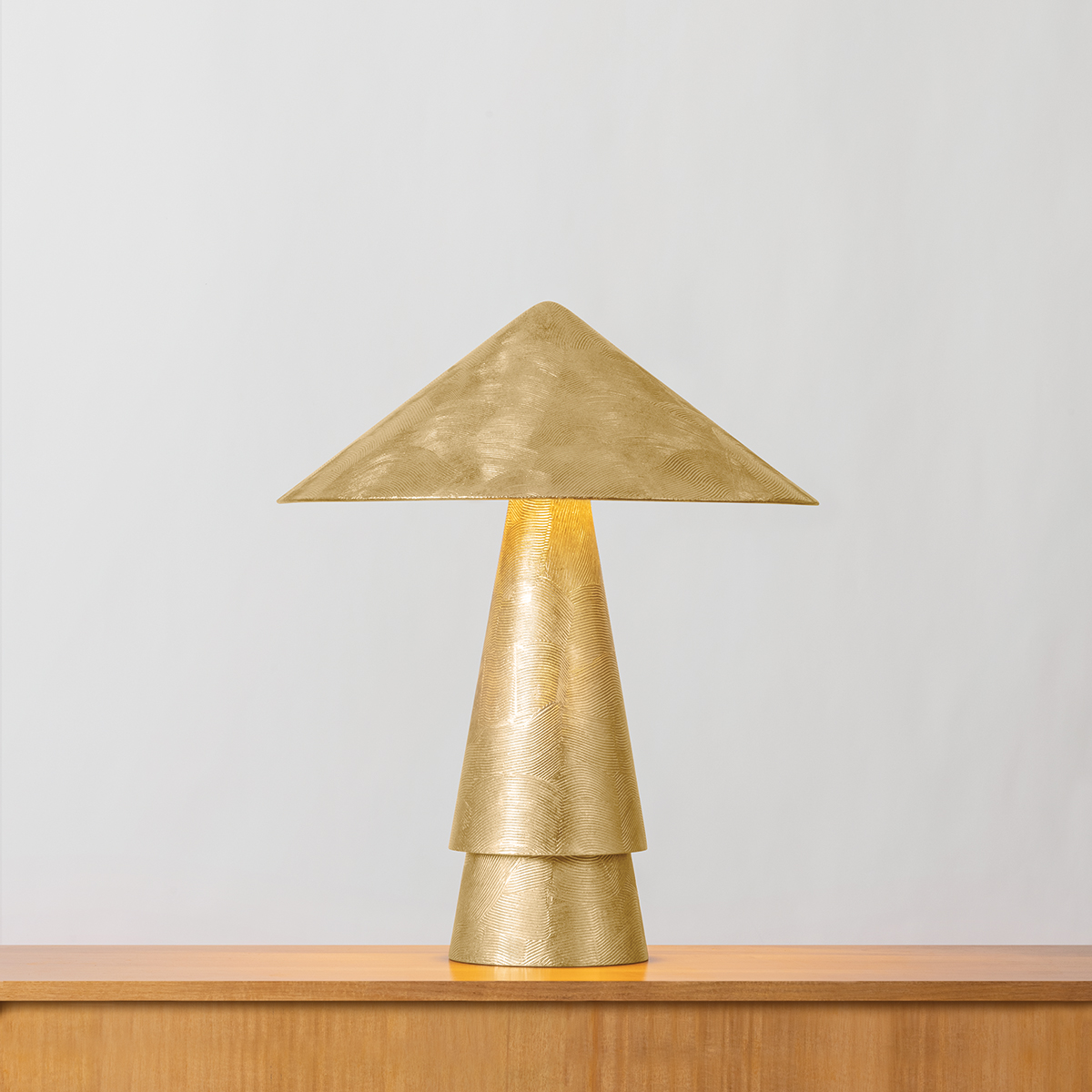 Inspired by antiquities, the Foxton table lamp cuts a bold figure with artistic geometry and textural finishes. The conical stacked base and pyramid-shaped shade provide a striking reimagination of a classic table lamp silhouette. Available in either troweled Vintage Gold Leaf or troweled Warm Silver Leaf finishes, Foxton’s allover materiality amplifies its statuesque presence.