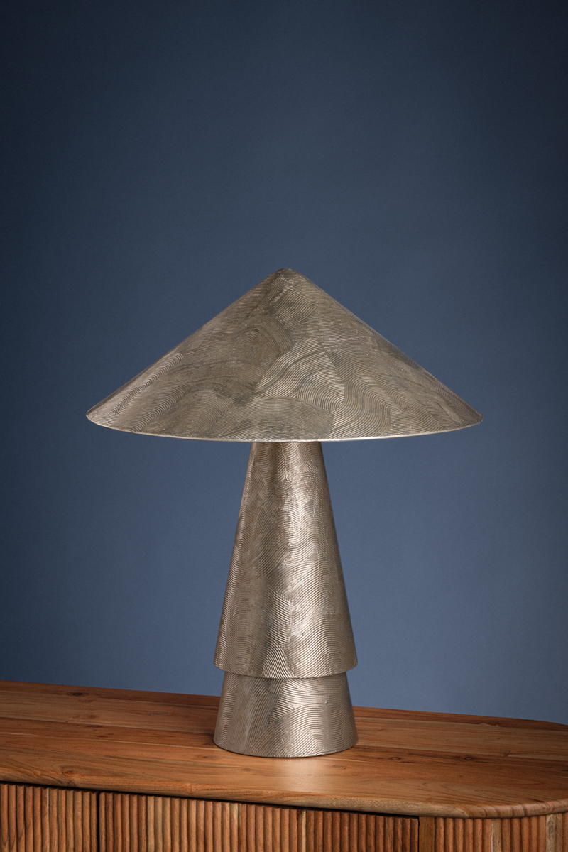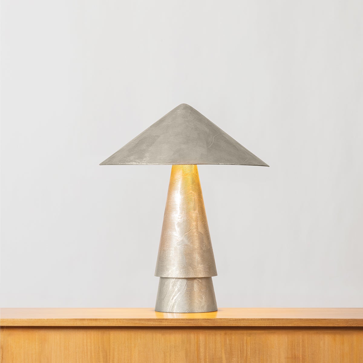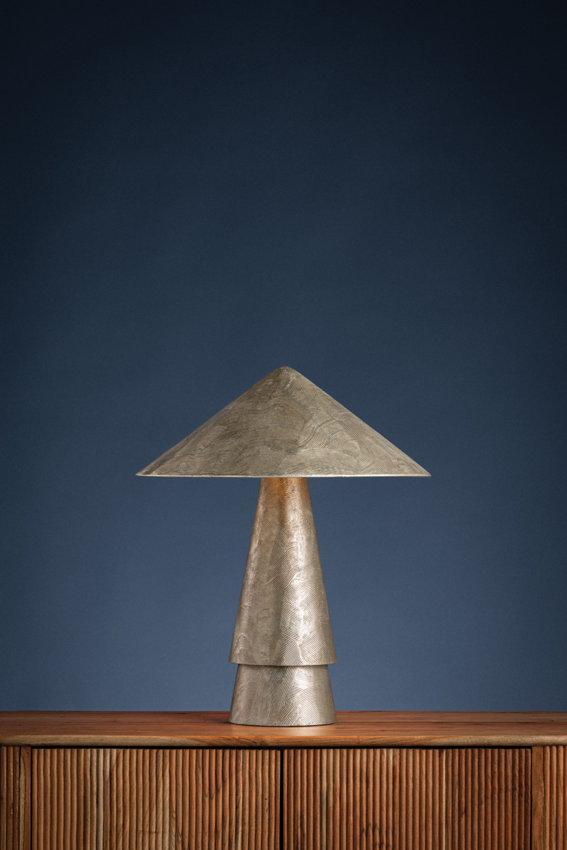 Inspired by antiquities, the Foxton table lamp cuts a bold figure with artistic geometry and textural finishes. The conical stacked base and pyramid-shaped shade provide a striking reimagination of a classic table lamp silhouette. Available in either troweled Vintage Gold Leaf or troweled Warm Silver Leaf finishes, Foxton’s allover materiality amplifies its statuesque presence.