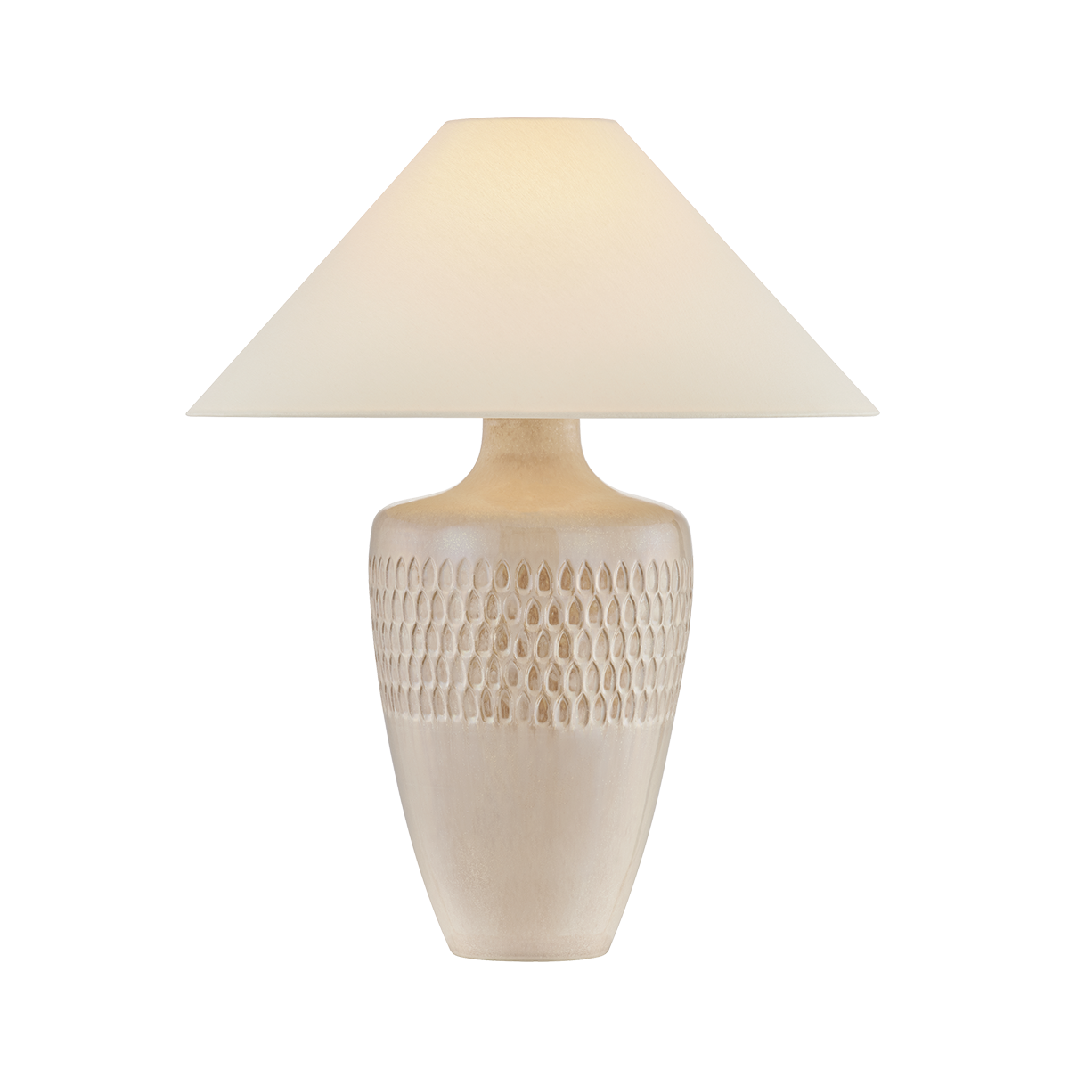 The neutral reactive glaze, botanically-inspired indentations, and classic urn shape of the Valleydale lamp make for a soothing modern staple. Rows of tear-shaped ‘leaves’ set the primary base pattern while understated texture and painterly interest stem from the Reactive Manchado Glaze. To complete this calming lamp, an off-white linen shade adds a soft, elegant finish.