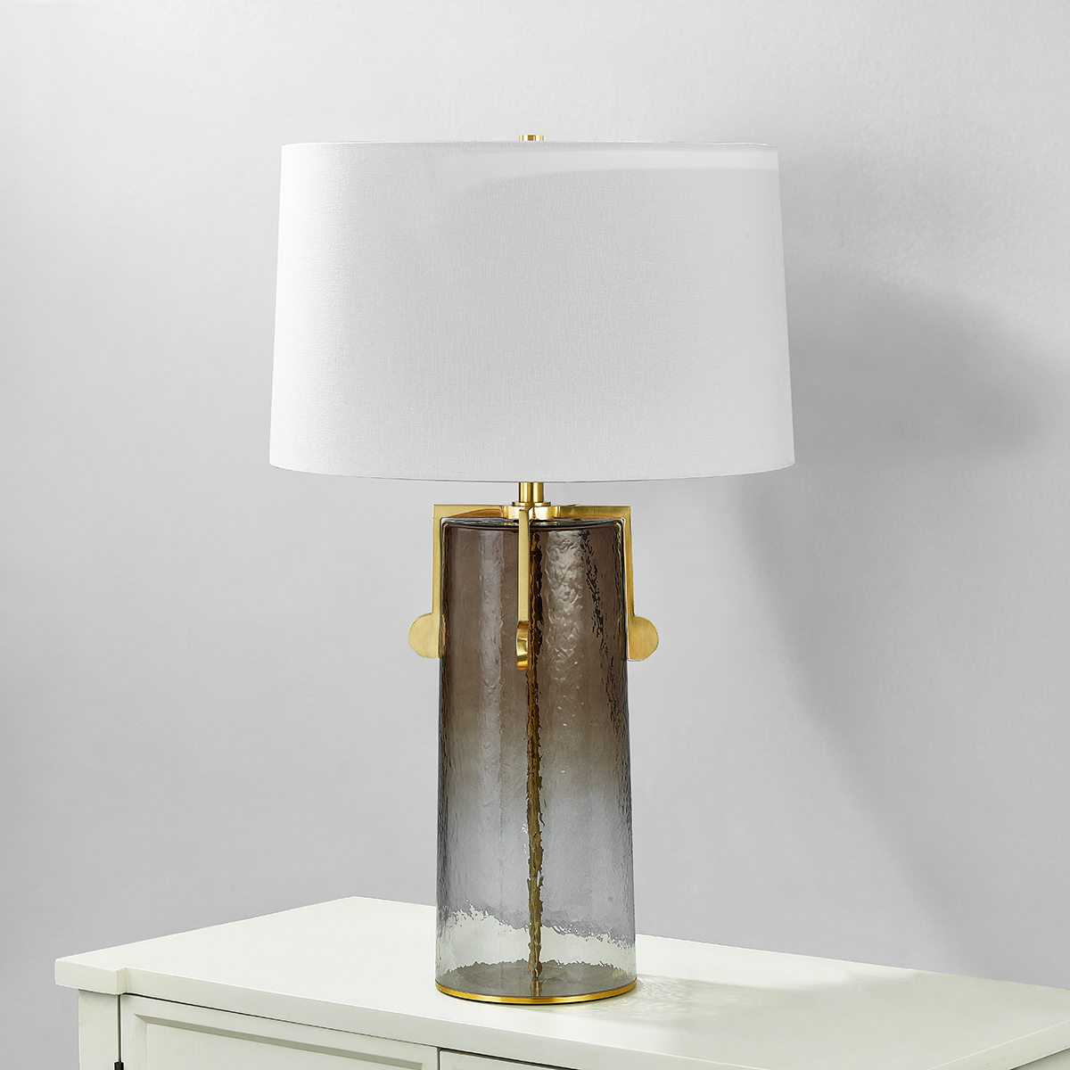 Taking inspiration from bespoke hardware details found on high end furniture, Wildwood makes a statement that is equal parts tailored and poetic. A smoky ombre glass base provides the perfect amount of transparency to appreciate the clean lines and circular forms of the Aged Brass metalwork. A large white linen drum shade balances the ethereal quality of this statement lamp.