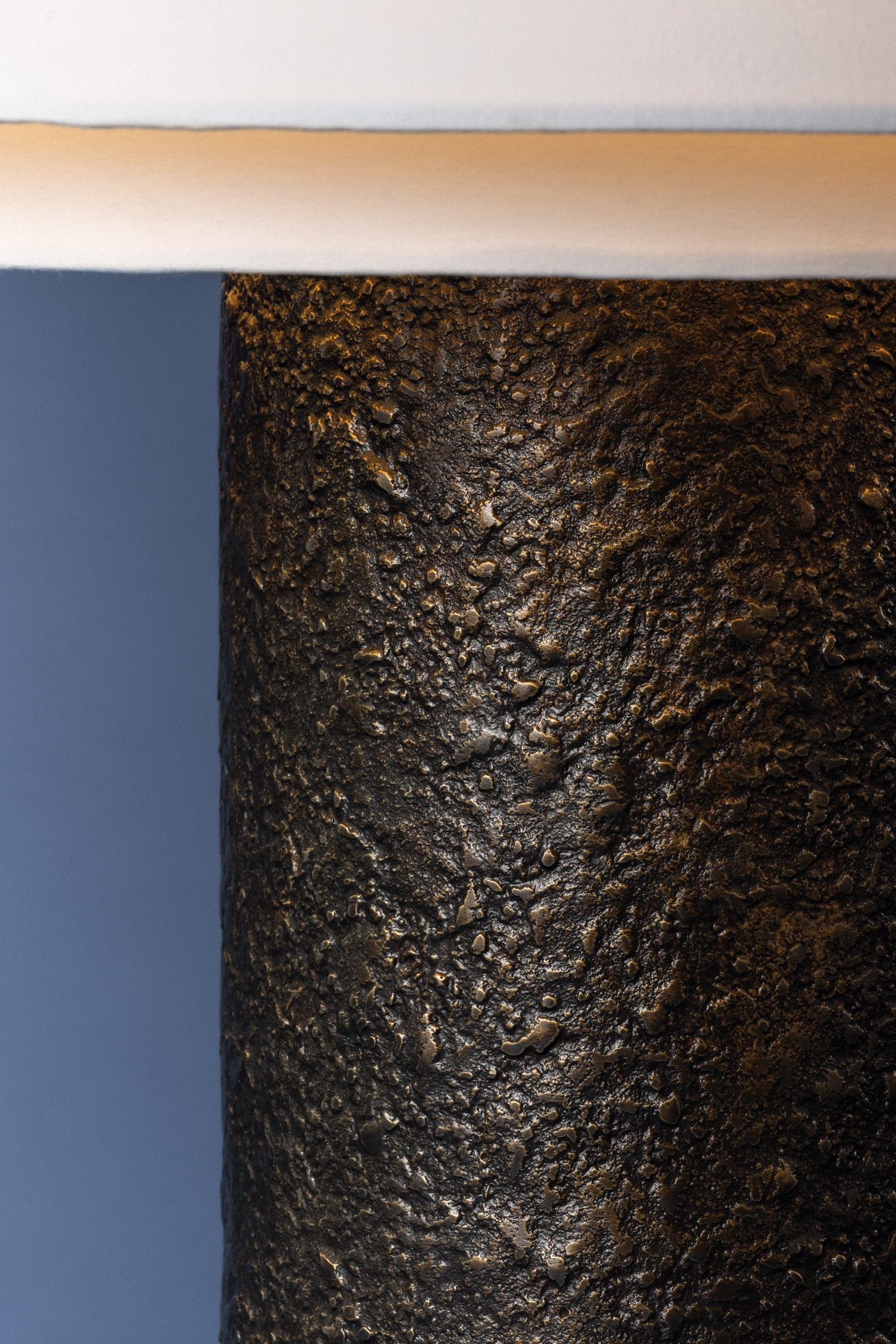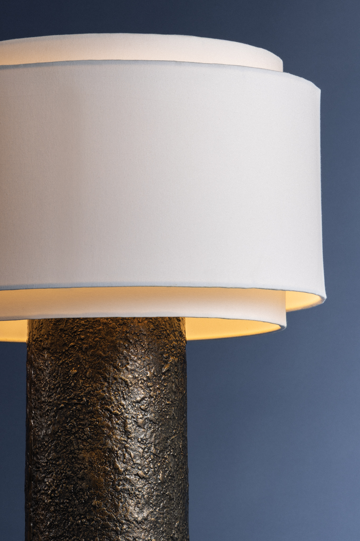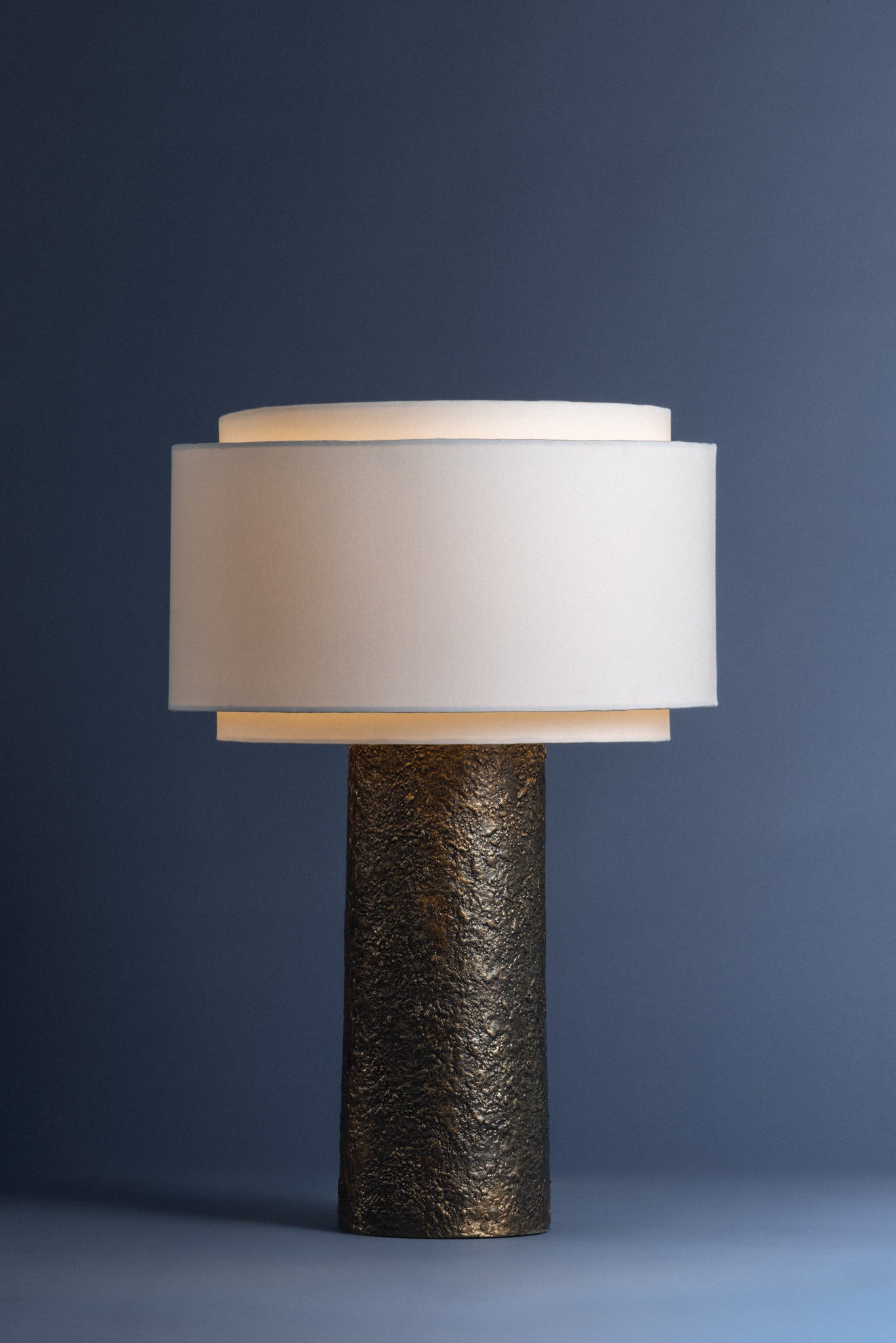 The Ashburton table lamp is a substantial statement piece for earthy interiors. Giving the base a grounded feel, the cast aluminum silhouette is marked by bronze patina highlights and surface imperfections recalling natural stone. A two-layer white linen shade adds an architectural element to complement the tactile base. A stunning addition to a side table or console, Ashburton’s quiet stature is enduring.