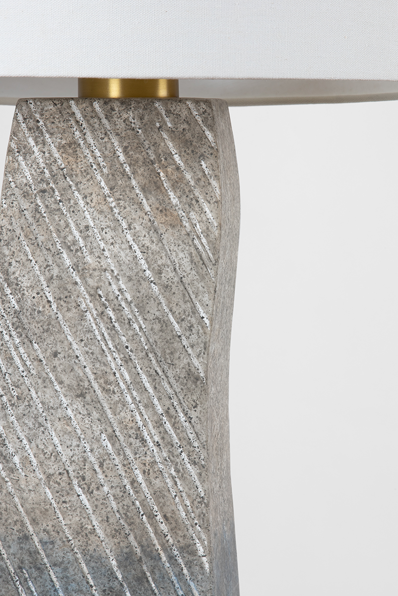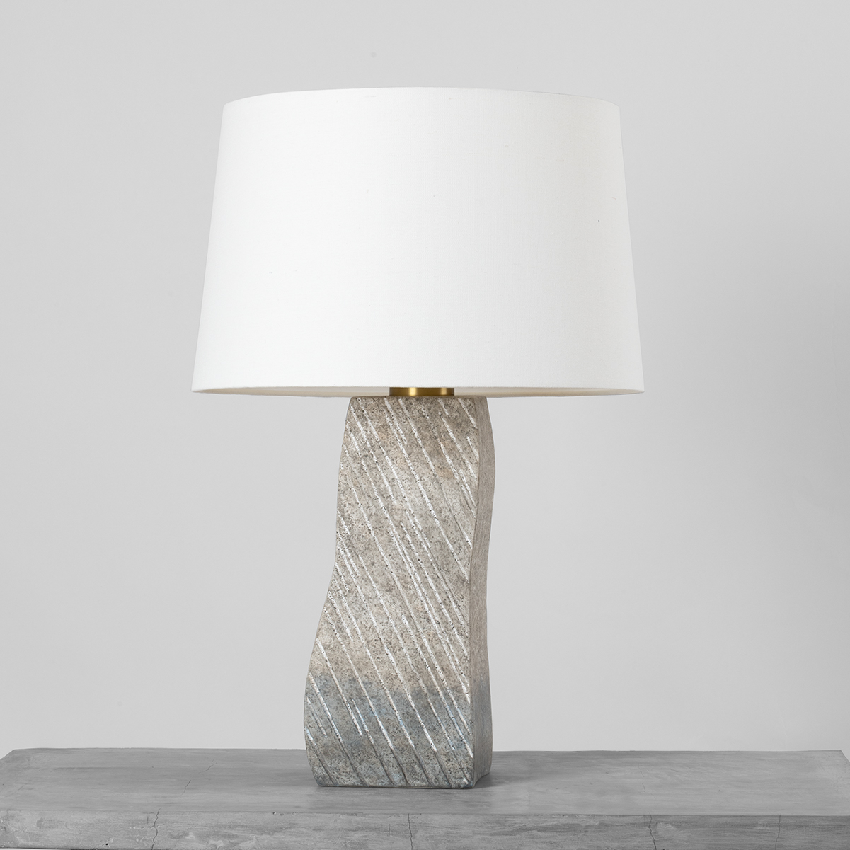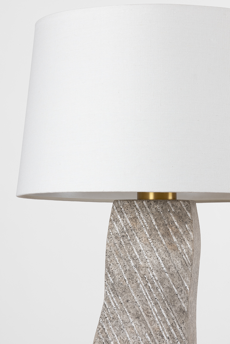 Doubling as a sculpture, Raiden features a fluted windswept ceramic body with a grained white linen shade. Running on a soft upwards diagonal, each ridge on the highly tactile surface catches the light to create depth and shadows. A Vintage Gold Leaf neck adds a polished finishing touch.