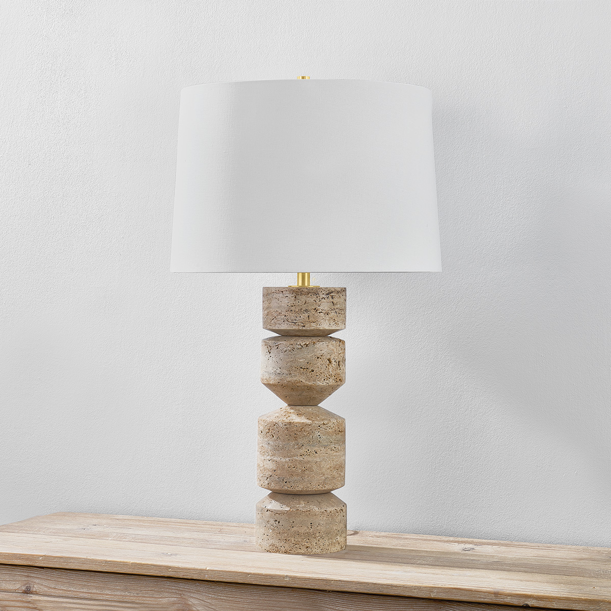 A fresh spin on a totemic design, Galeville is carved from striking natural travertine. While design-forward, the irregular stacked forms are both artistic and accessible. Completed with Aged Brass hardware and topped by a white linen shade, this versatile lamp easily complements modern, vintage, and farmhouse-style homes.