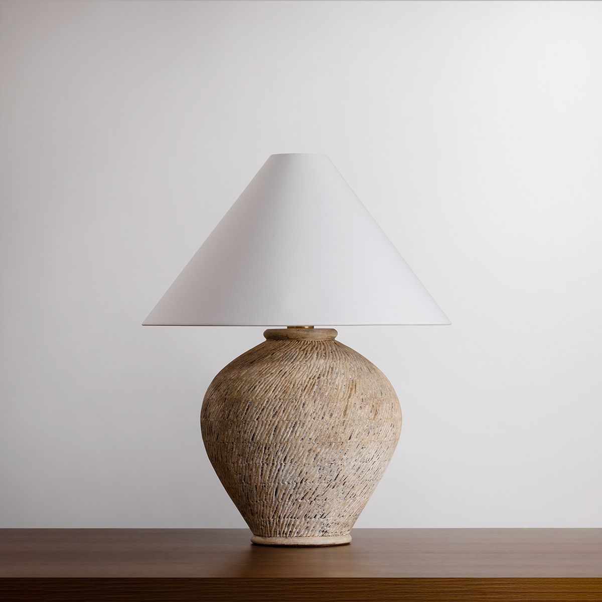 A textural delight, Rumbrook features a tactile ceramic base with an etched treatment across its naturally porous surface. The unique base allows light and shadow to play within the grooves, creating a visually dynamic statement piece. A white linen shade tops this table lamp, adding a classic, fresh note to balance the earthy base.