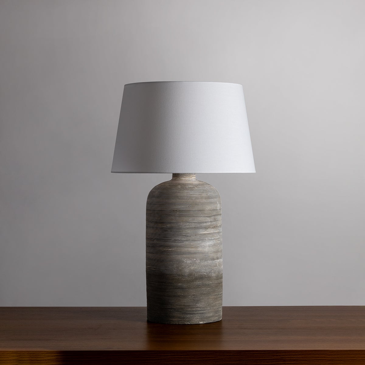 Characterized by a rich ombre finish, Sutton Manor is a serene interpretation of a classic table lamp silhouette. The elongated shape of the ceramic base is balanced by a large tapered white linen drum shade. Finished with Aged Brass hardware, this timeless treasure fits seamlessly in modern or contemporary interiors.