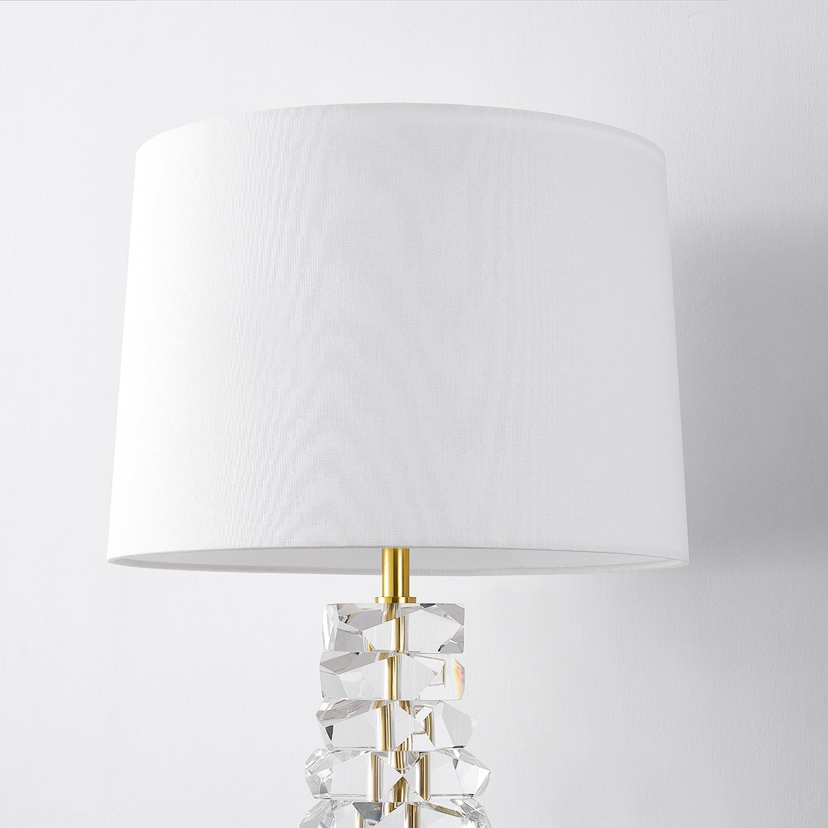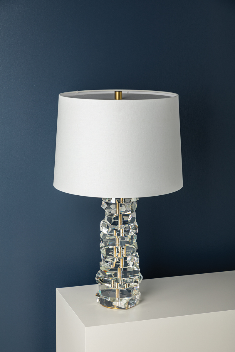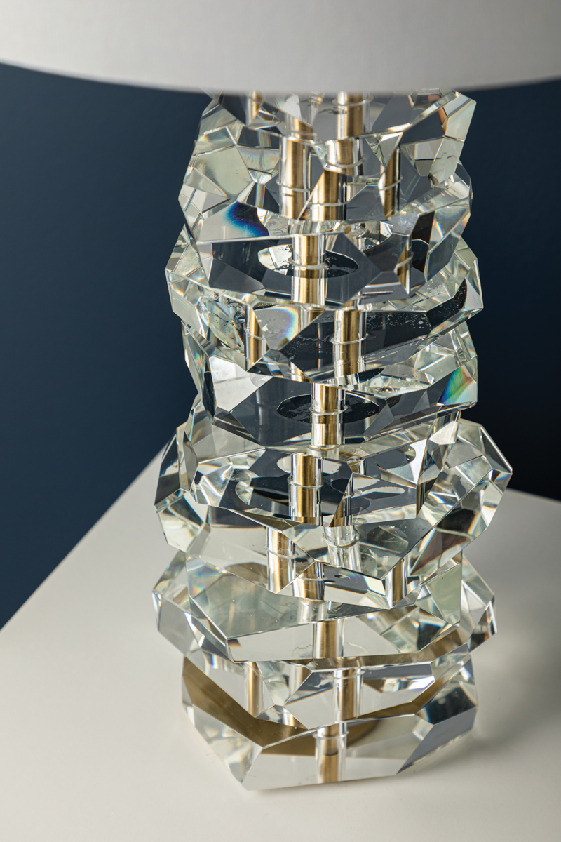 Reminiscent of sparkling diamonds or a tower of ice cubes, this luxurious table lamp is a celebration of artisanship. Composed of stacked crystals, it sparkles when lit, reflecting and refracting light in all directions. The elegant and timeless white linen shade balances the opulent nature of the crystal base.
