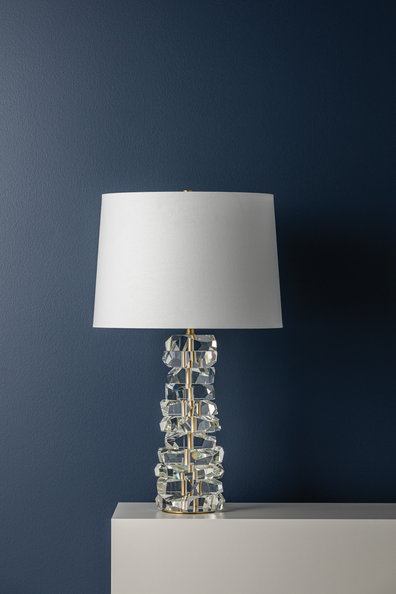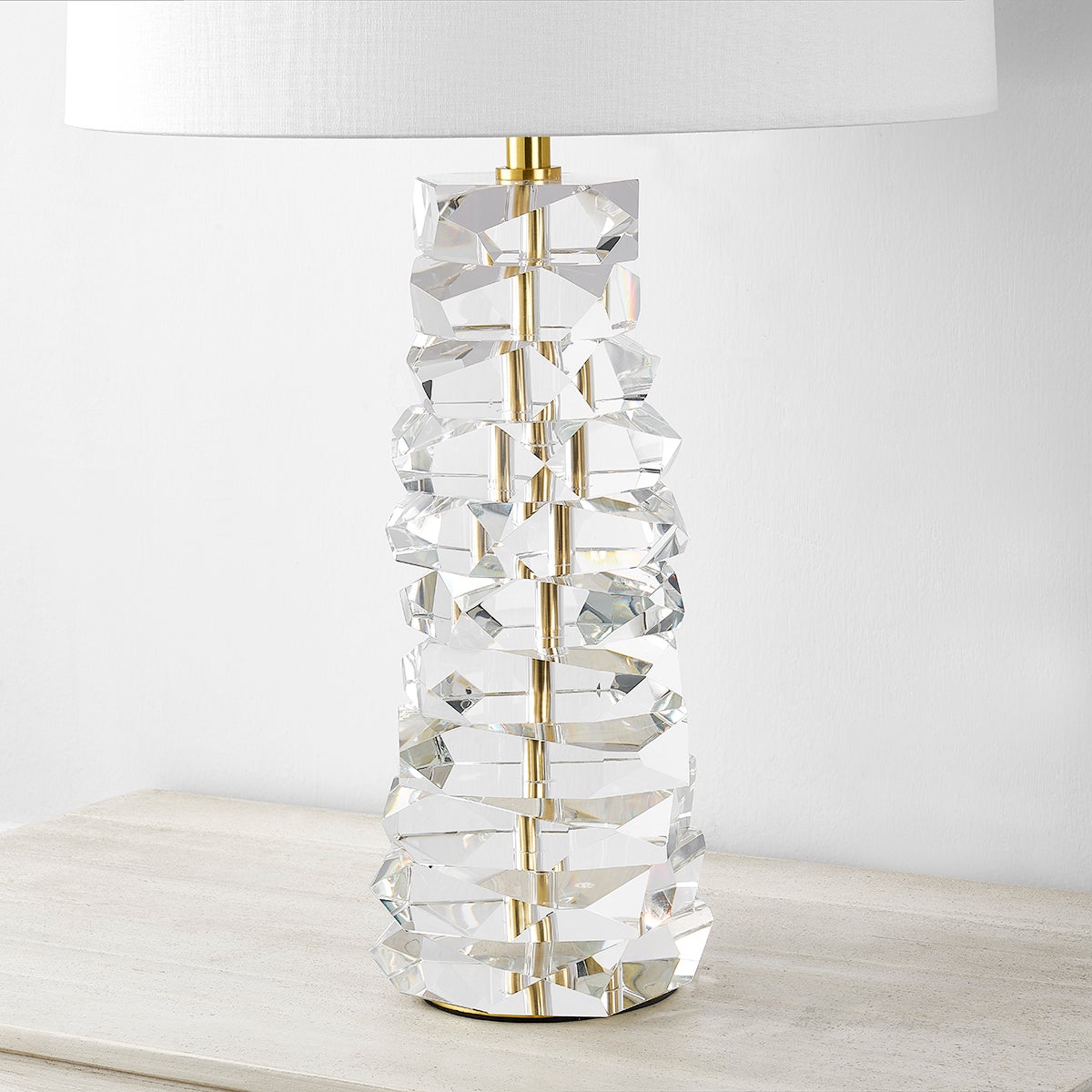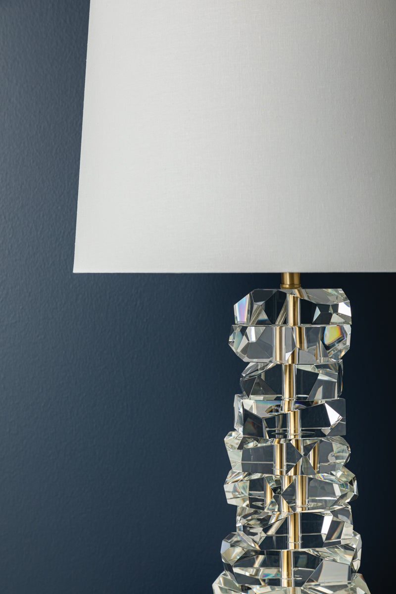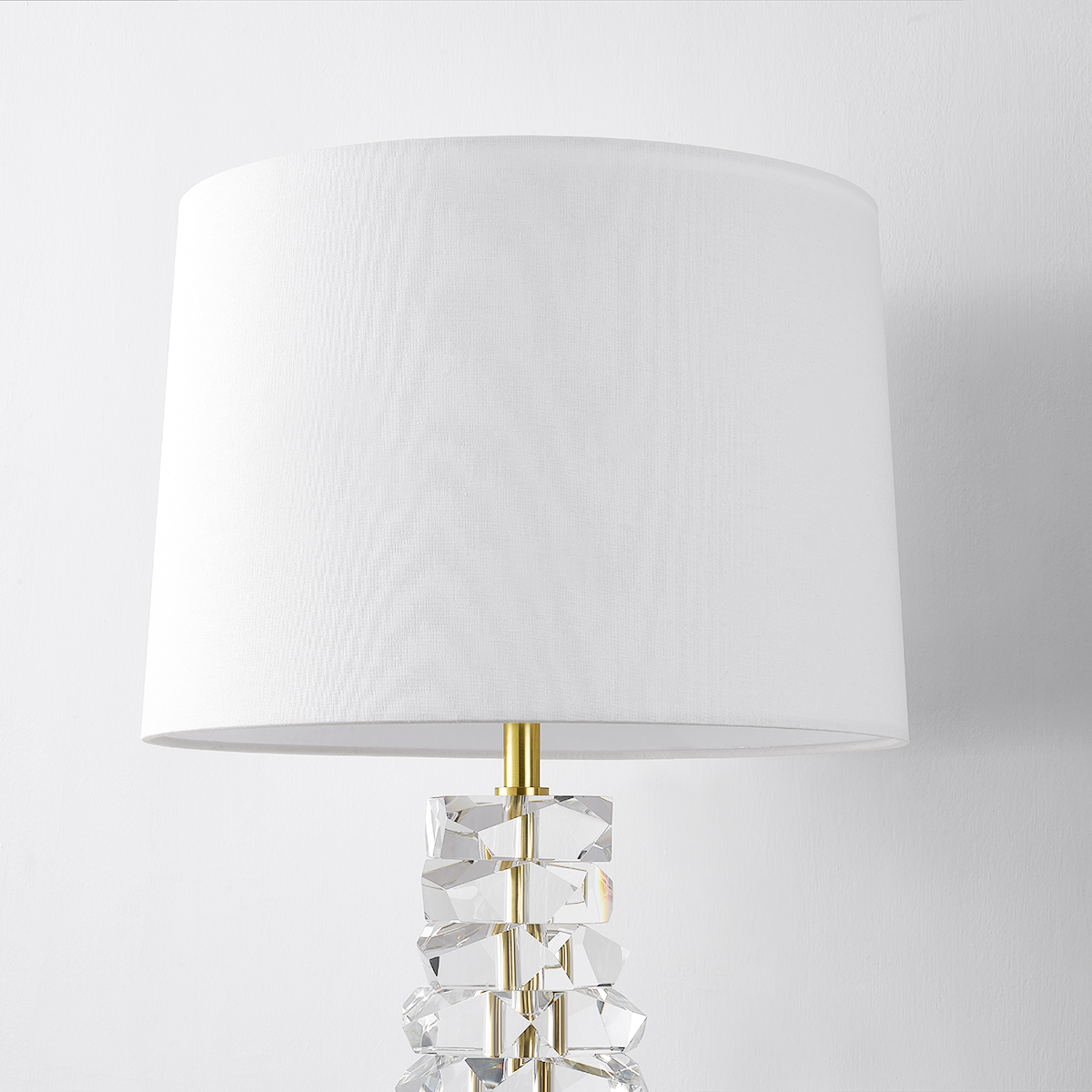 Reminiscent of sparkling diamonds or a tower of ice cubes, this luxurious table lamp is a celebration of artisanship. Composed of stacked crystals, it sparkles when lit, reflecting and refracting light in all directions. The elegant and timeless white linen shade balances the opulent nature of the crystal base.