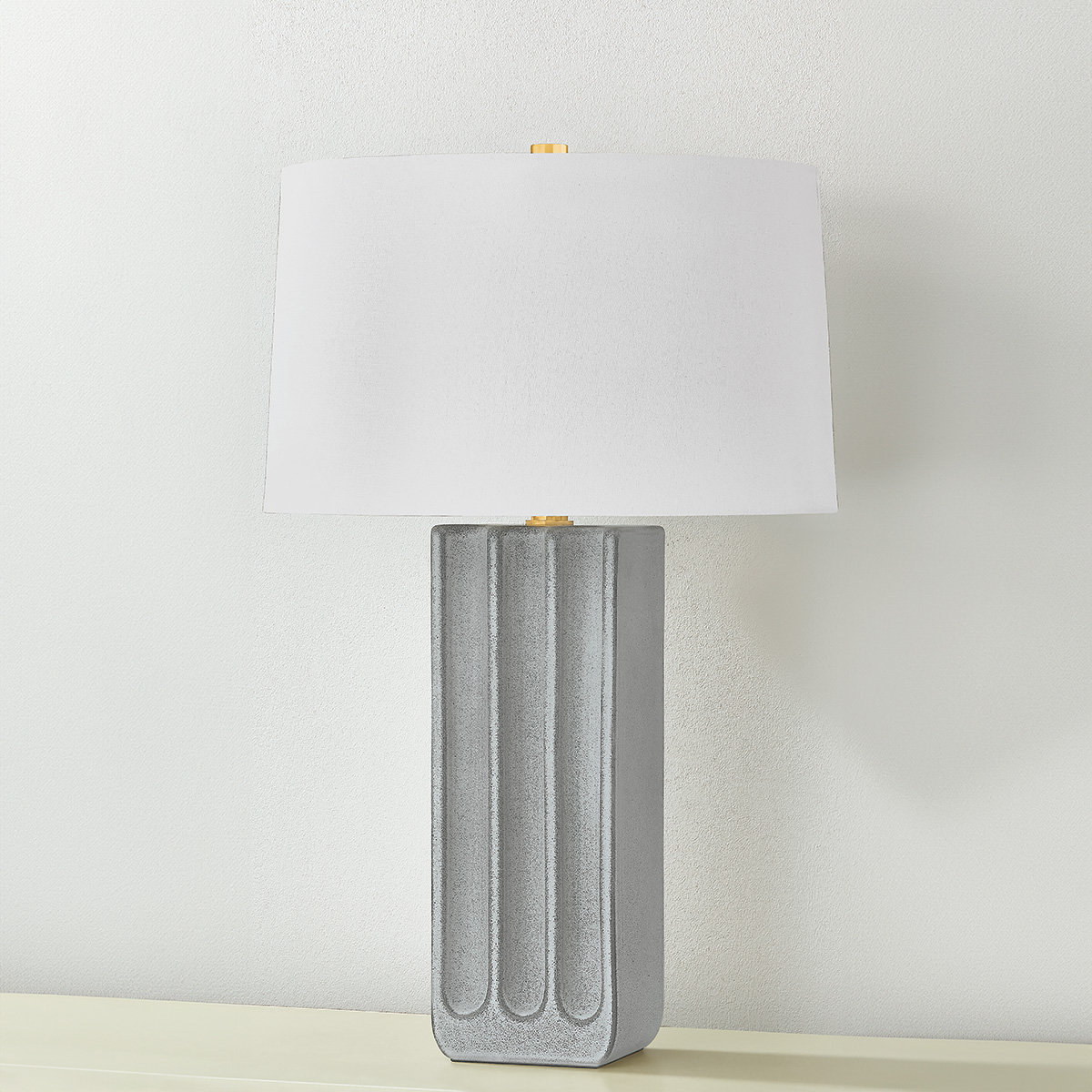 Referencing ancient Greek and Roman architecture, this modern table lamp features a distinctive scallop at the bottom and open flutes at the top. The reactive glaze accentuates the contrast as light washes over the smooth surface. A large linen drum shade balances the silhouette's proportions. Aged Brass metalwork glimmers at the neck and finial, completing the classical aesthetics of Elmer.